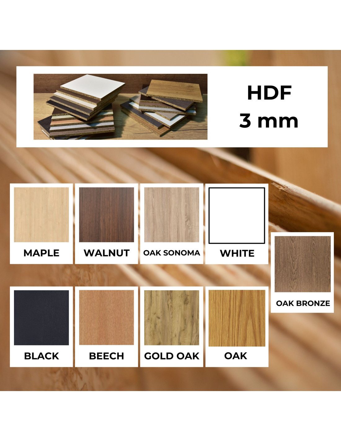 • Sklejka ma grubość 5 mm / HDF ma grubość 3 mm.