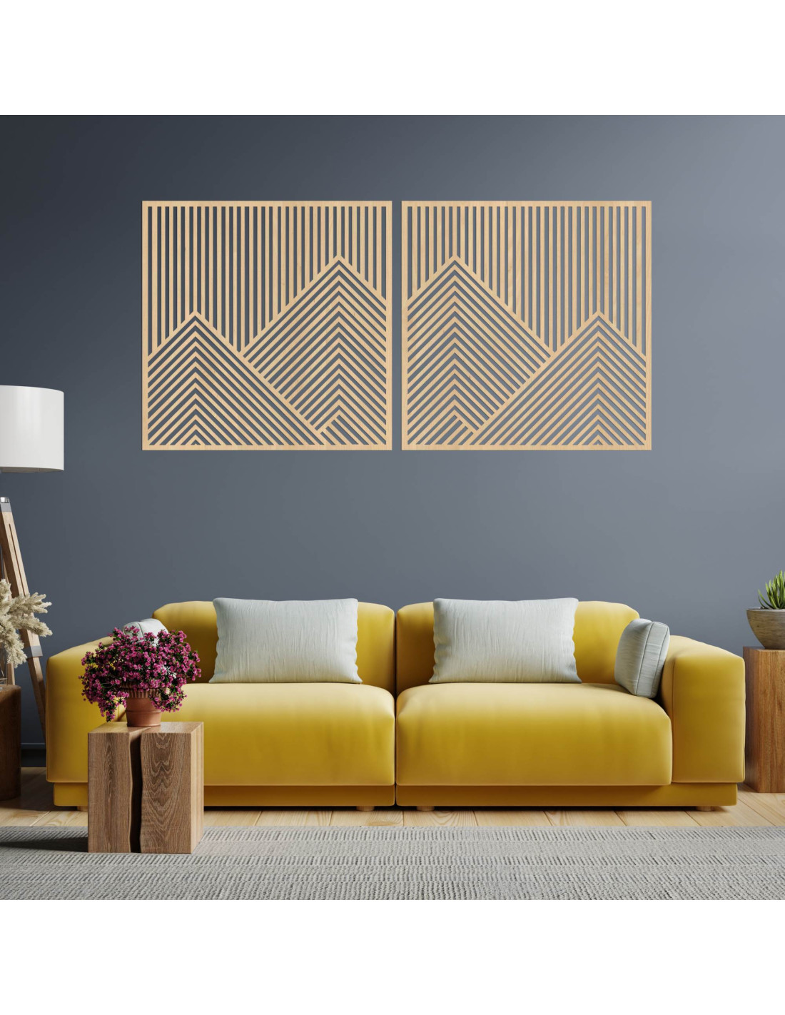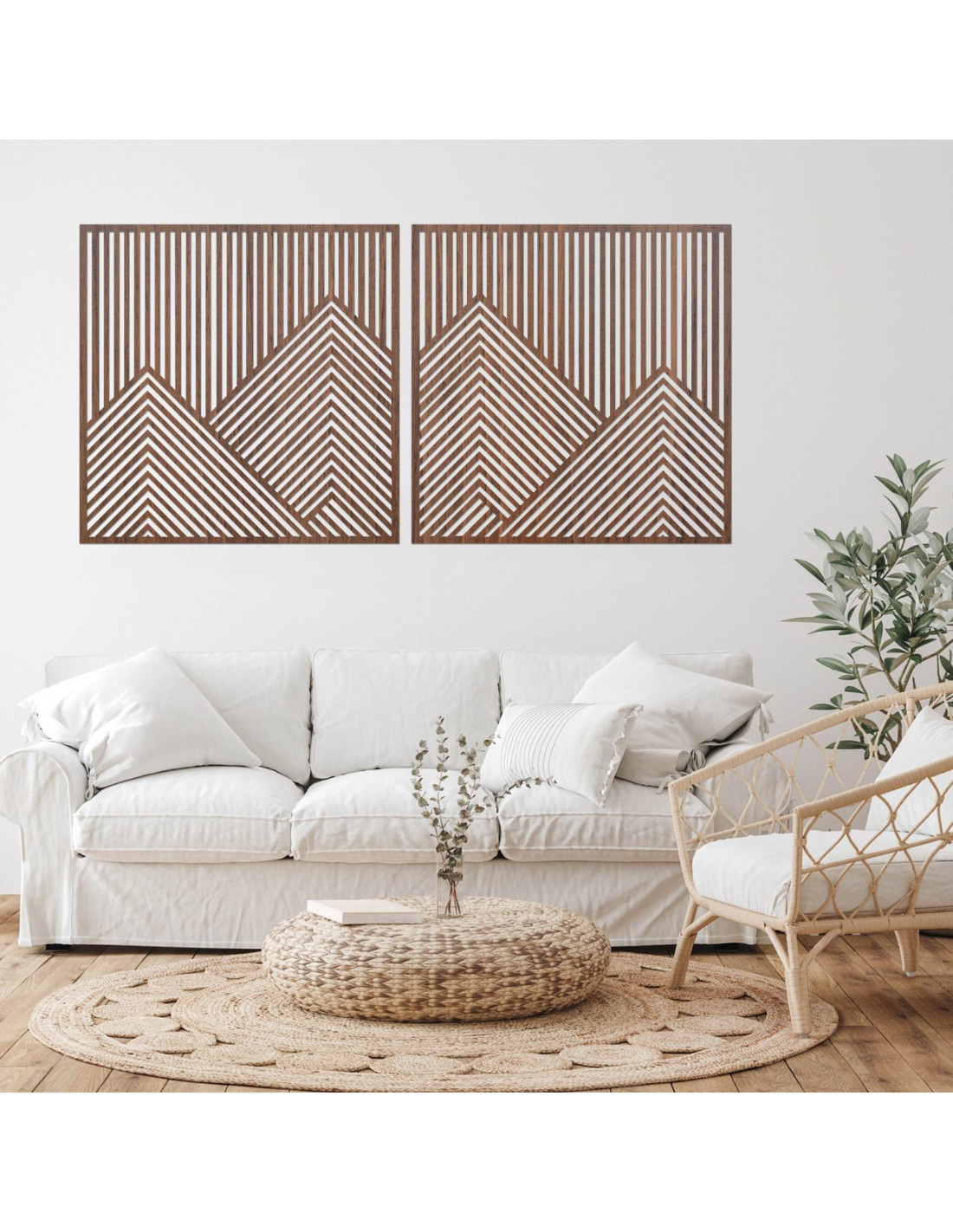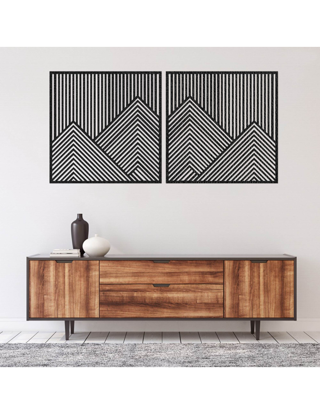 Drewniana dekoracja ścienna z geometrycznymi liniami górskimi - zestaw 2 sztuk