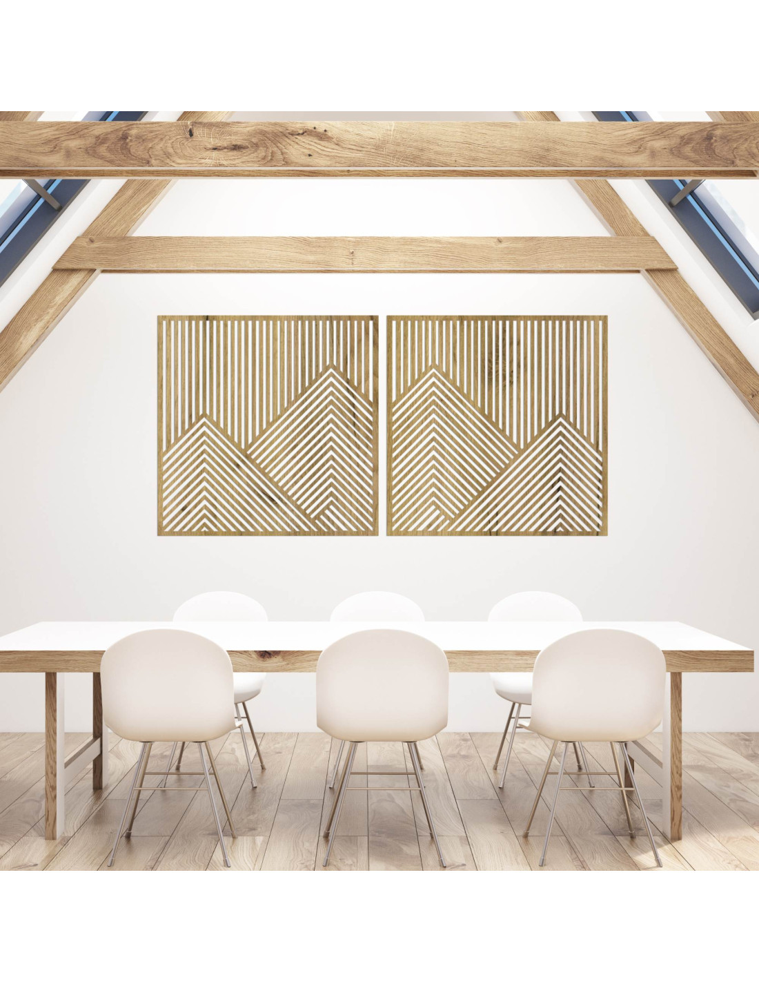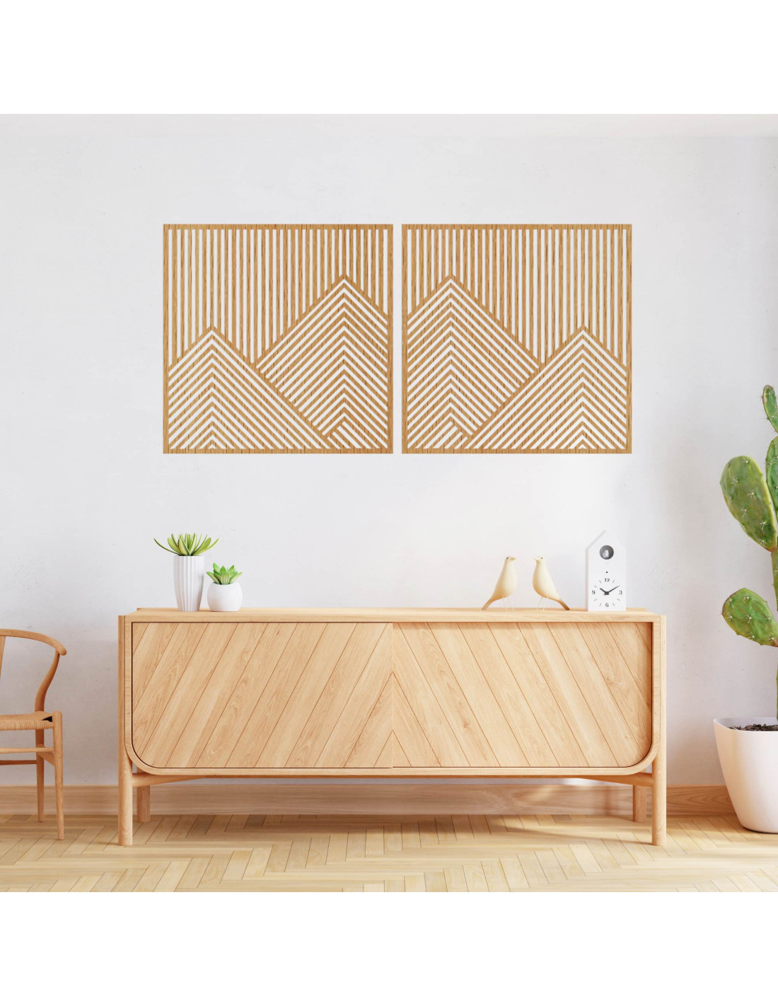Drewniana dekoracja ścienna z geometrycznymi liniami górskimi - zestaw 2 sztuk