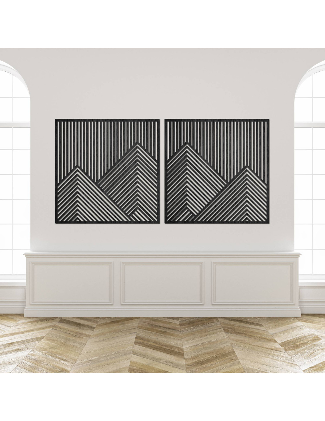 Ten ekskluzywny, dwuczęściowy zestaw dekoracji ściennych przedstawia majestatyczne szczyty górskie, wykonane przy użyciu precyzyjnej techniki lamelowej.