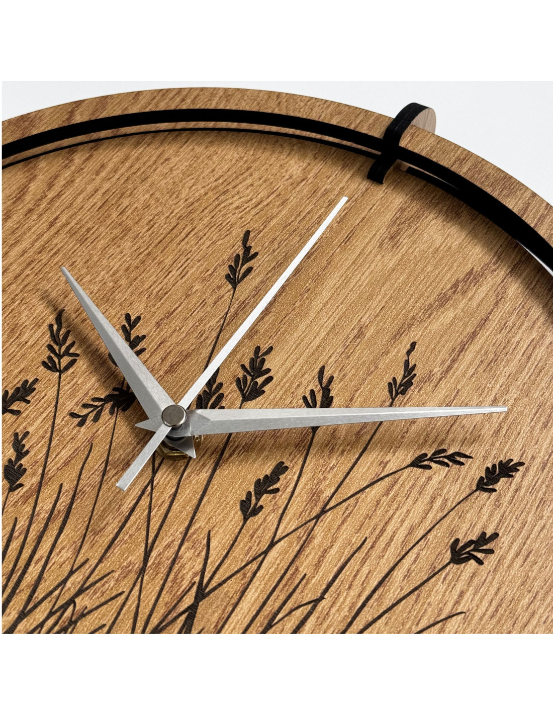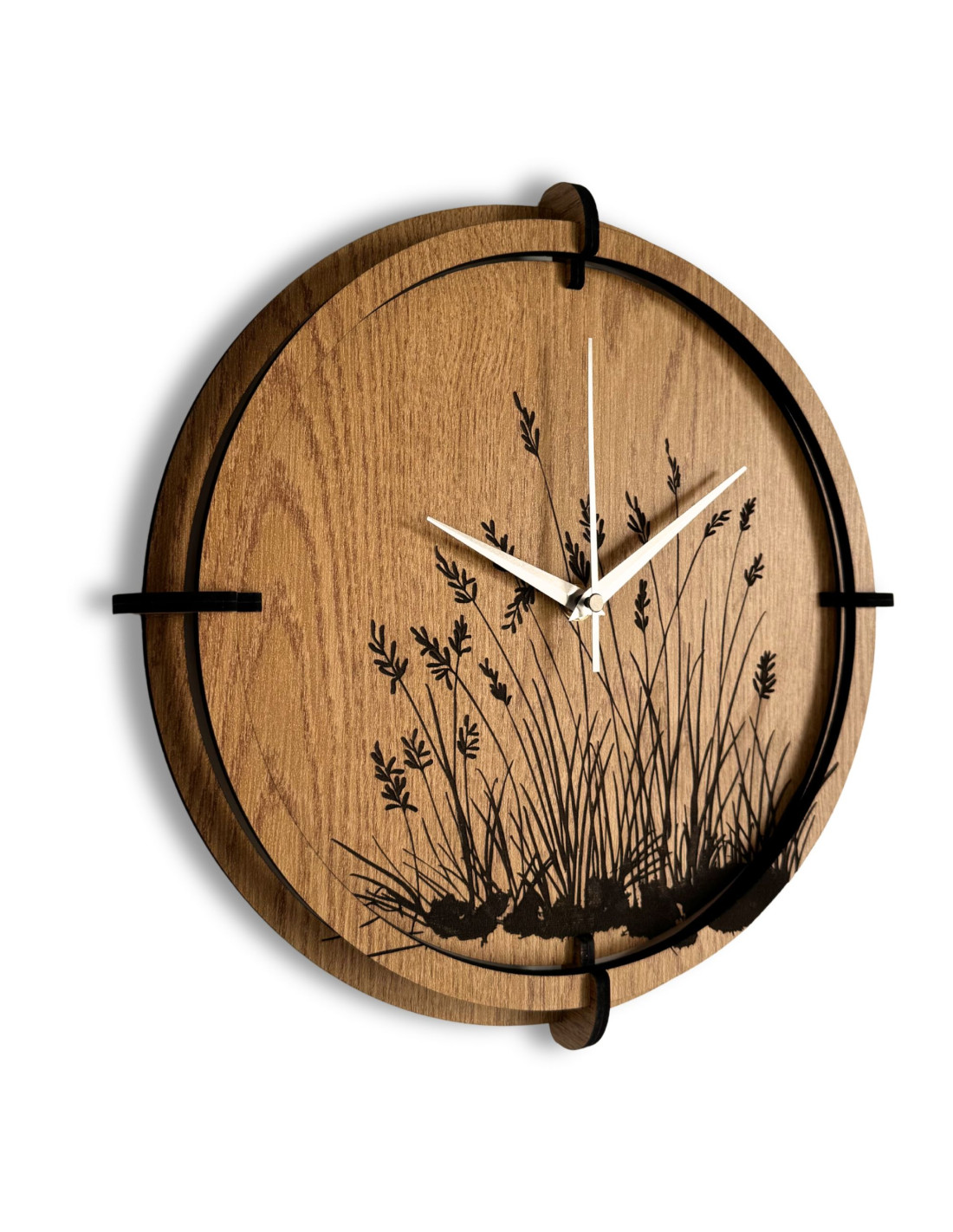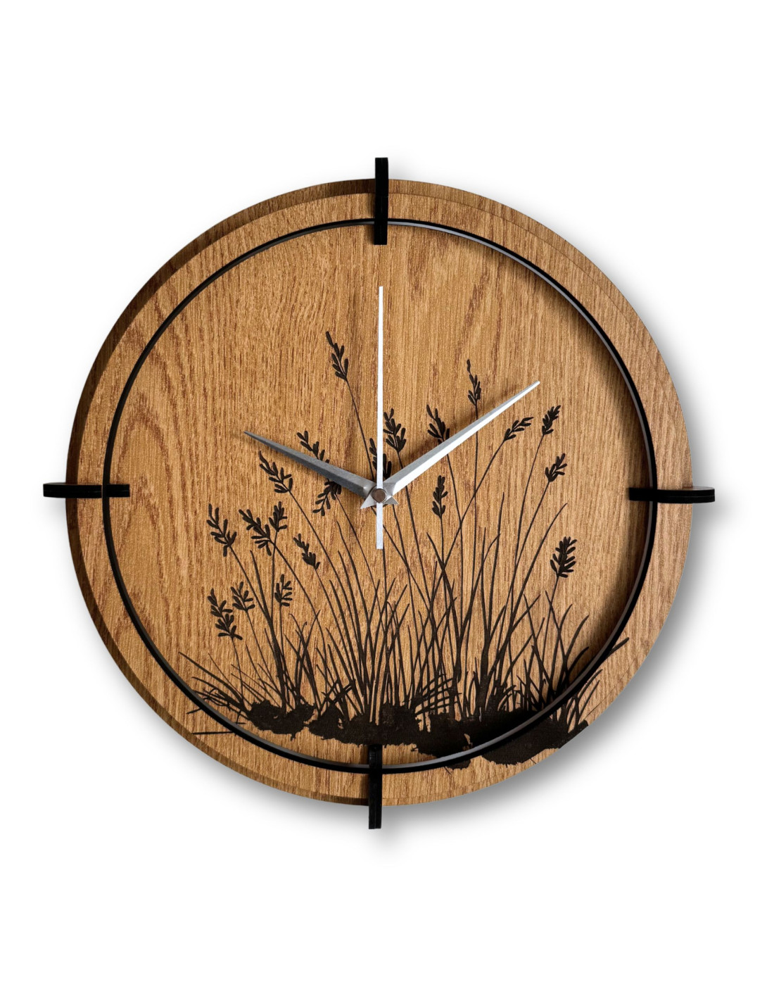 Drewniany zegar ścienny z wygrawerowanym motywem trawy łąkowej .