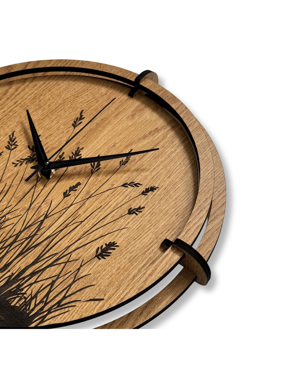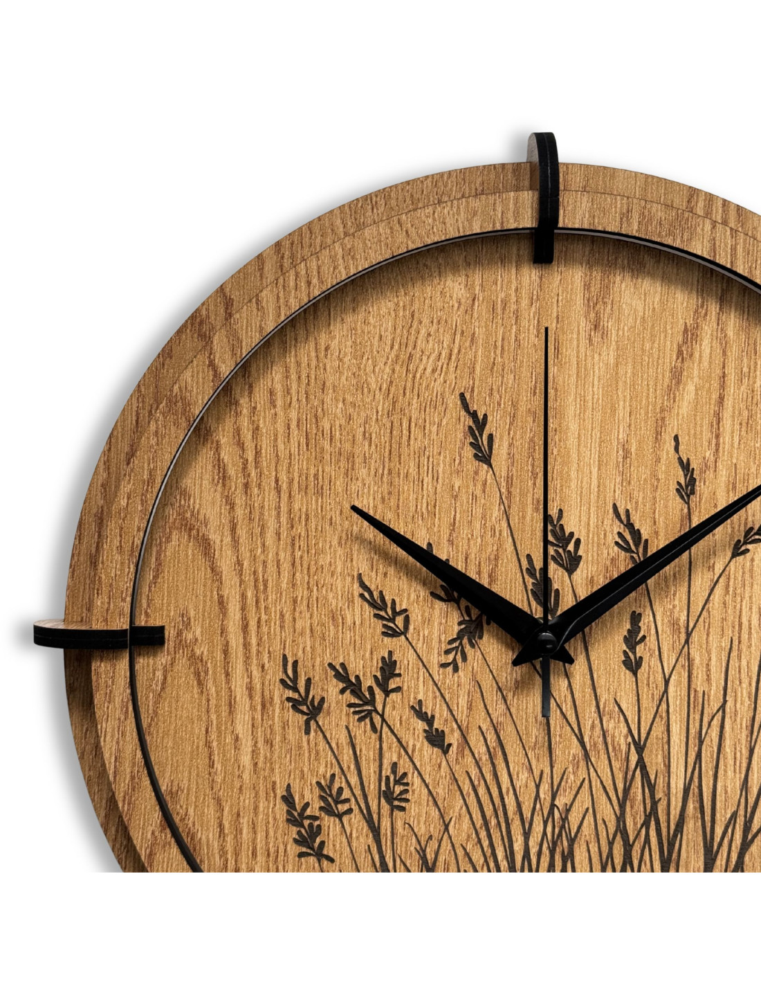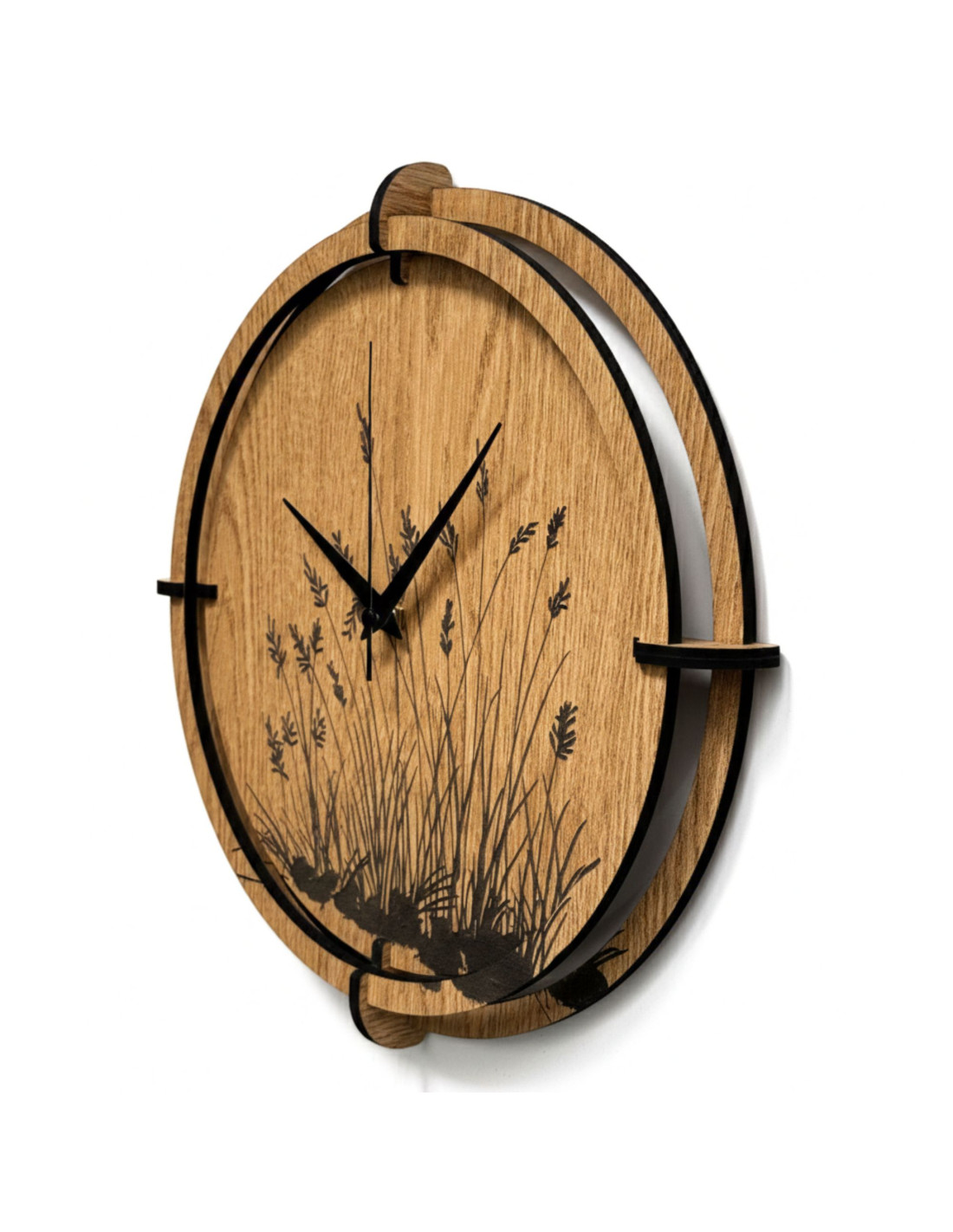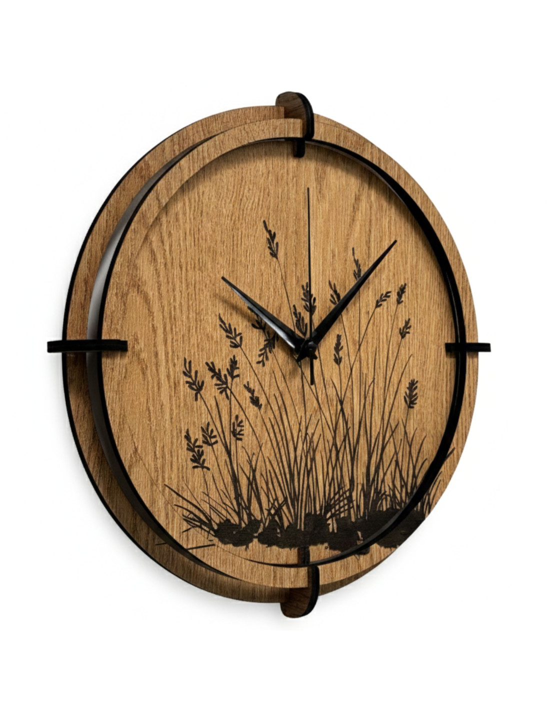Drewniany zegar ścienny z wygrawerowanym motywem trawy łąkowej .