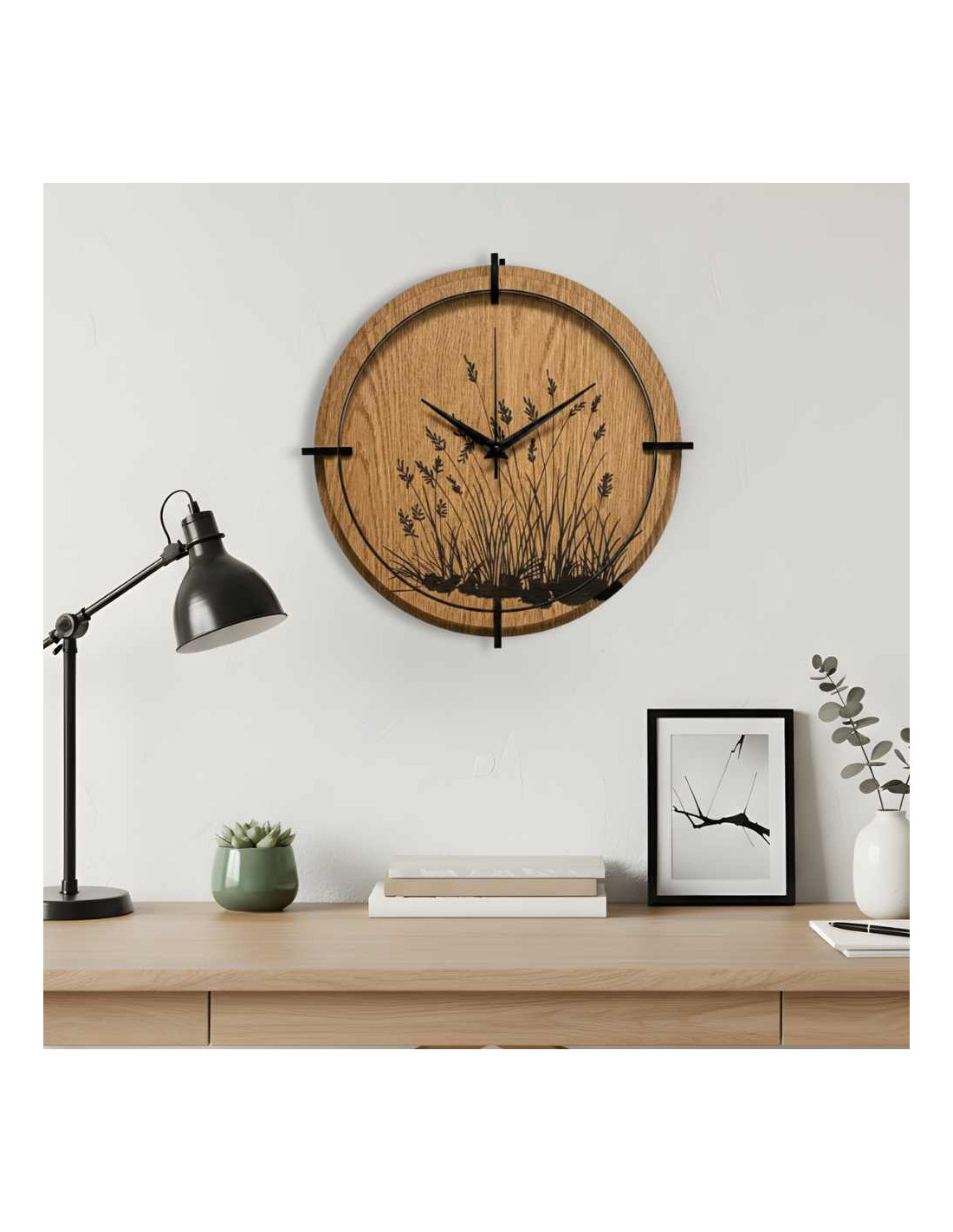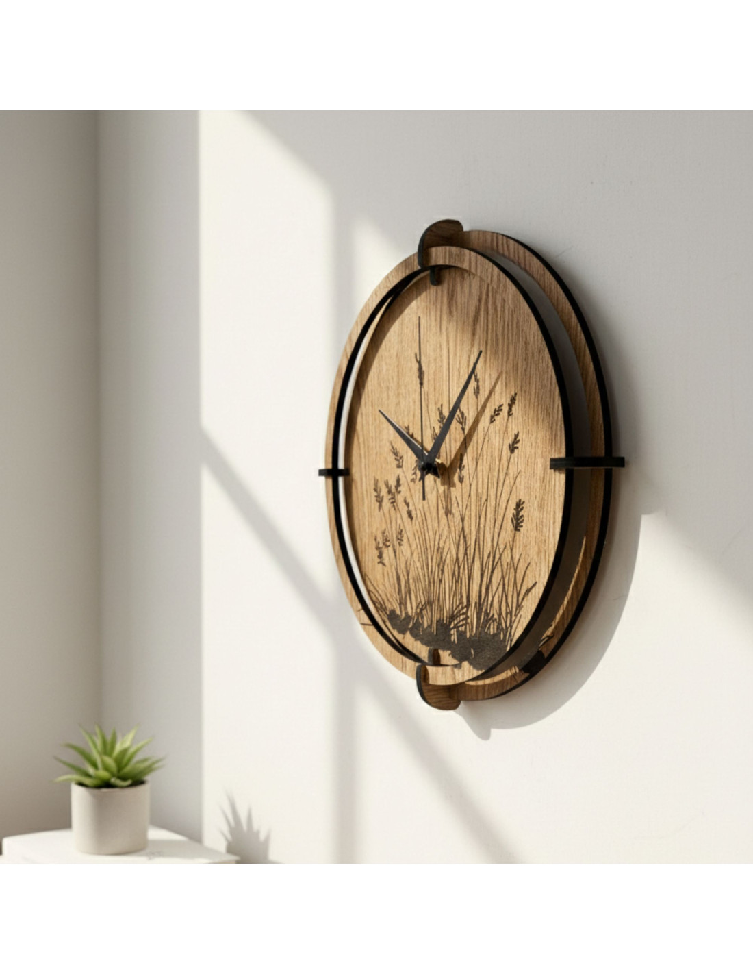 Drewniany zegar ścienny z eleganckim motywem trawy łąkowej