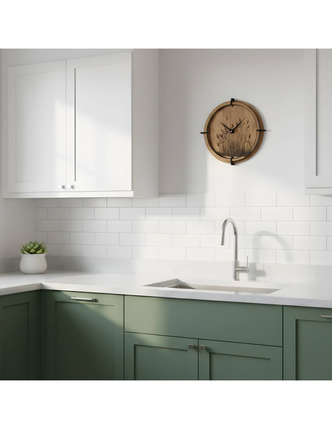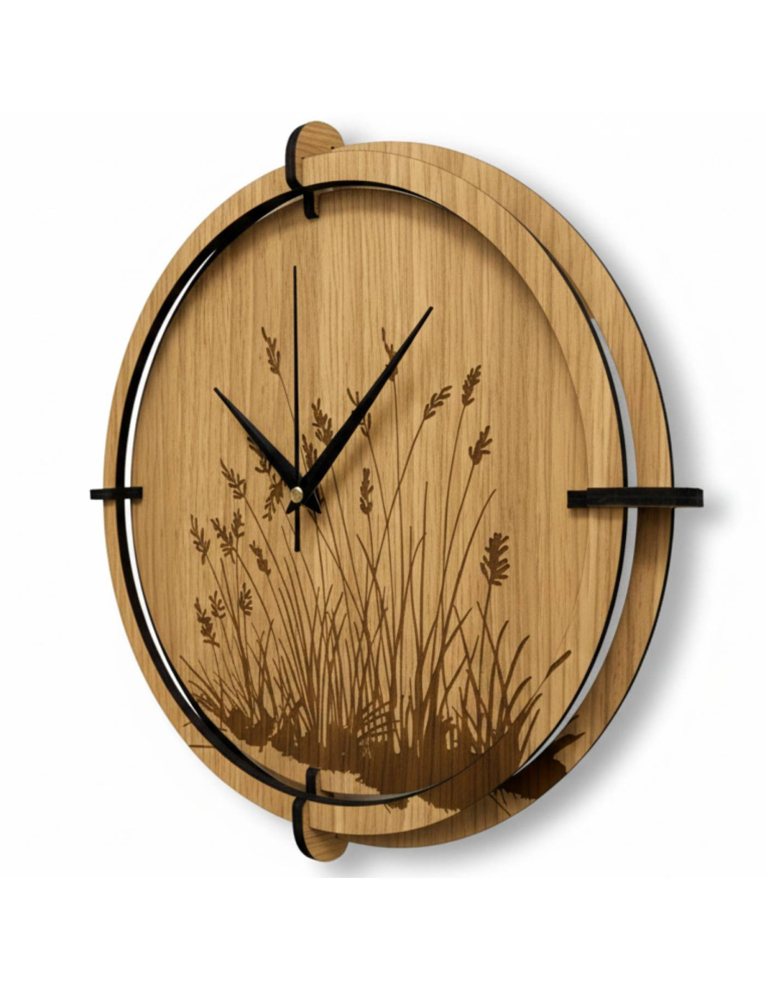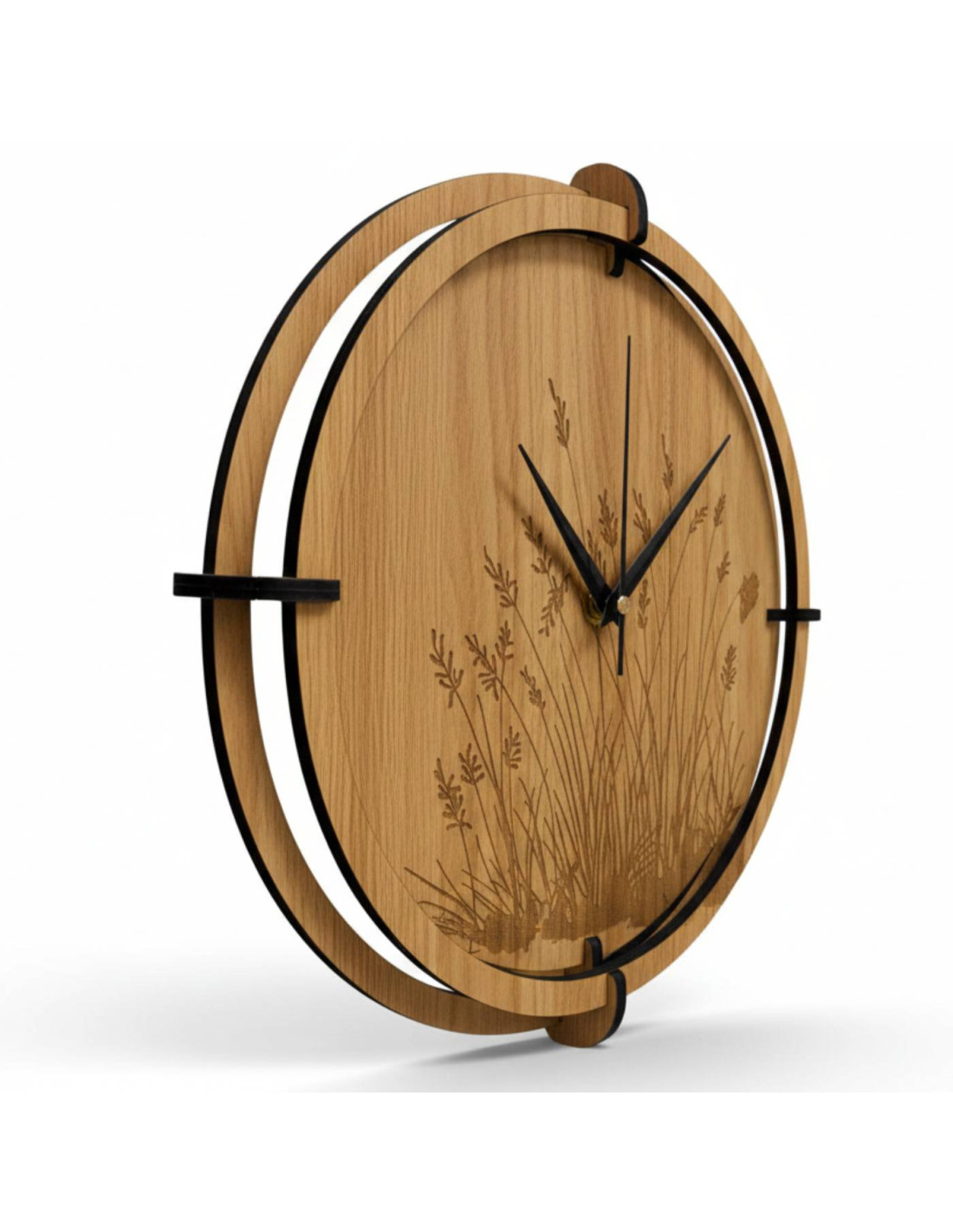 Drewniany zegar ścienny z eleganckim motywem trawy łąkowej