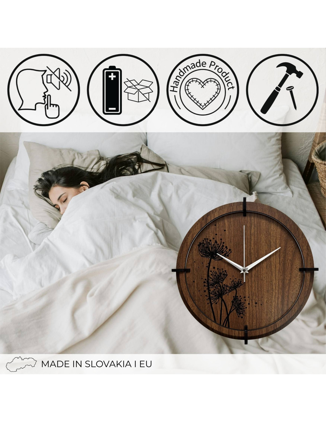Grawerowany motyw kwiatowy z finezyjnymi detalami wygląda nowocześnie i harmonijnie, natomiast czarne, srebrne wskazówki i drewniany okrąg podkreślają designerski wygląd.