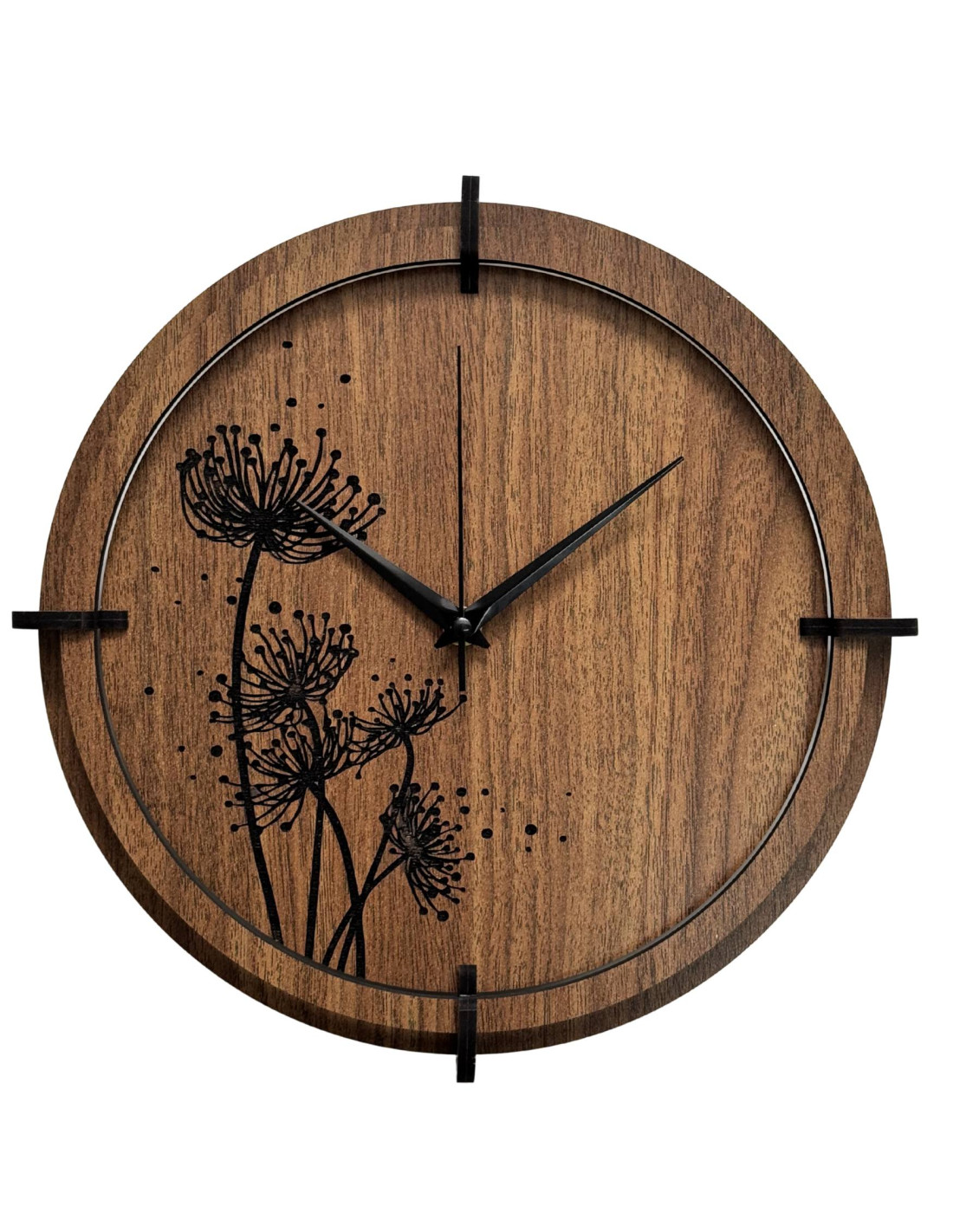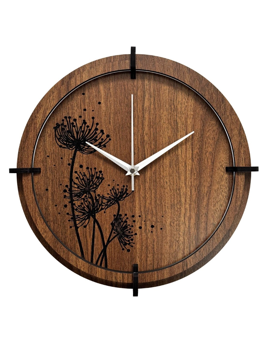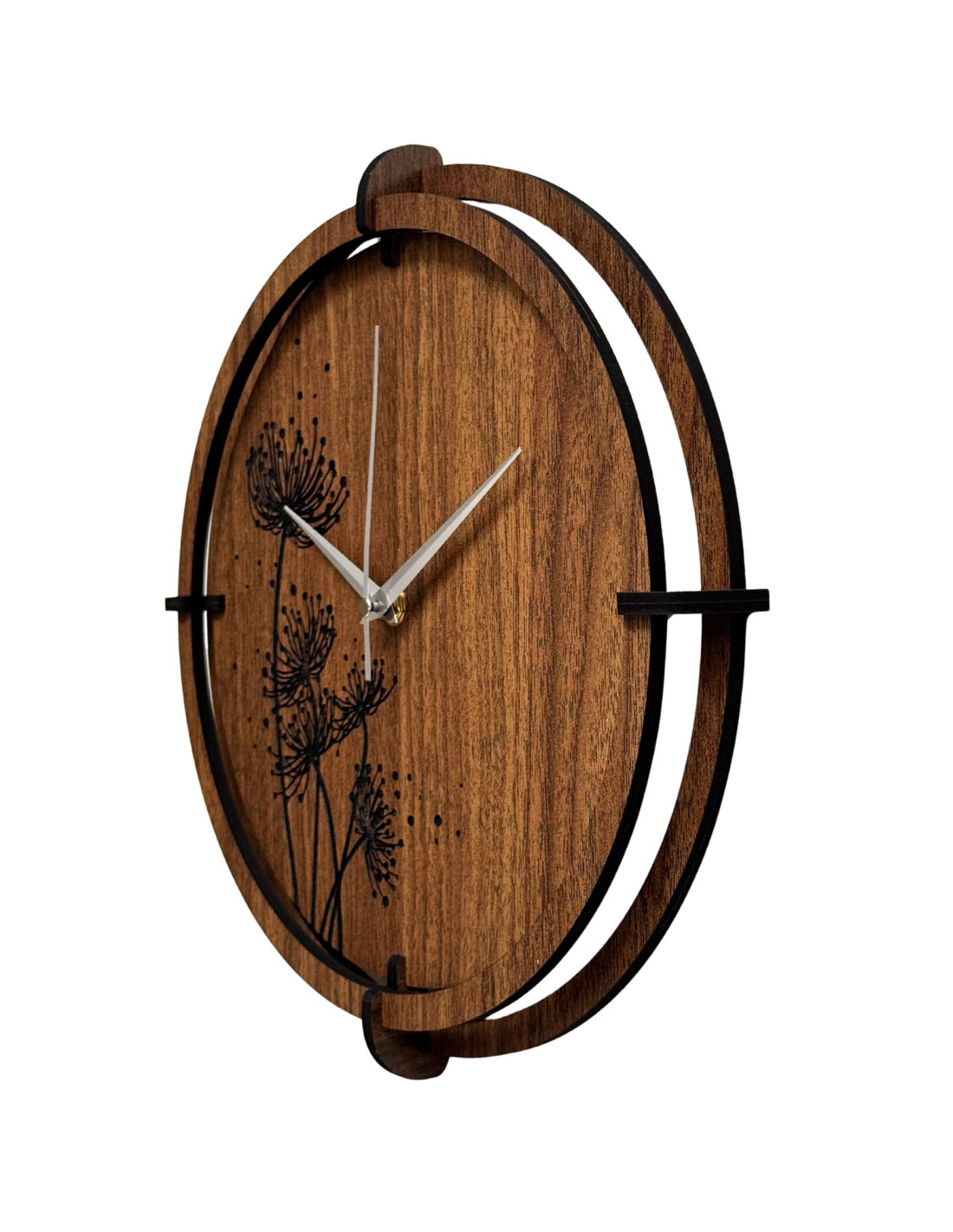 Nowoczesny drewniany zegar ścienny w kolorze Wenge z precyzyjnie wygrawerowanym motywem kwiatowym wnosi do wnętrza elegancję i naturalny charakter .