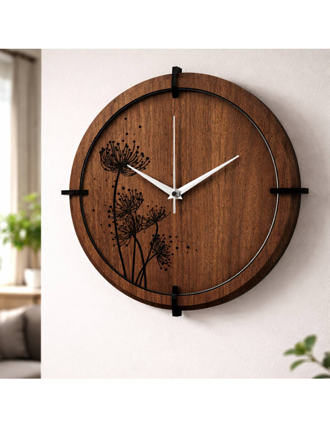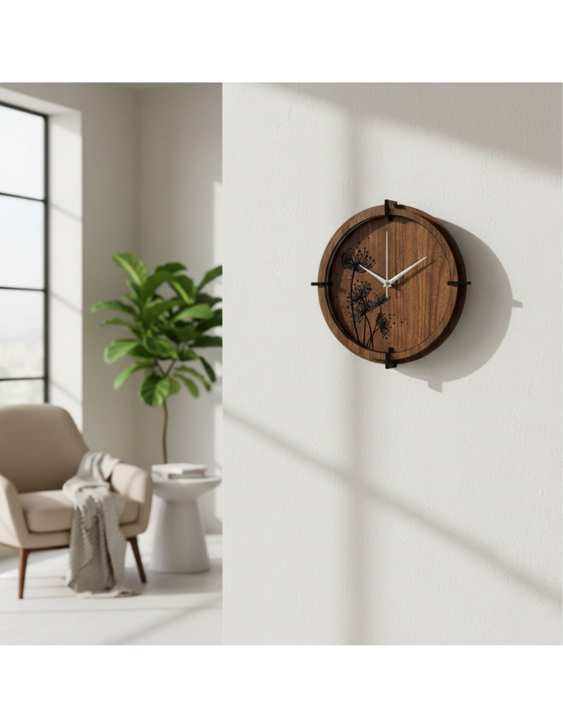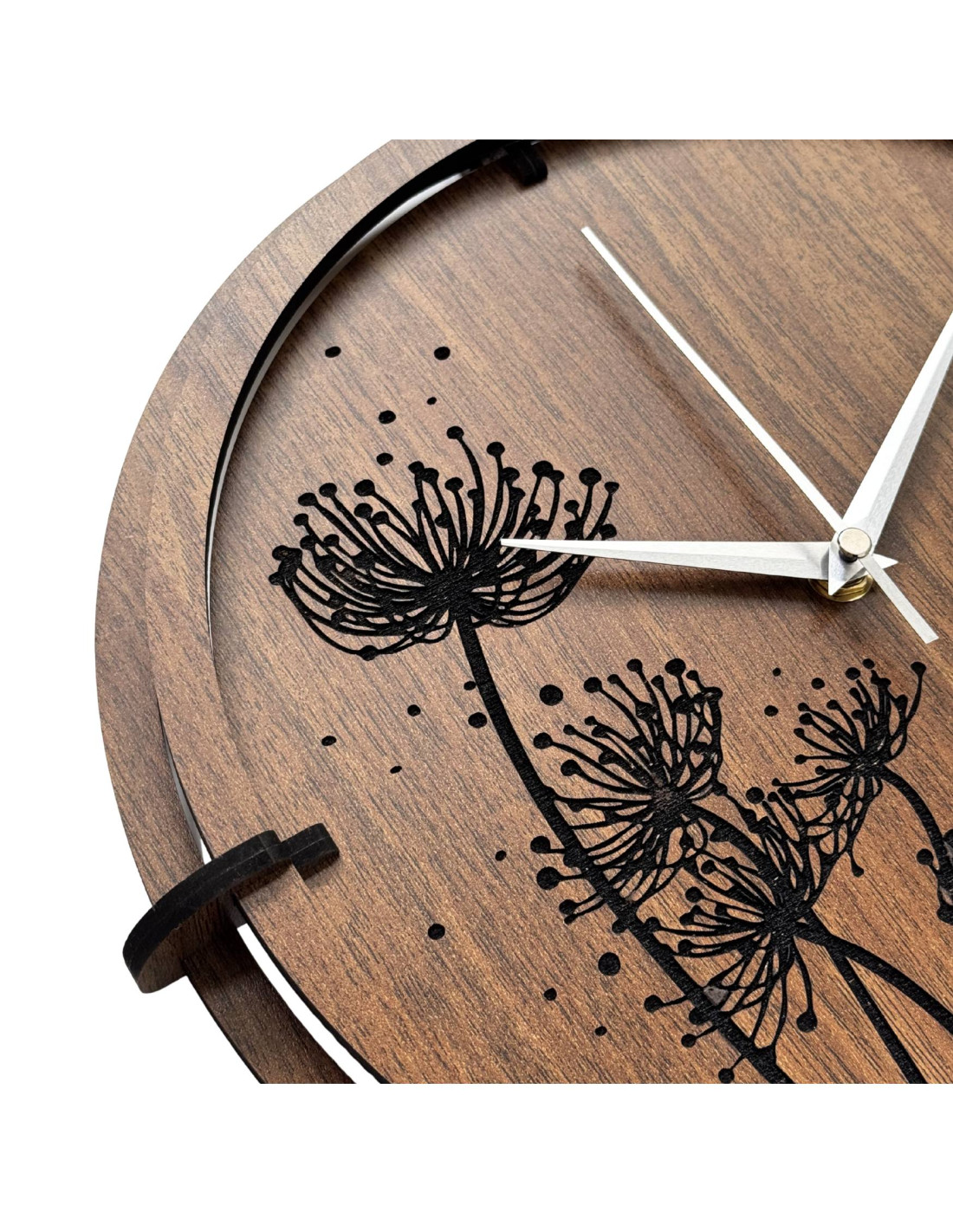 Nowoczesny drewniany zegar ścienny w kolorze Wenge z precyzyjnie wygrawerowanym motywem kwiatowym wnosi do wnętrza elegancję i naturalny charakter .