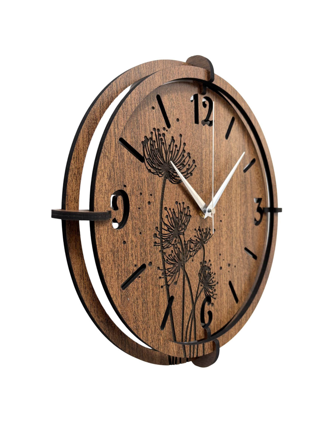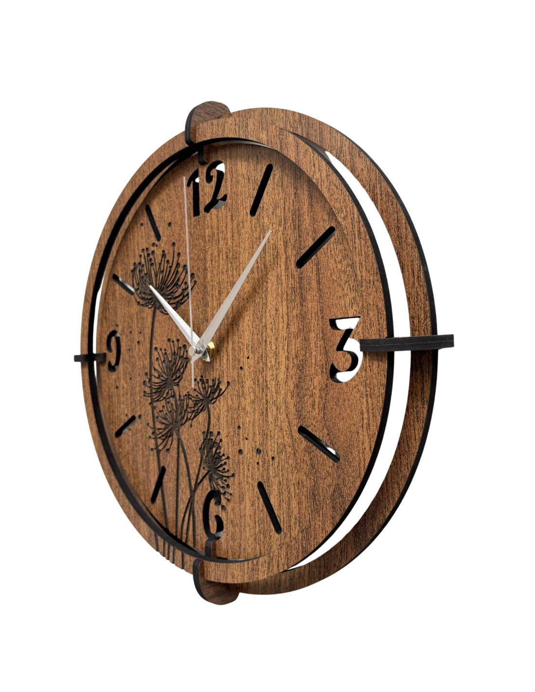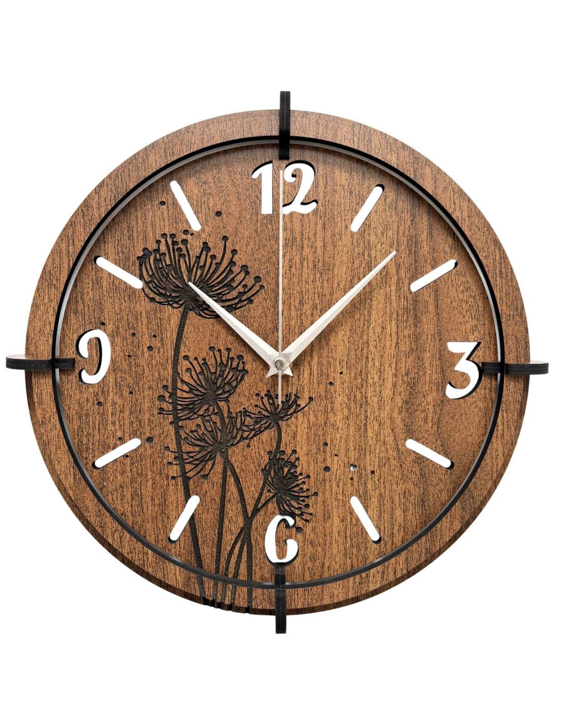 Wykonany z wysokiej jakości płyty HDF (wenge/orzech) z precyzyjnie rzeźbioną tarczą i stylowymi wskazówkami.