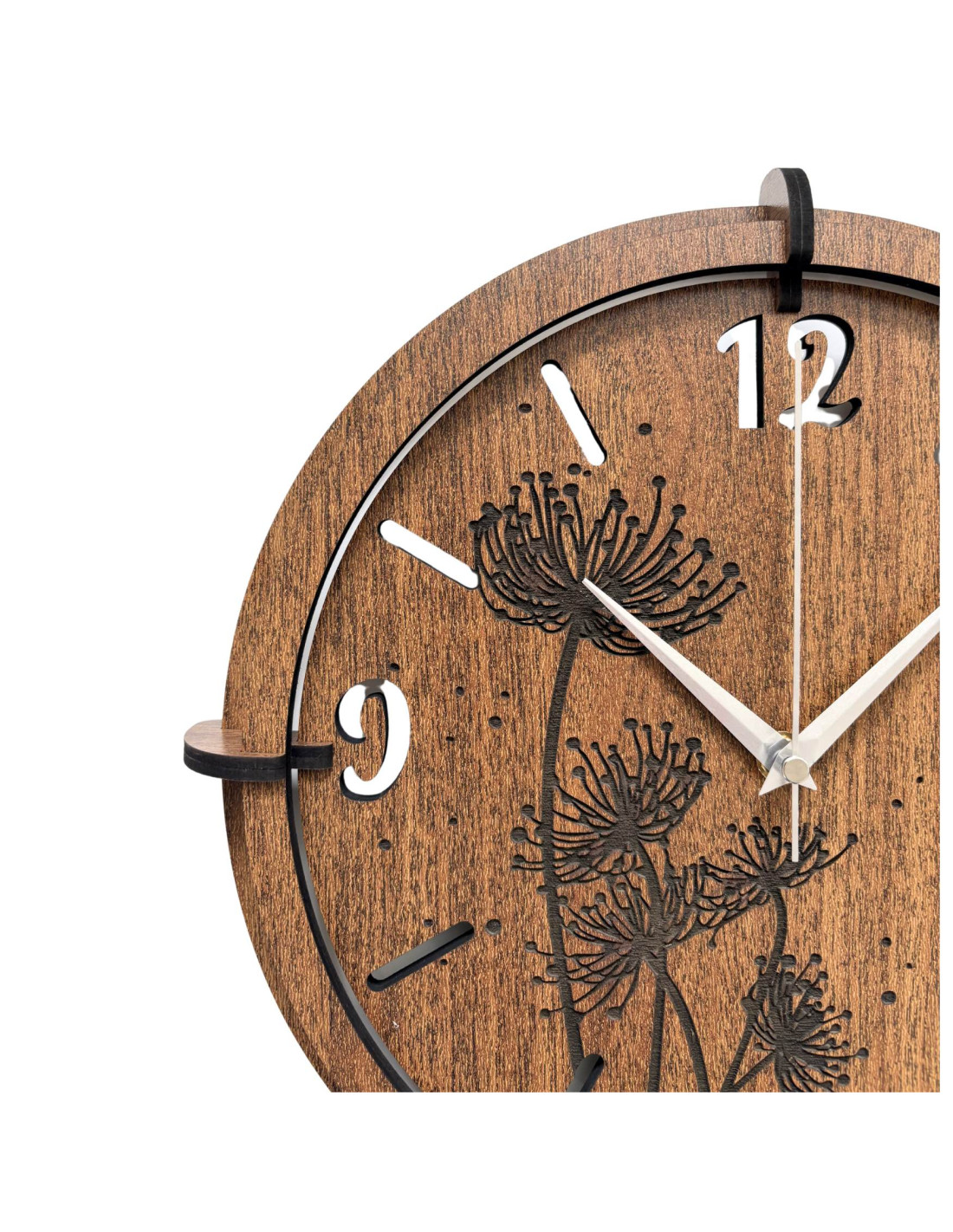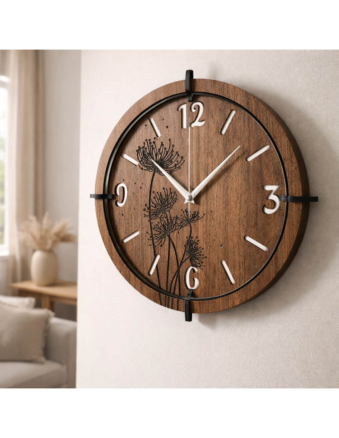 Nowoczesne drewniane zegary ścienne z motywem mleczy i traw łąkowych wprowadzą do wnętrza spokój i harmonię .