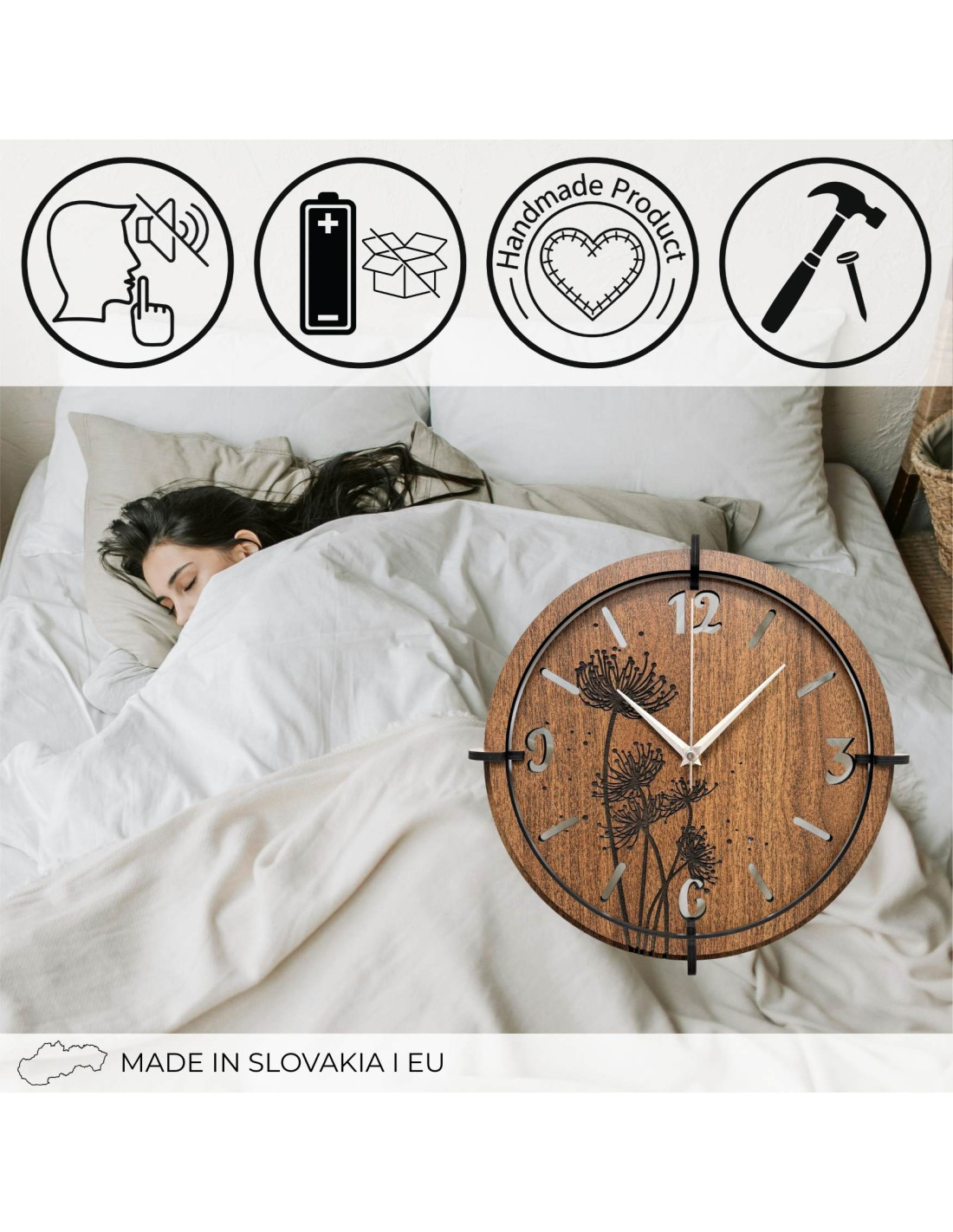- Cicha praca - mechanizm pozbawiony niepokojącego tykania zapewni Ci spokój ducha podczas odpoczynku i pracy.