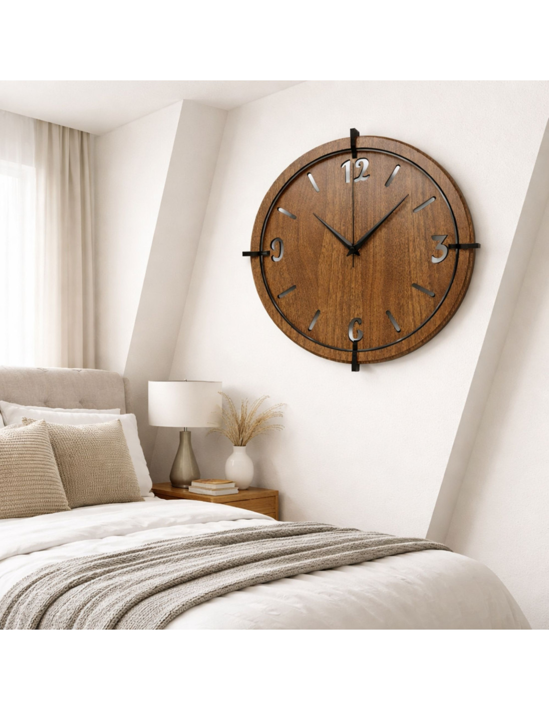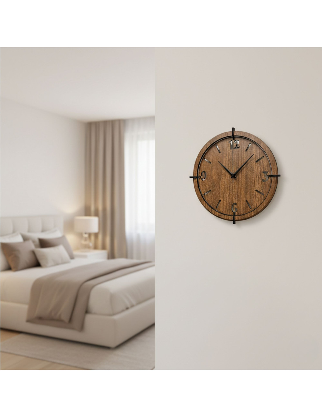 Elegancki zegar ścienny z drewna orzechowego z wyrazistymi cyframi do nowoczesnego wnętrza