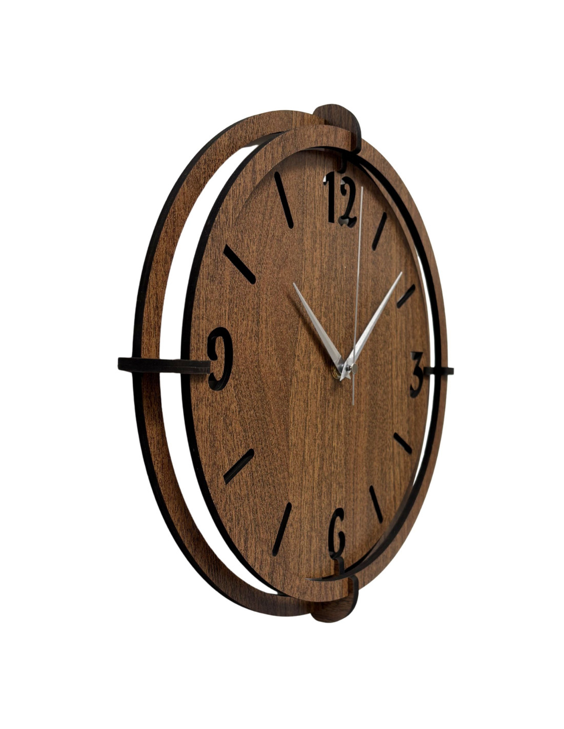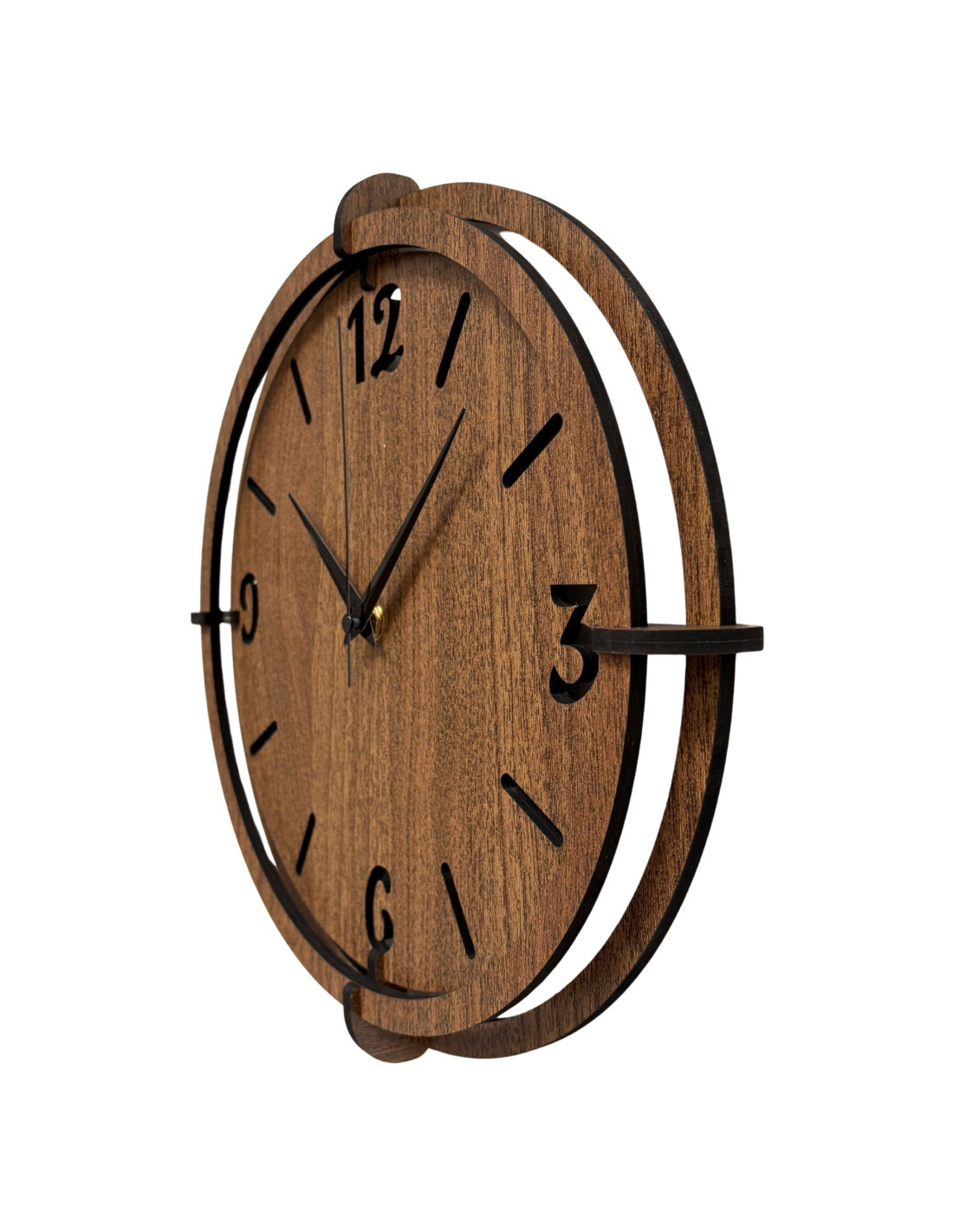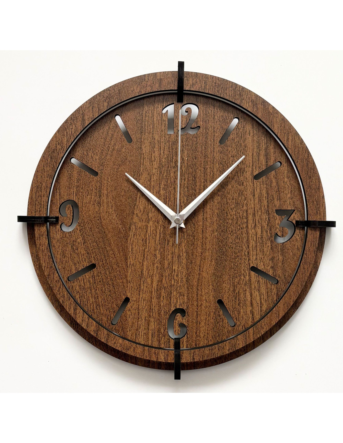 Elegancki zegar ścienny wykonany z drewna orzechowego z wyrazistymi cyframi na tarczy doda Twojemu wnętrzu odrobinę stylu i ciepłego, naturalnego wyglądu .