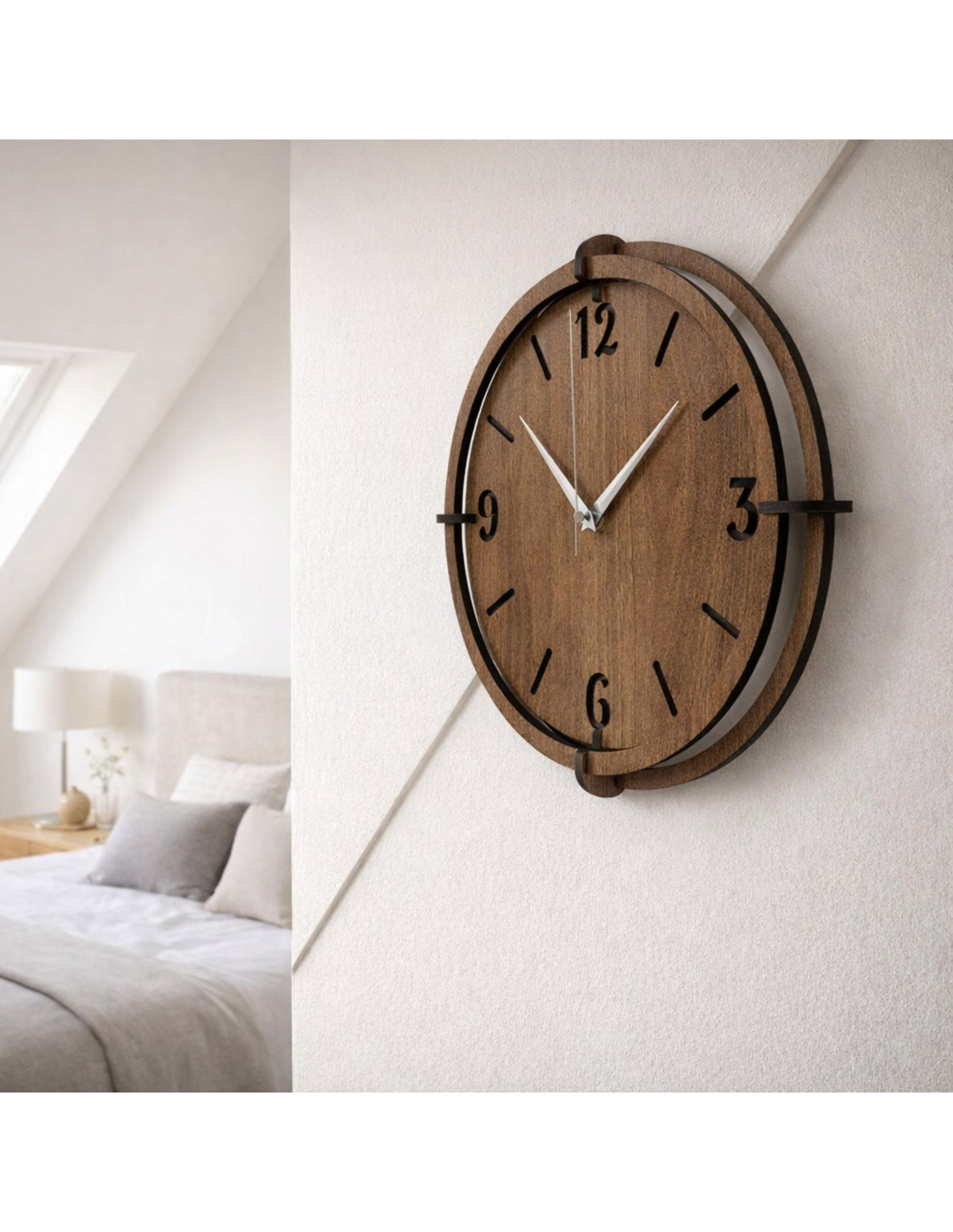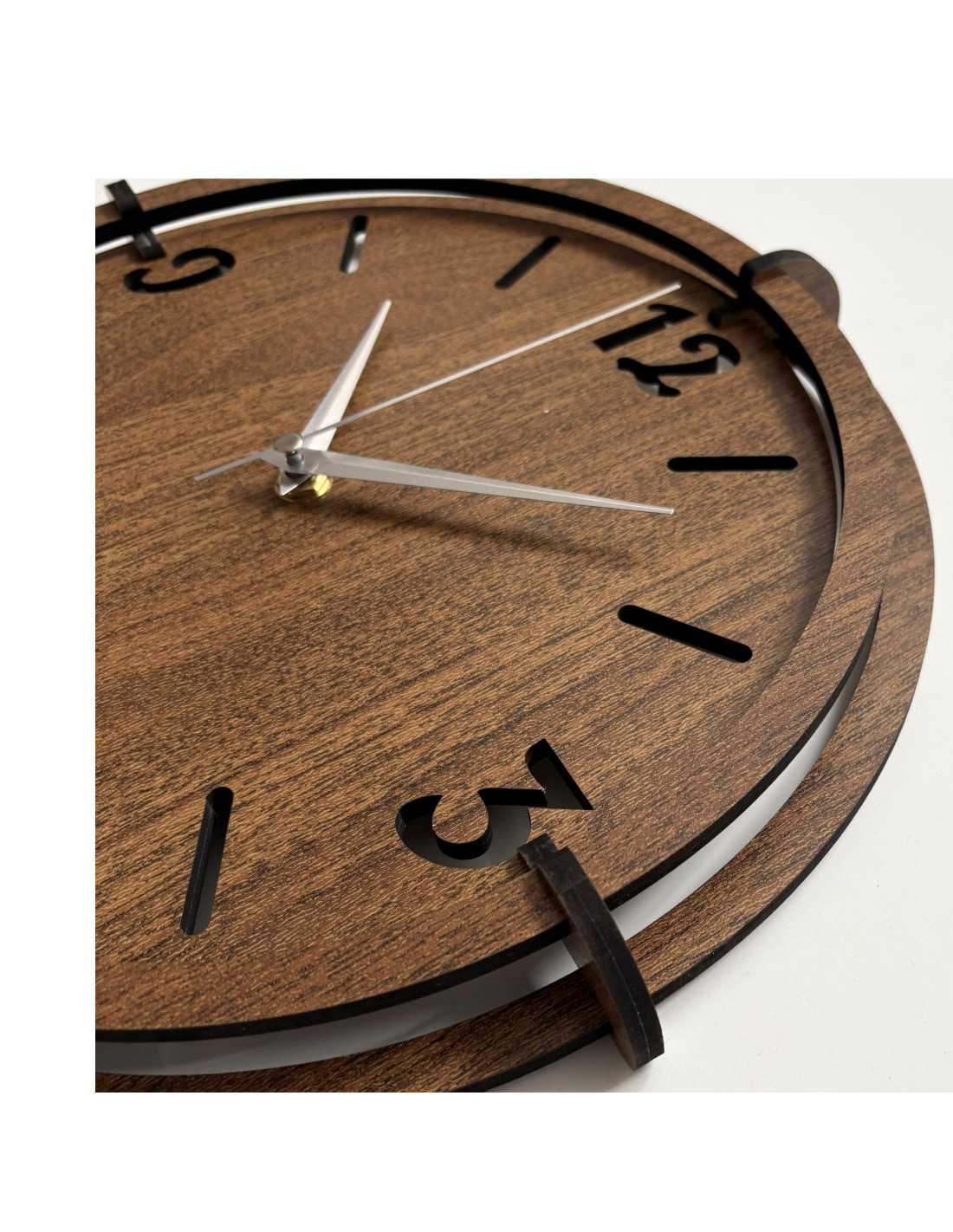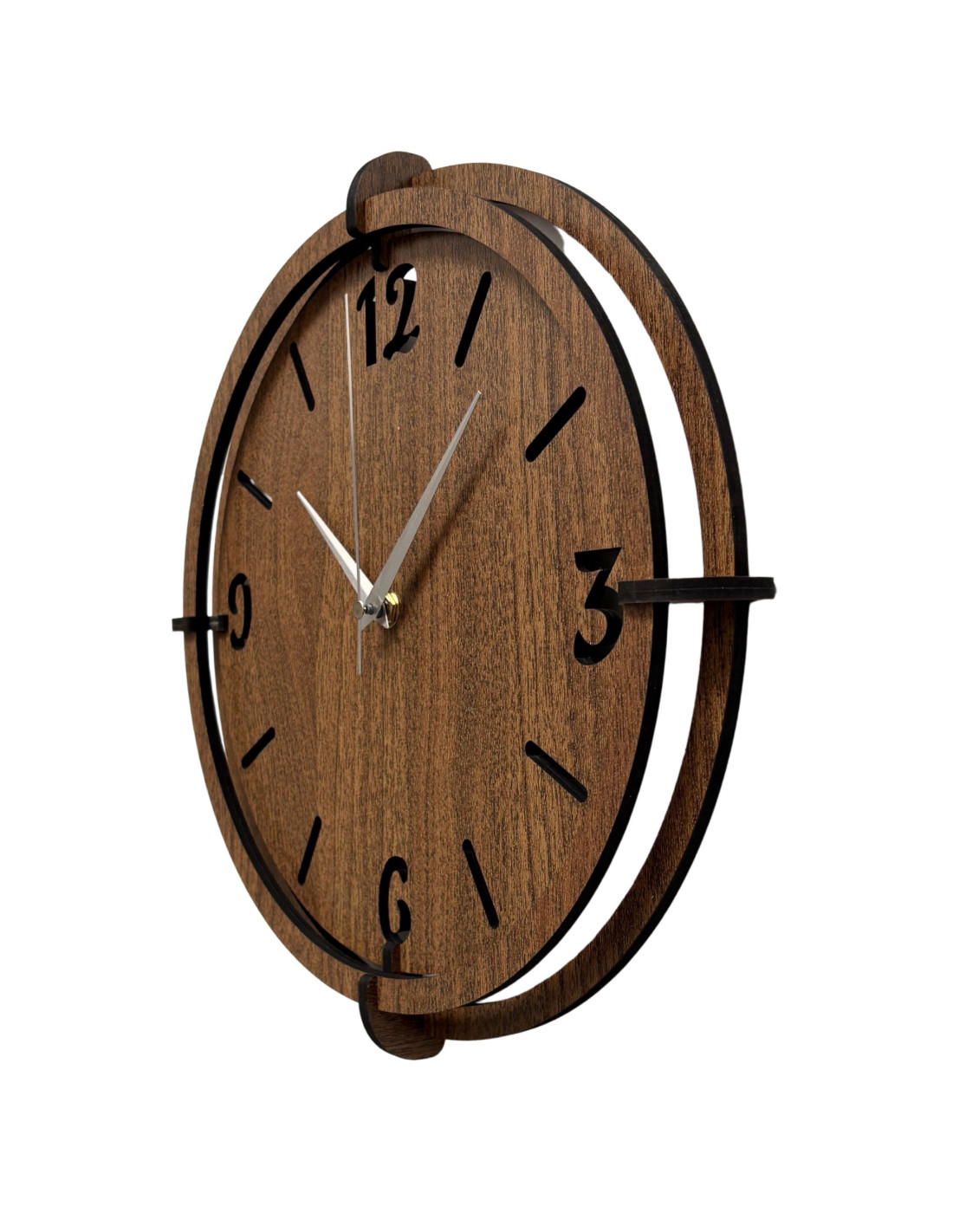 Elegancki zegar ścienny wykonany z drewna orzechowego z wyrazistymi cyframi na tarczy doda Twojemu wnętrzu odrobinę stylu i ciepłego, naturalnego wyglądu .