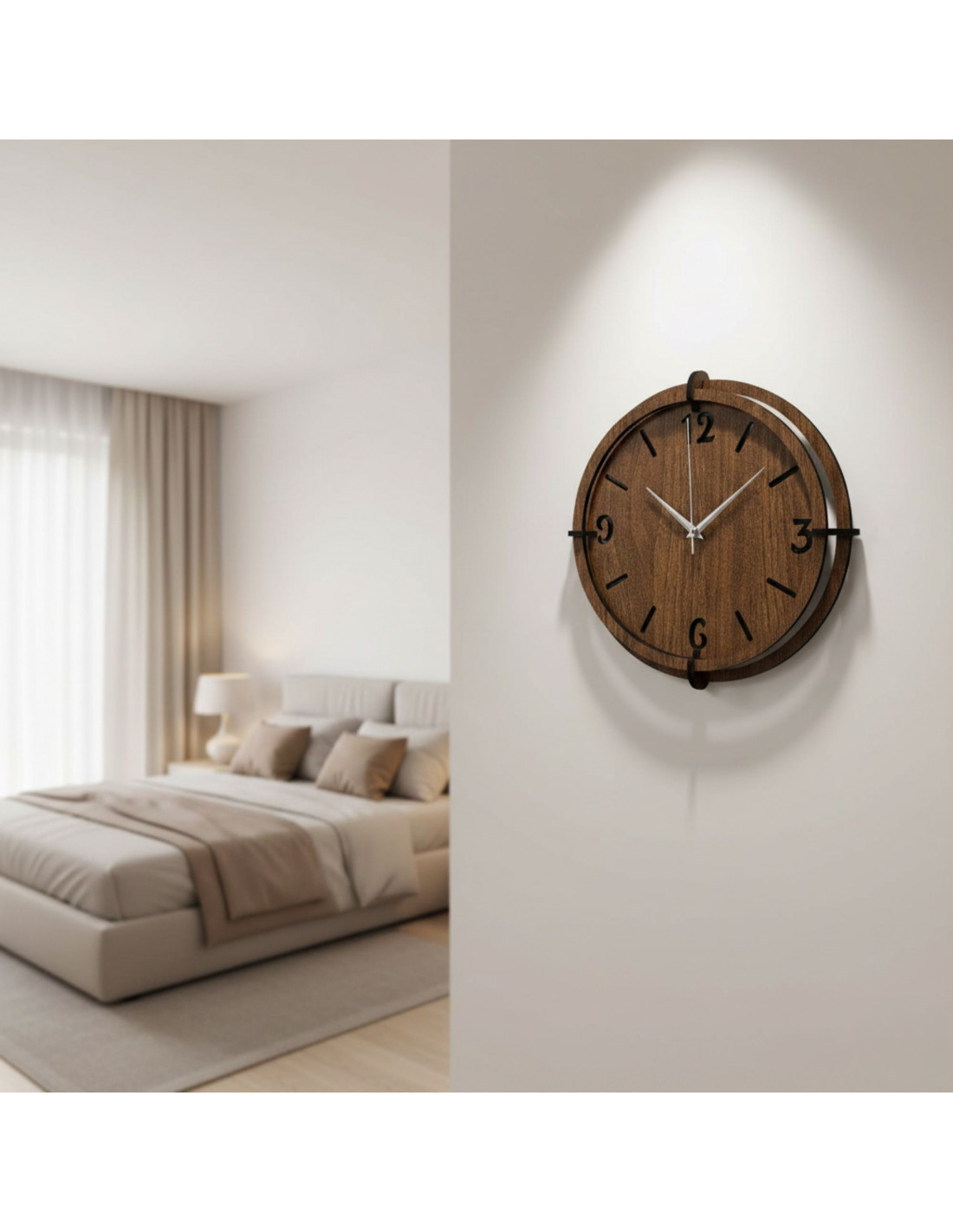 Elegancki zegar ścienny z drewna orzechowego z wyrazistymi cyframi do nowoczesnego wnętrza