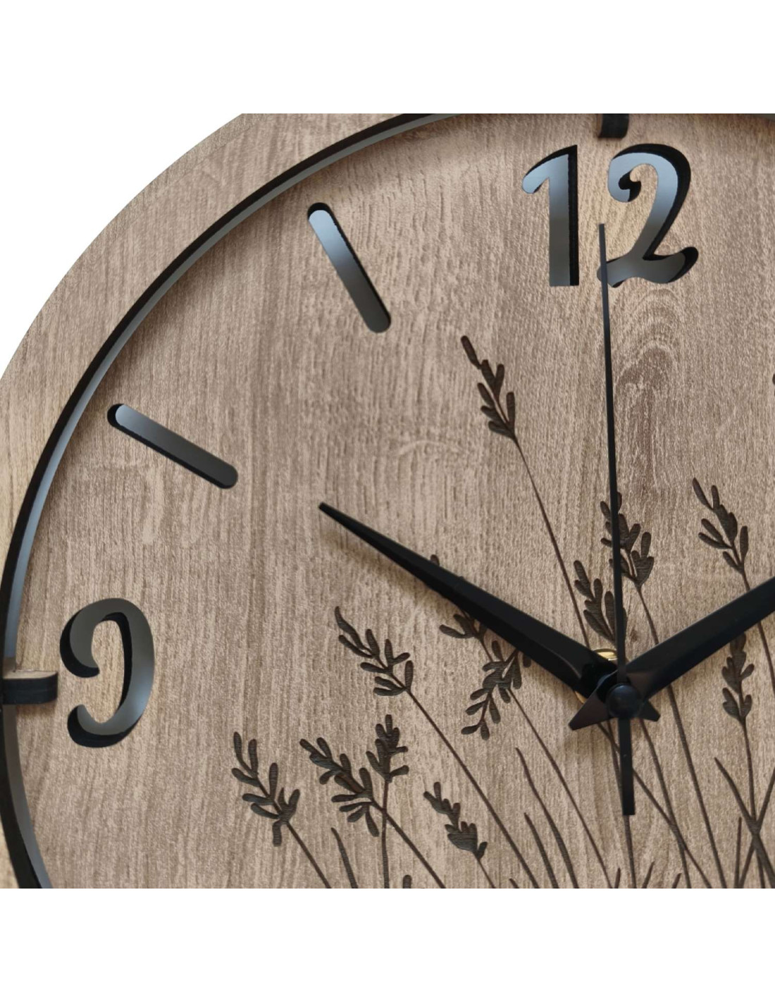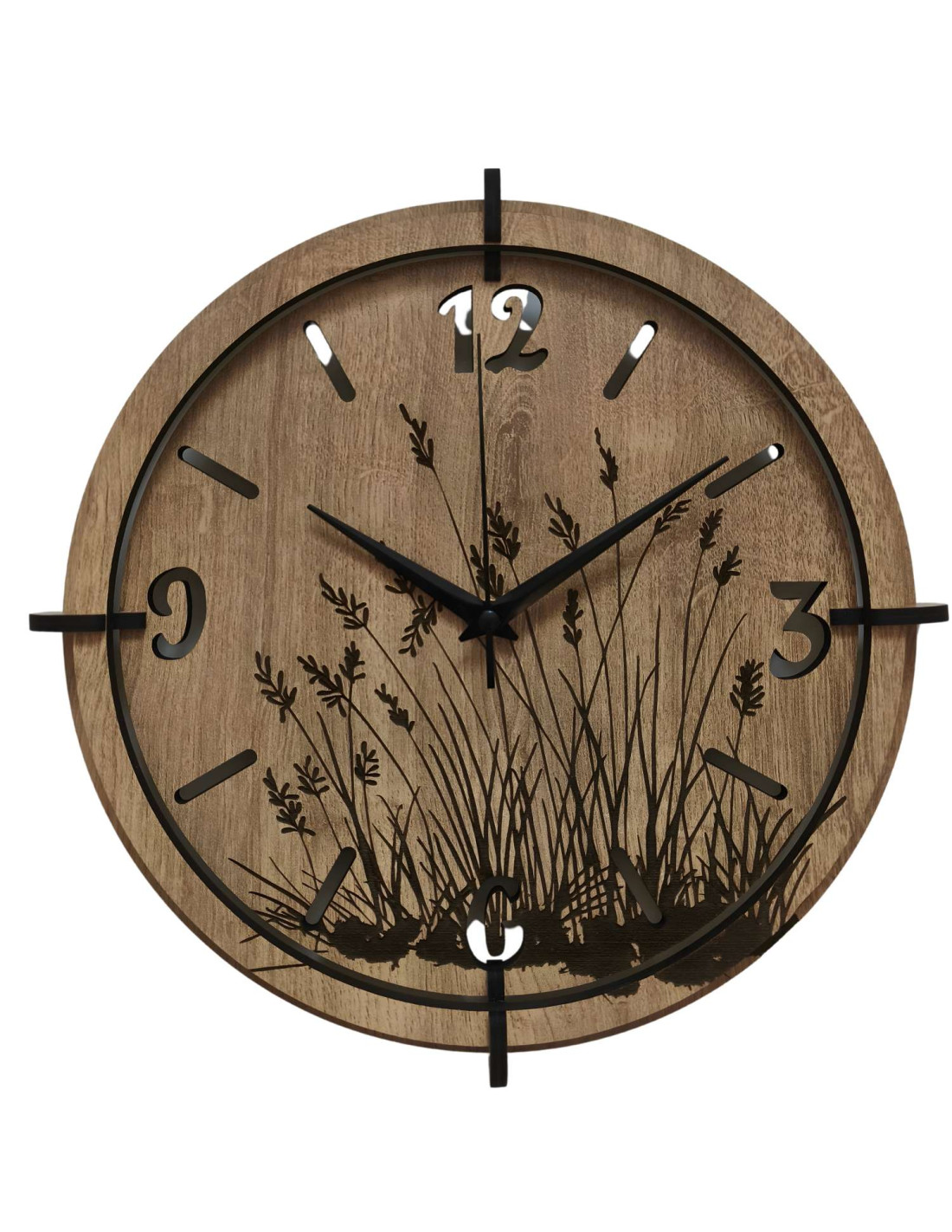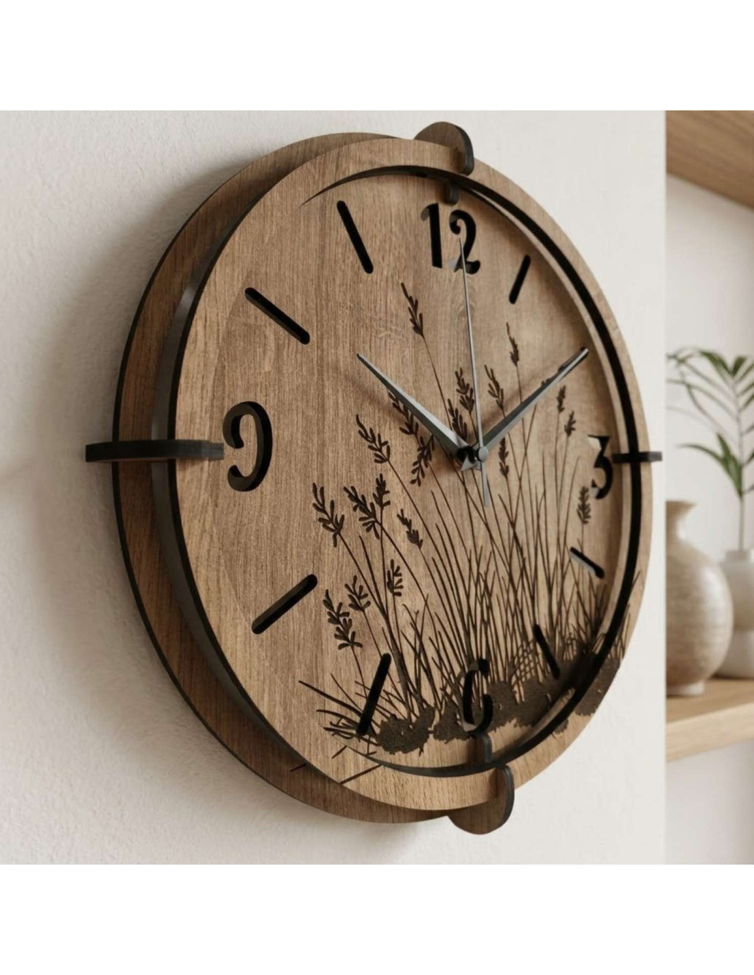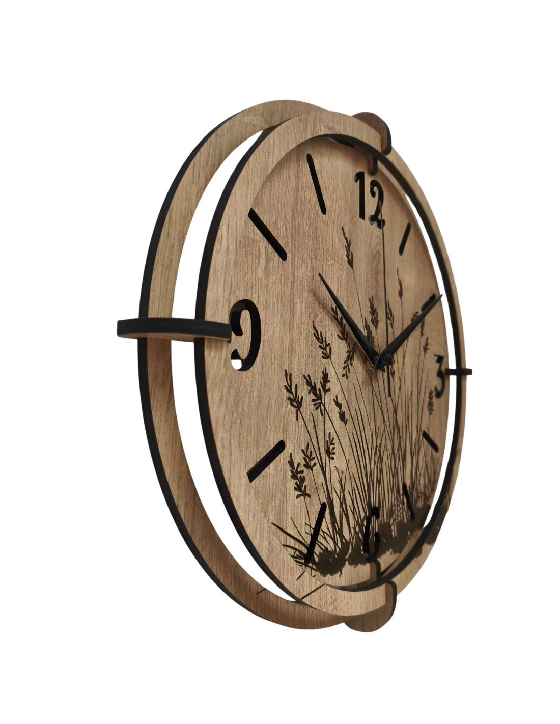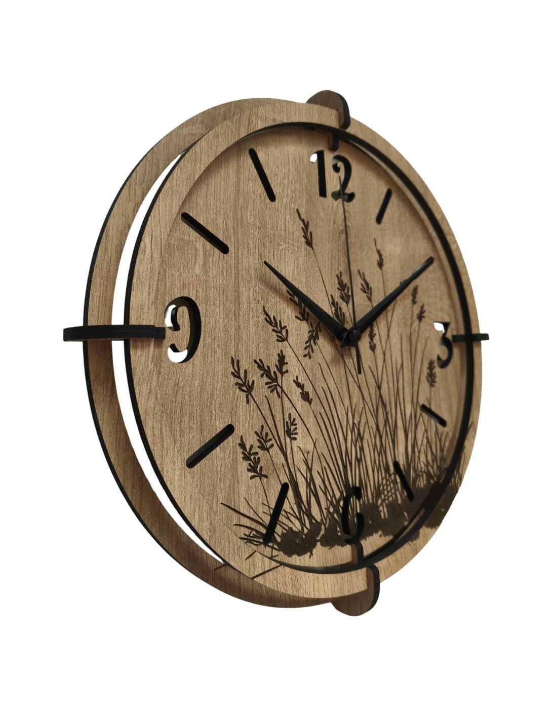 Nowoczesne drewniane zegary ścienne z delikatnym grawerowanym motywem traw łąkowych wnoszą do wnętrza spokój i harmonię .