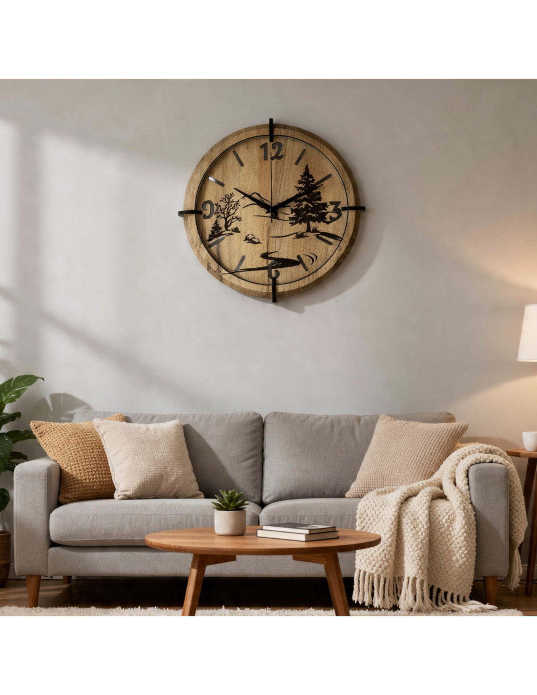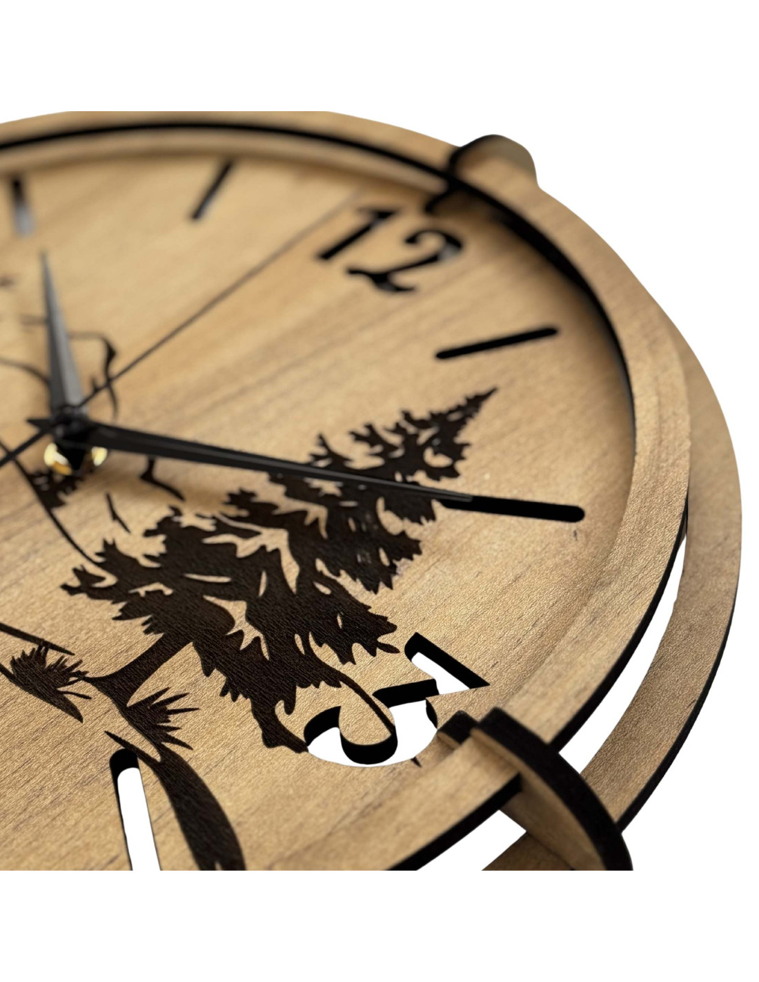 Drewniane zegary z precyzyjnym grawerunkiem przedstawiającym krajobraz łączą w sobie autentyczny wygląd natury z nowoczesnym designem , kontrastującymi czarnymi elementami i niezawodnym, cichym mechanizmem.