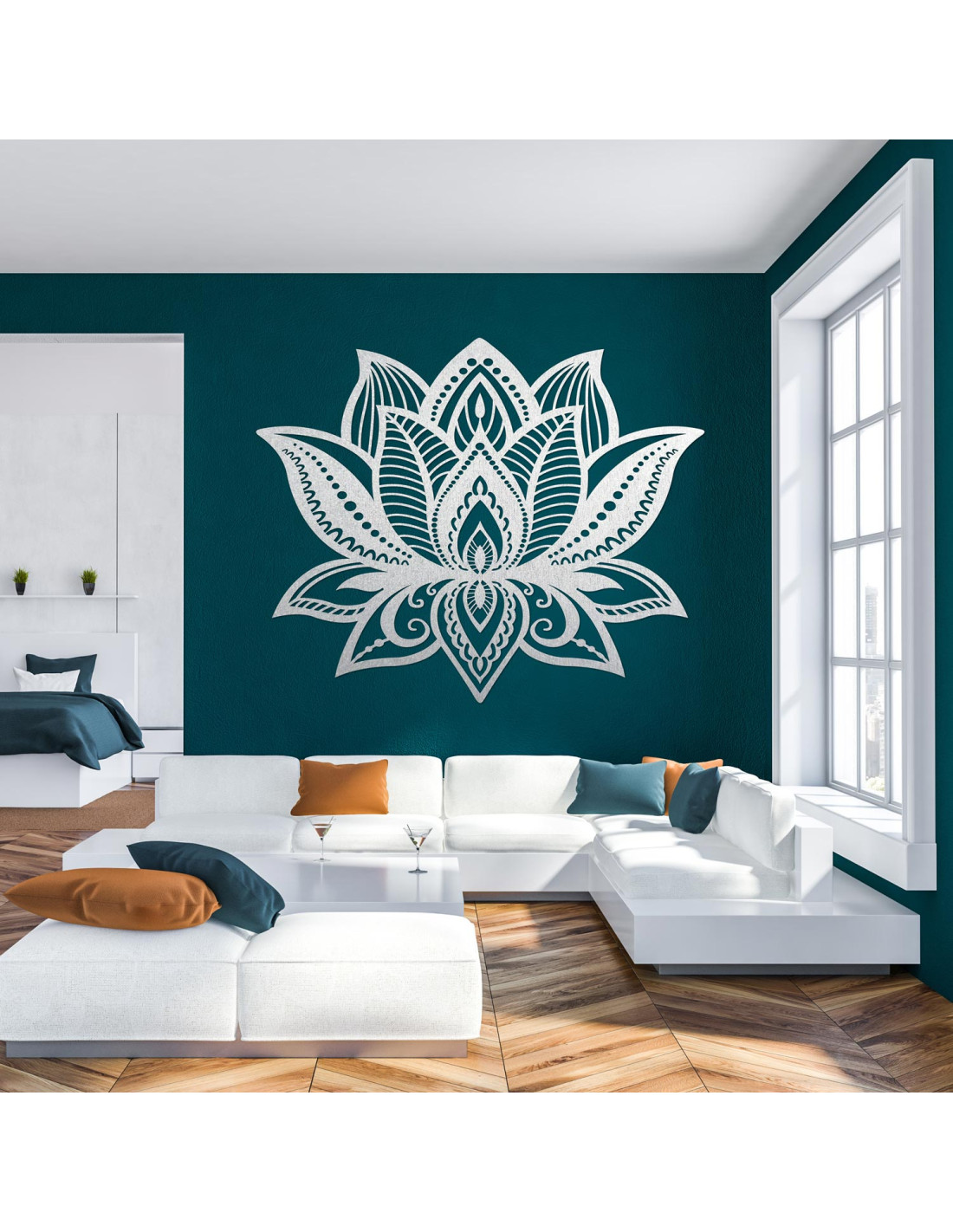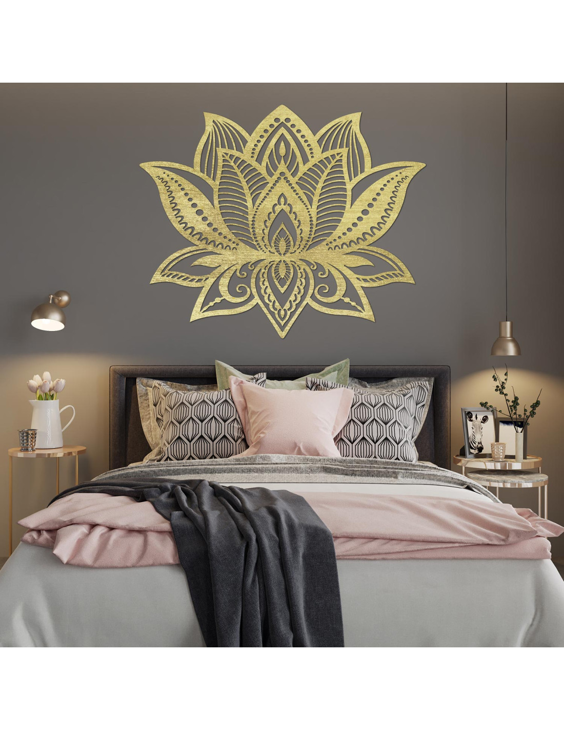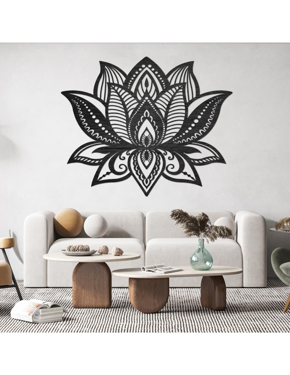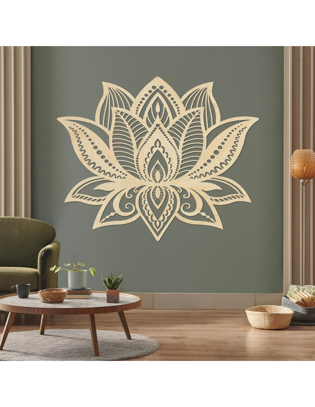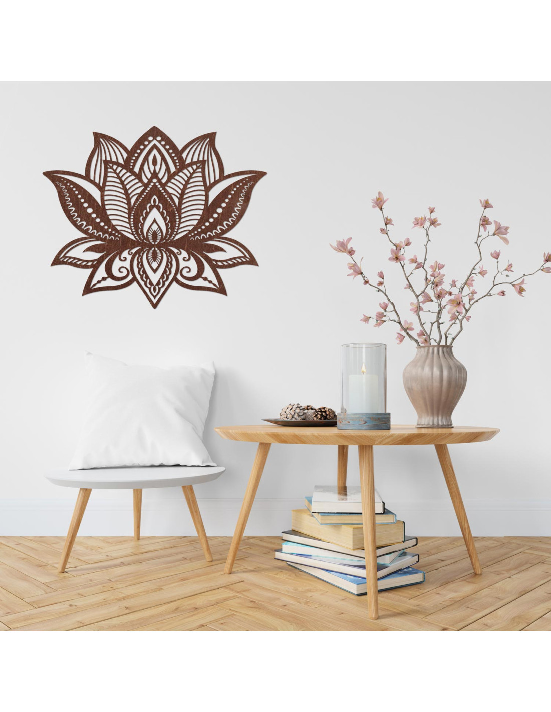 Symetria kwiatu lotosu symbolizuje nowy początek, czystość i wewnętrzną siłę, a pieczołowicie rzeźbione detale nadają każdemu pomieszczeniu wyjątkową fakturę i ciepły akcent drewna.