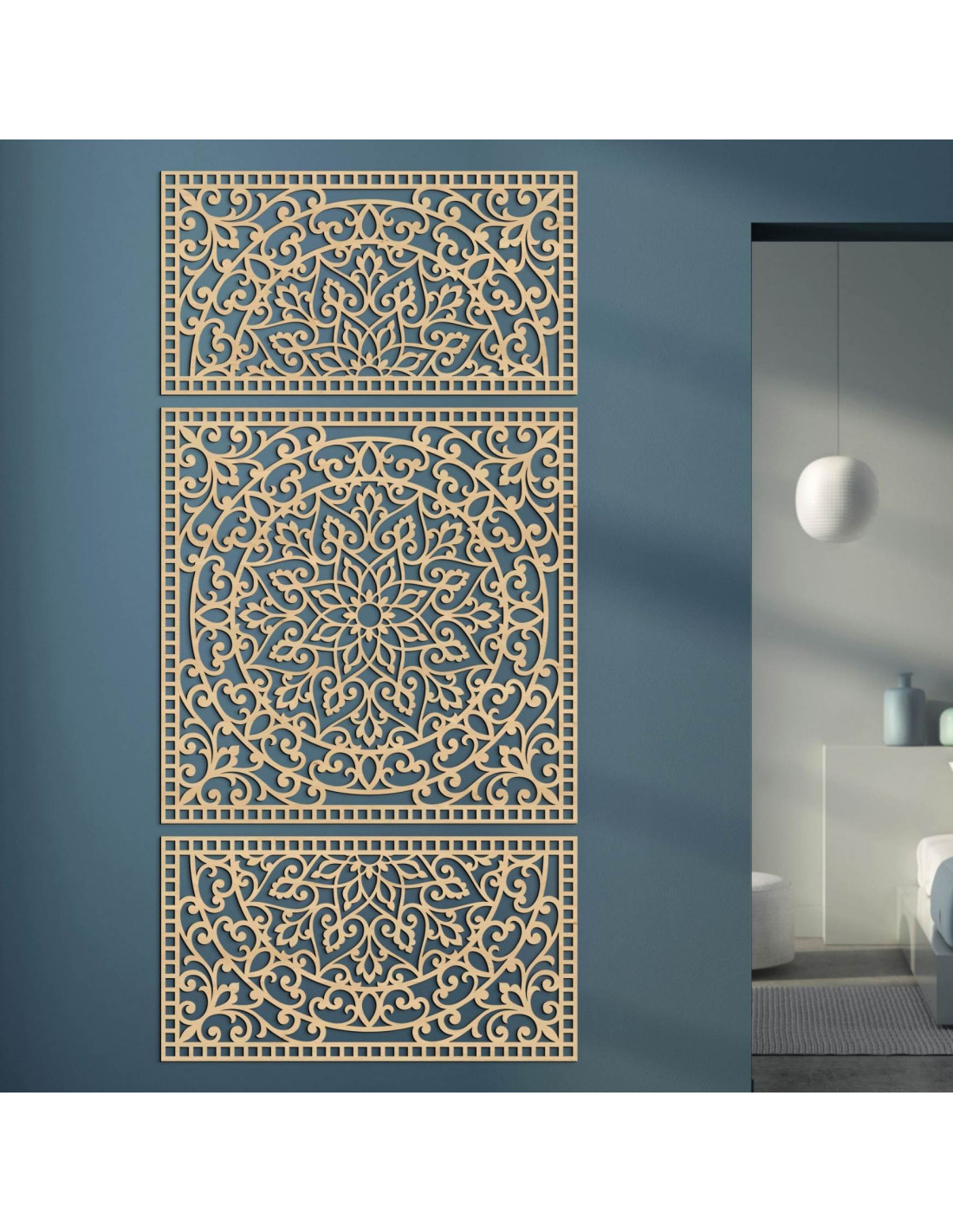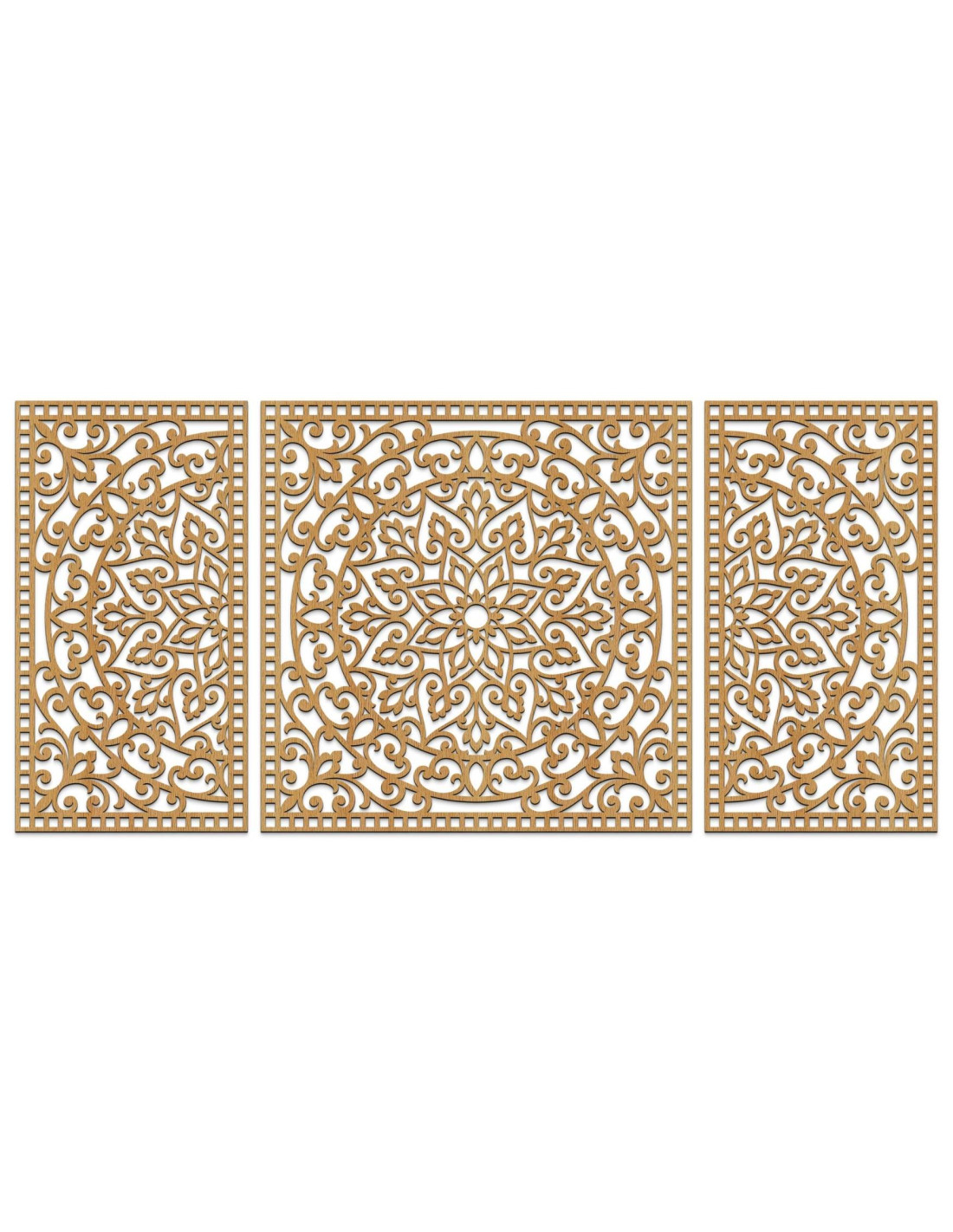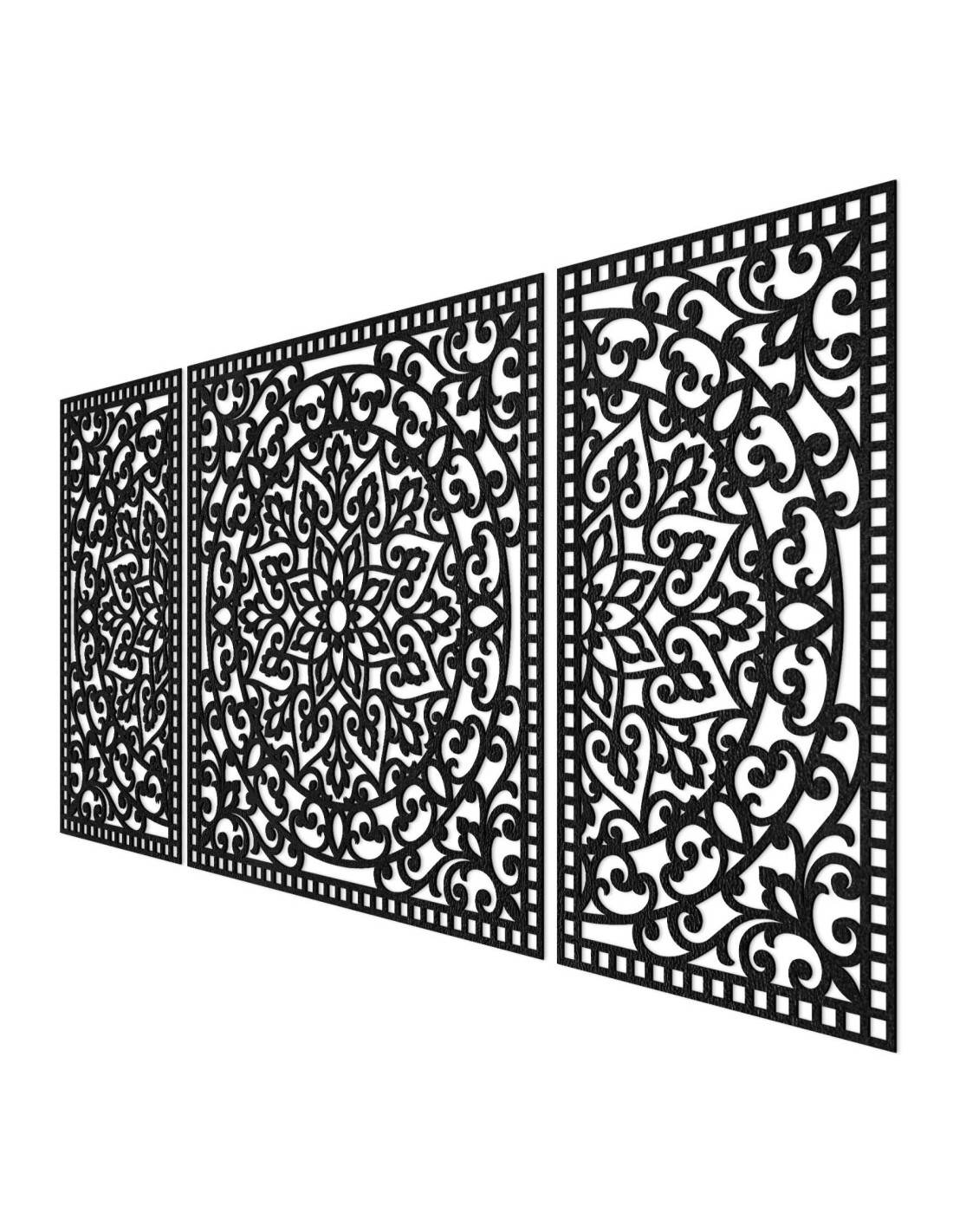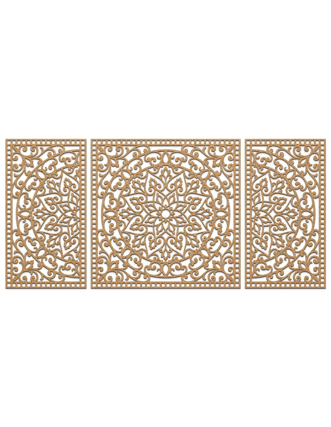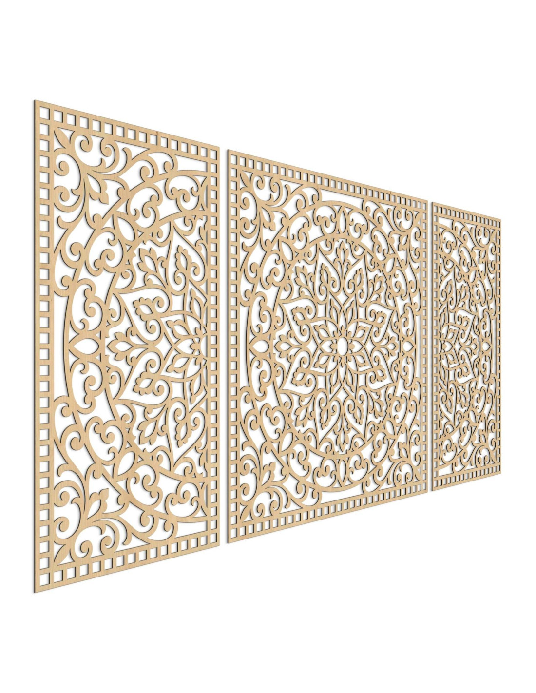 Ta elegancka, trzyczęściowa mandala łączy tradycyjne wzory zdobnicze z nowoczesnym stylem. Każdy element jest precyzyjnie wycięty z płyty HDF, co zapewnia wyrazistość i wyrazistość detali.