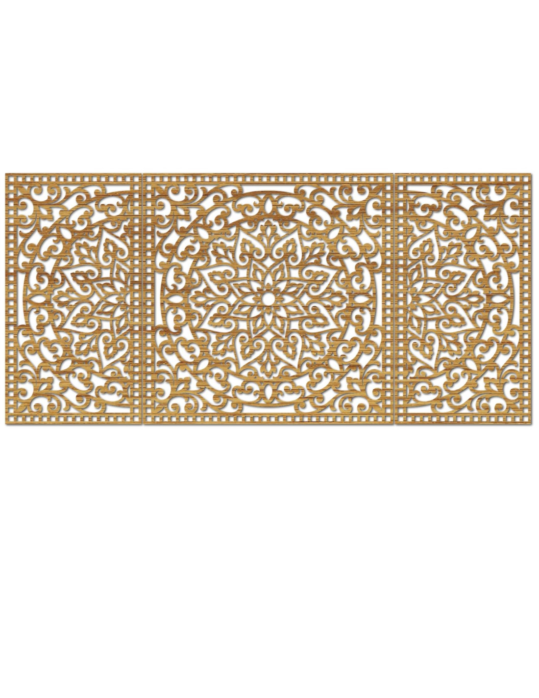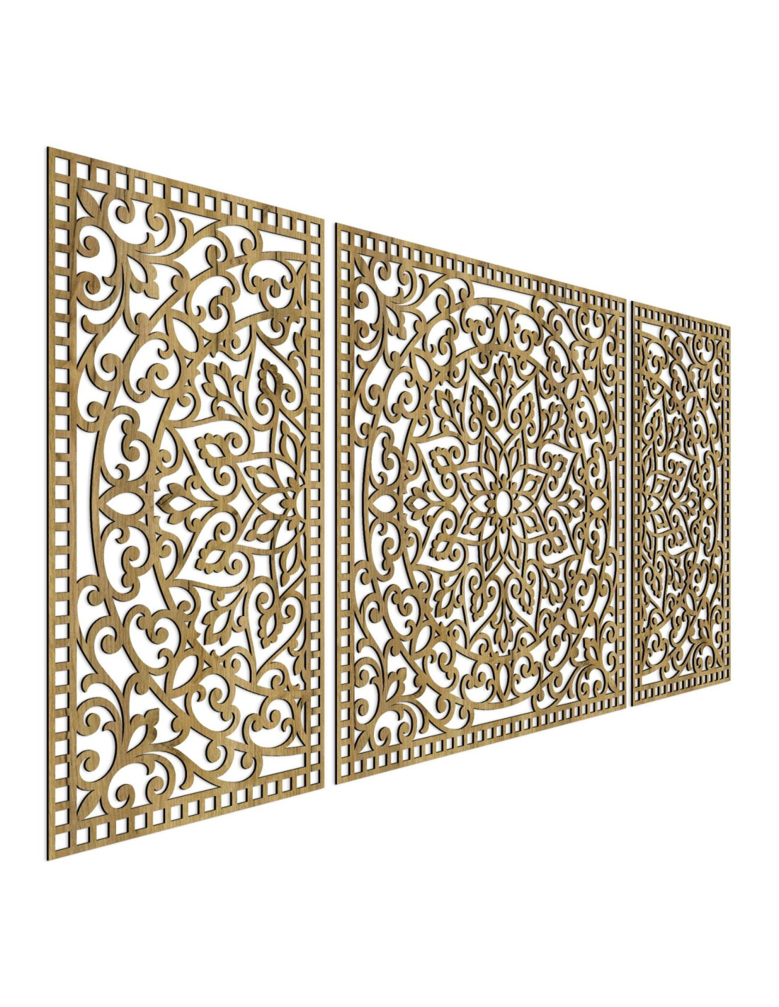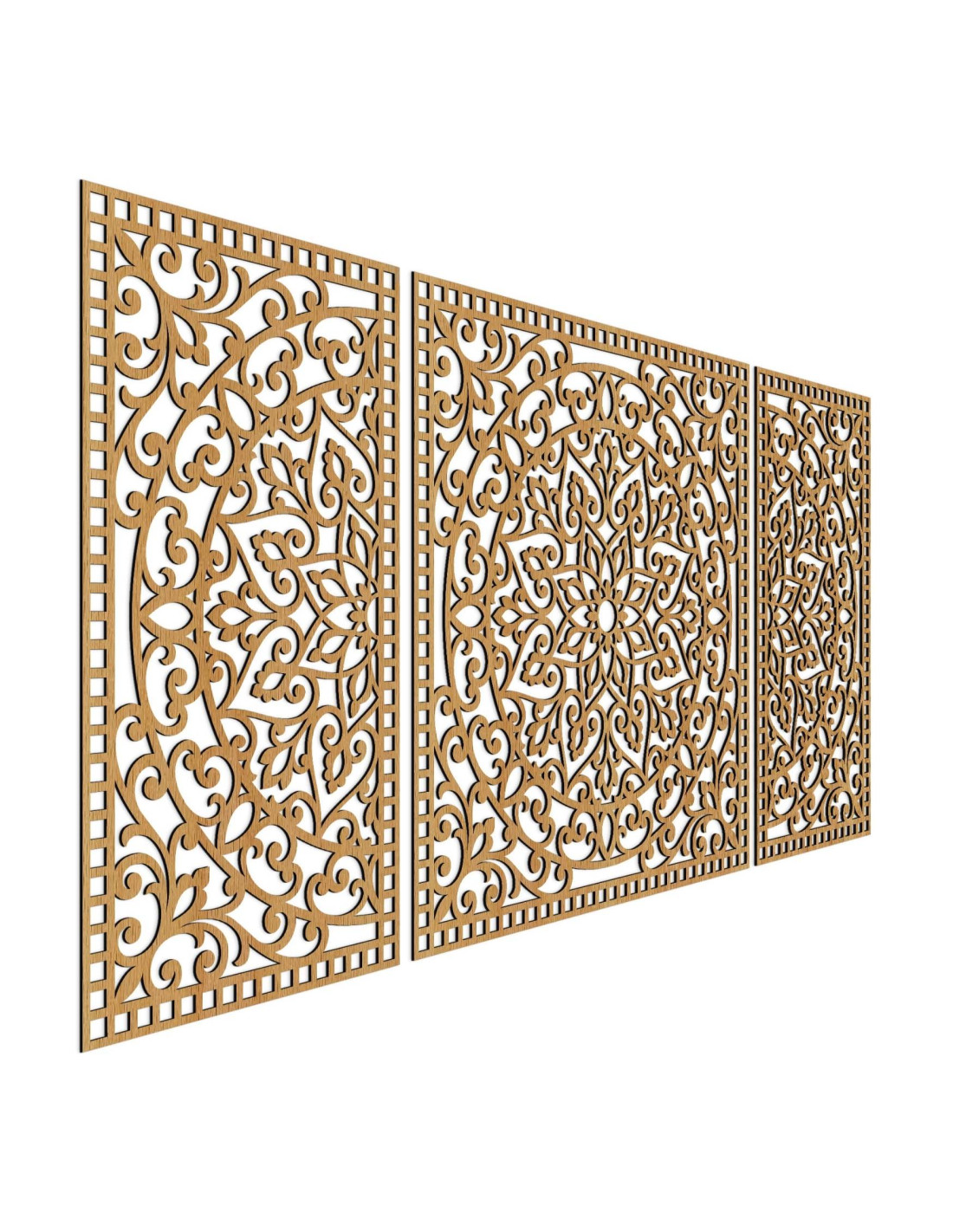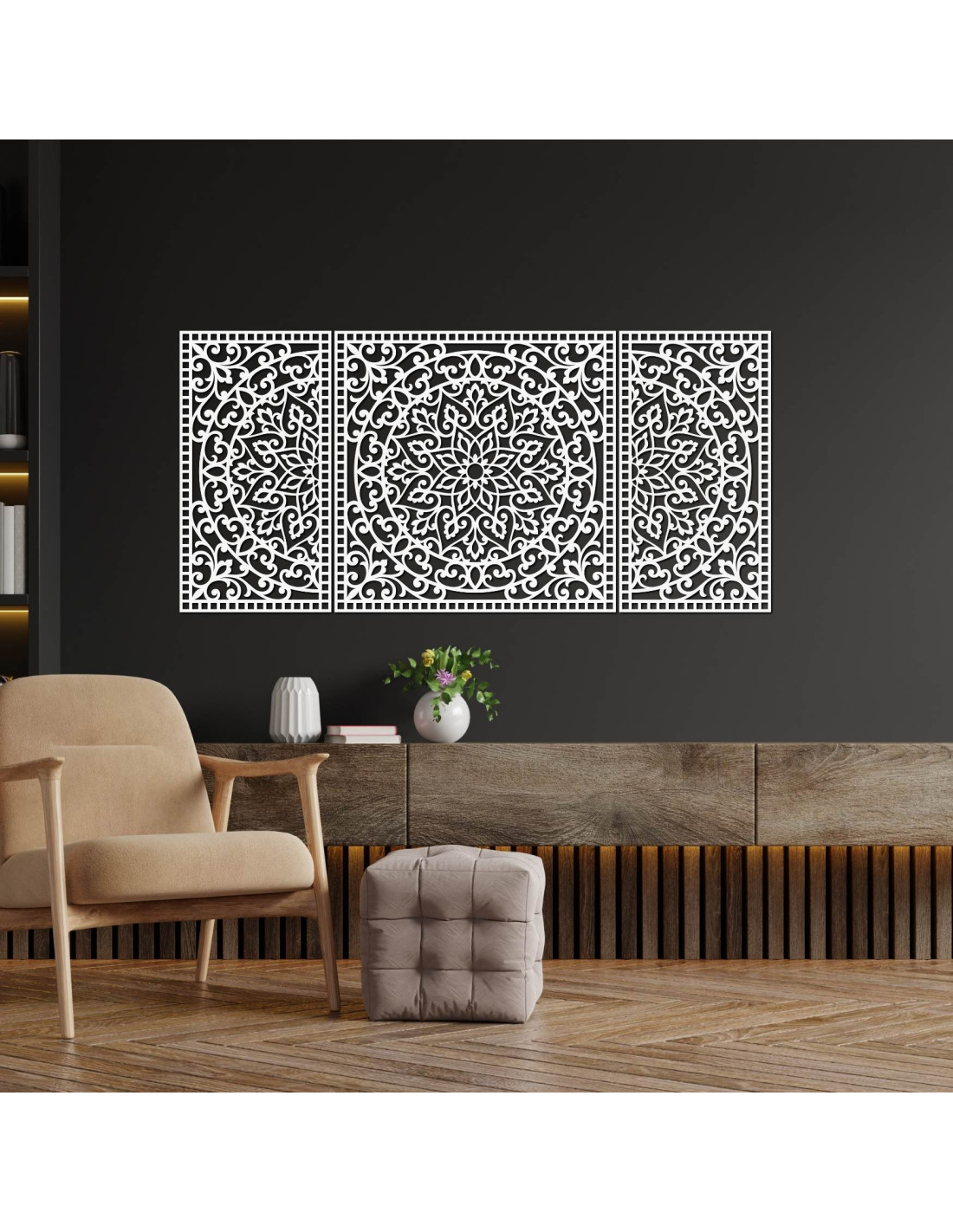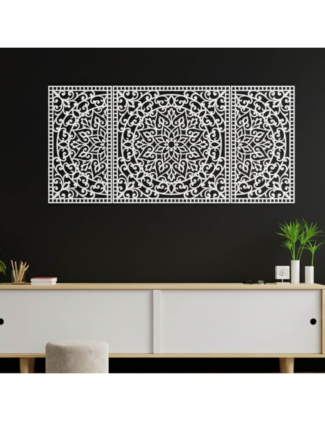 Ta elegancka, trzyczęściowa mandala łączy tradycyjne wzory zdobnicze z nowoczesnym stylem. Każdy element jest precyzyjnie wycięty z płyty HDF, co zapewnia wyrazistość i wyrazistość detali.