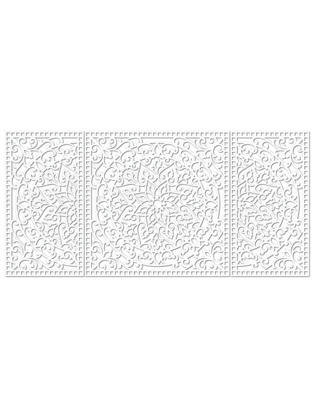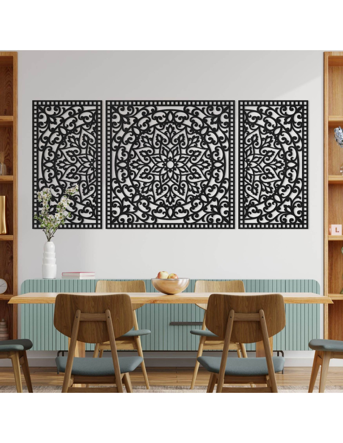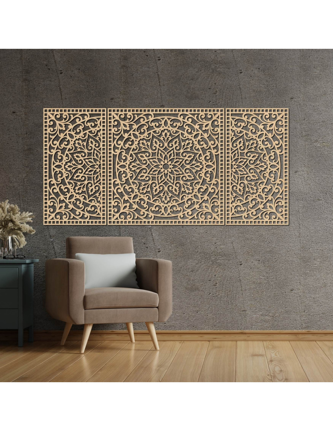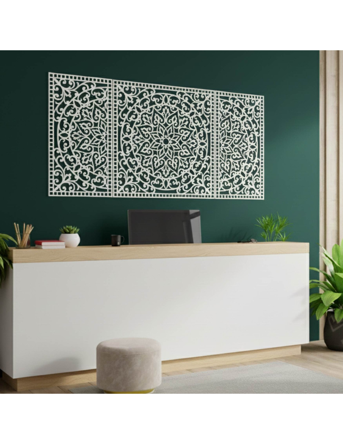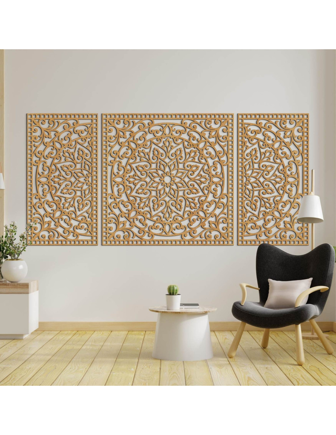 Ta elegancka, trzyczęściowa mandala łączy tradycyjne wzory zdobnicze z nowoczesnym stylem. Każdy element jest precyzyjnie wycięty z płyty HDF, co zapewnia wyrazistość i wyrazistość detali.