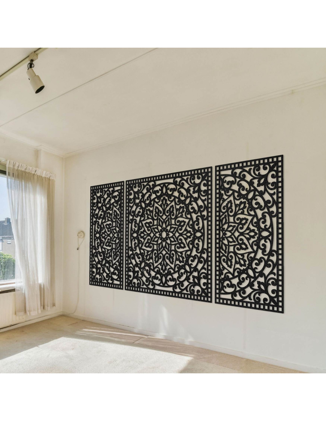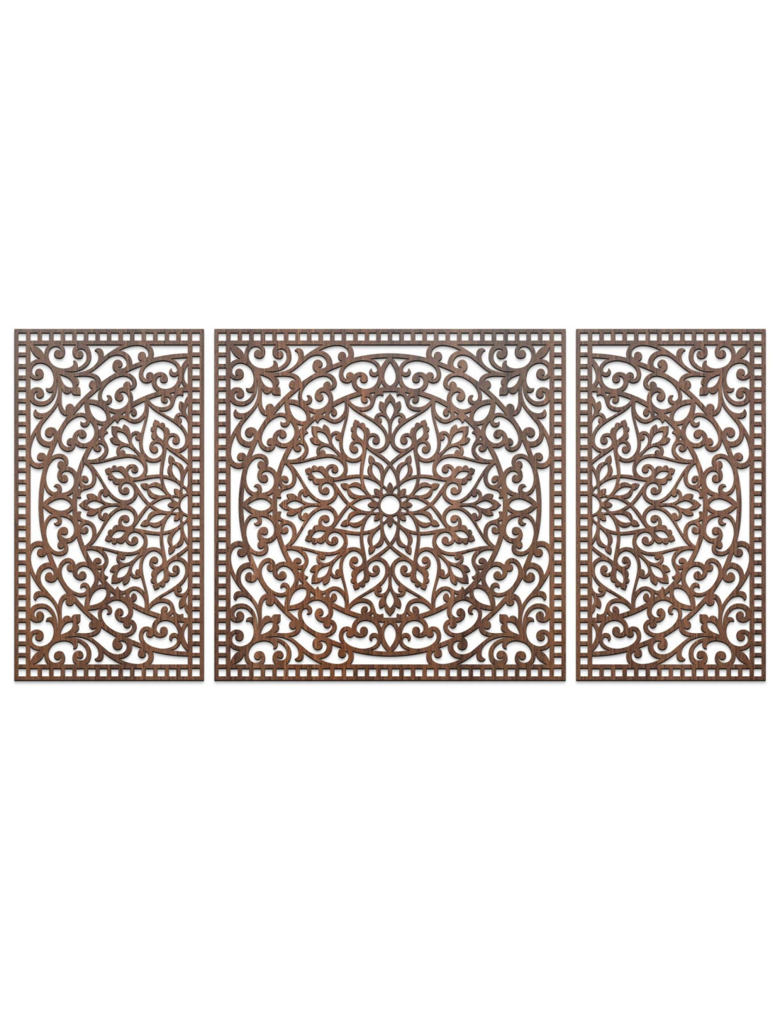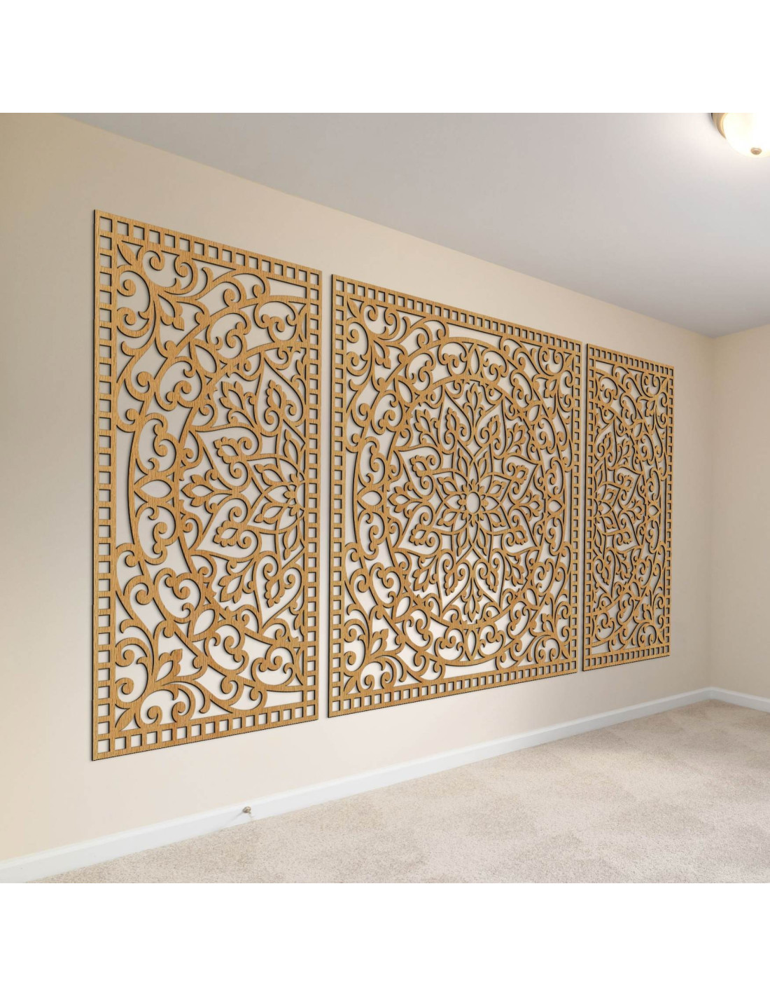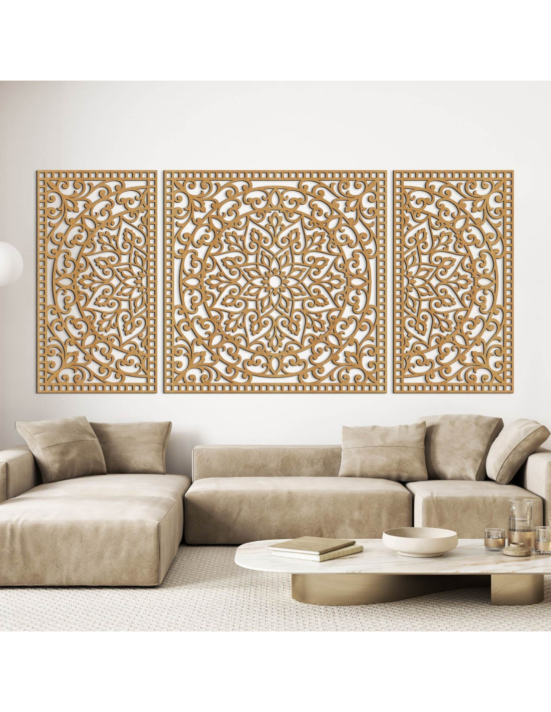 Ta elegancka, trzyczęściowa mandala łączy tradycyjne wzory zdobnicze z nowoczesnym stylem. Każdy element jest precyzyjnie wycięty z płyty HDF, co zapewnia wyrazistość i wyrazistość detali.