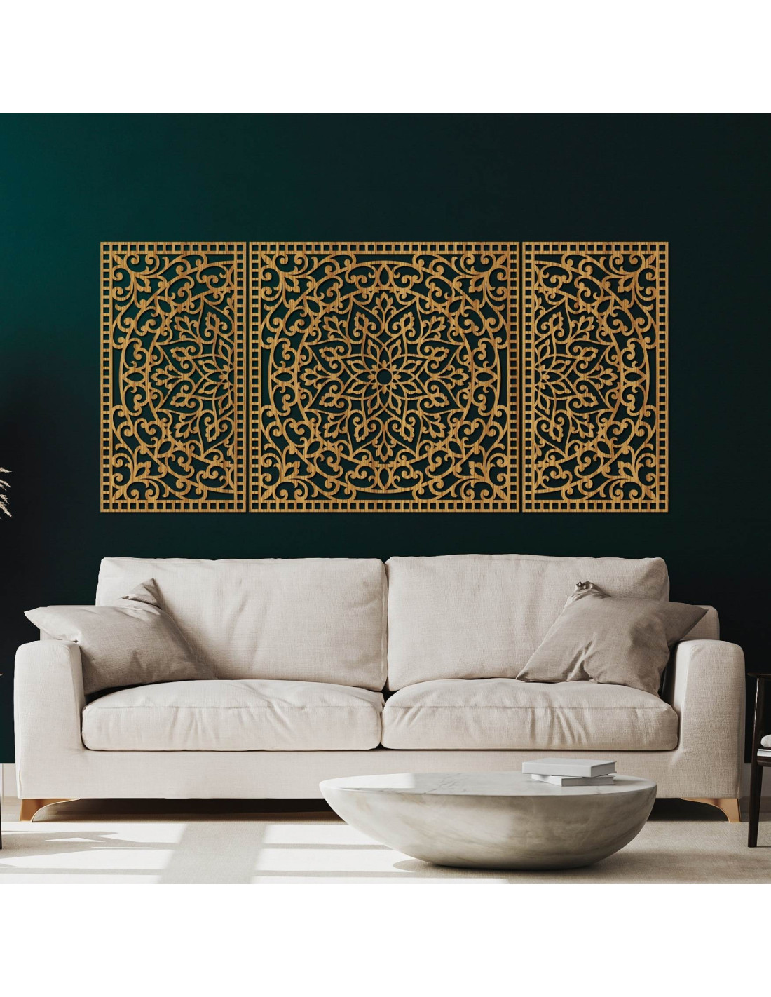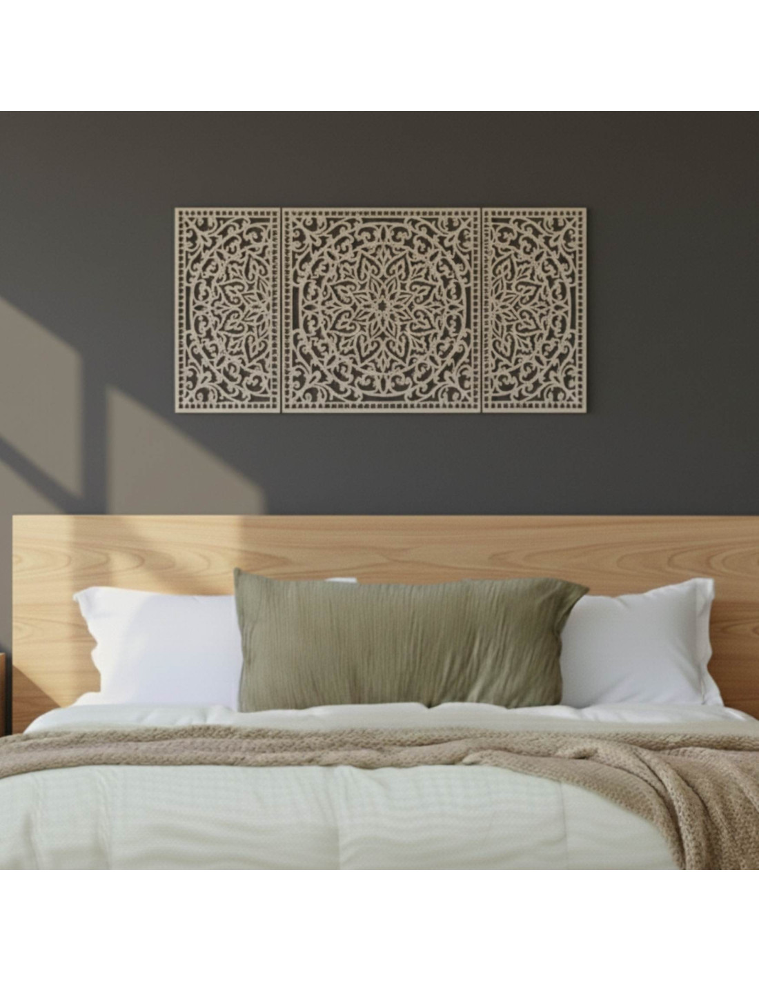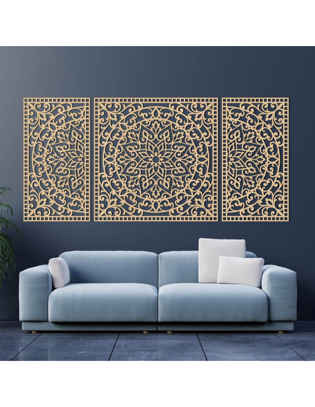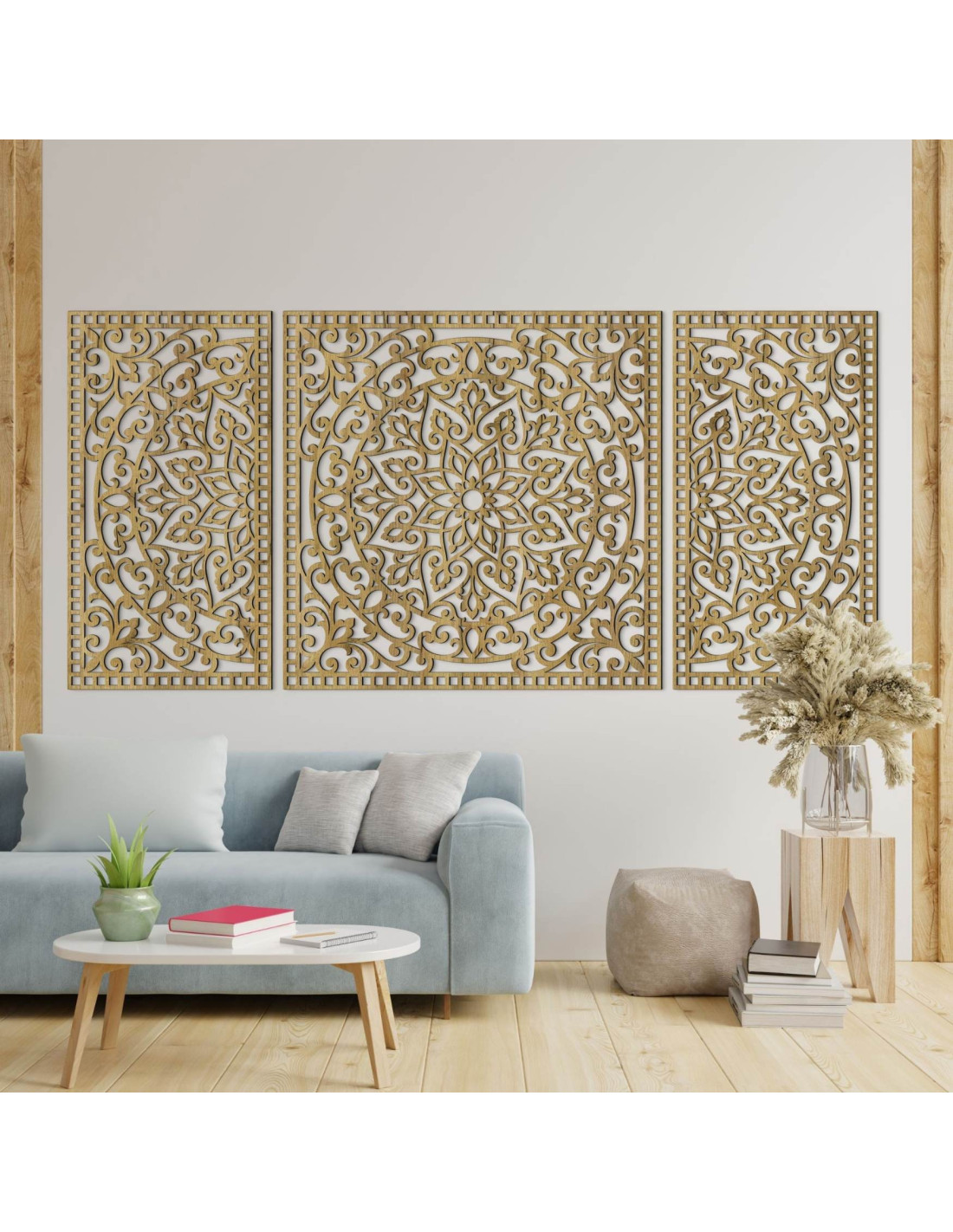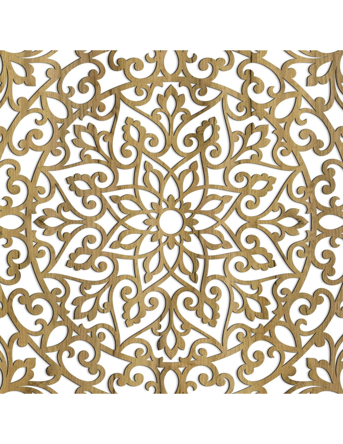 Ta elegancka, trzyczęściowa mandala łączy tradycyjne wzory zdobnicze z nowoczesnym stylem. Każdy element jest precyzyjnie wycięty z płyty HDF, co zapewnia wyrazistość i wyrazistość detali.