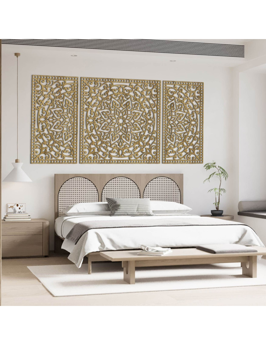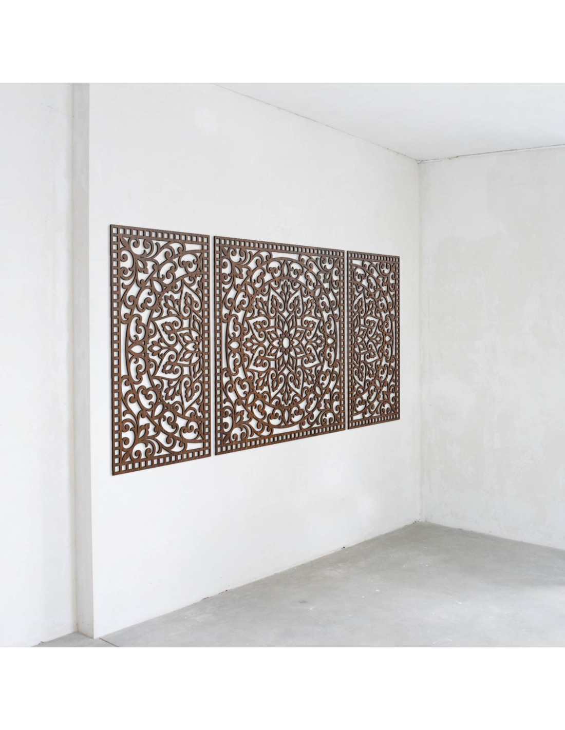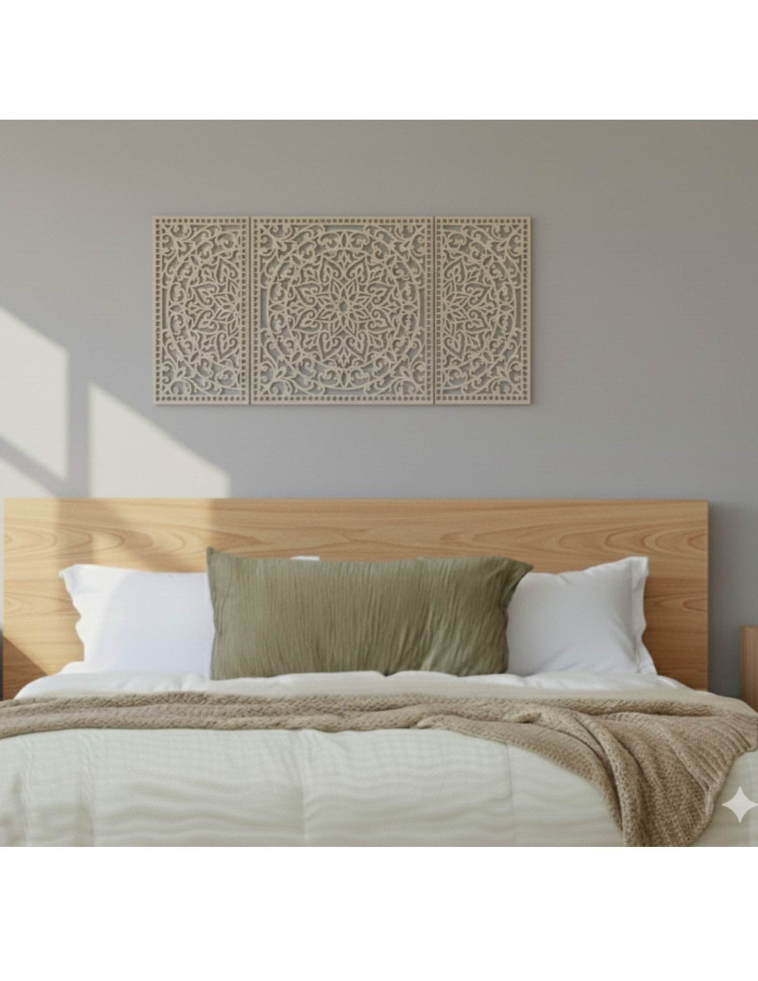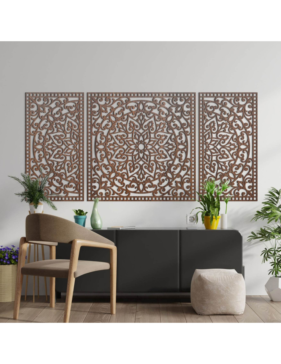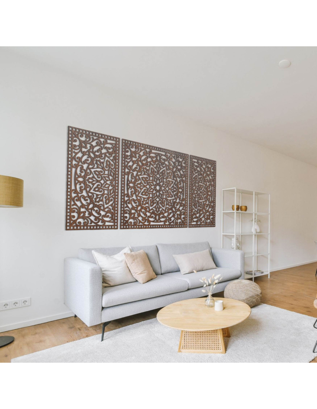 Ta elegancka, trzyczęściowa mandala łączy tradycyjne wzory zdobnicze z nowoczesnym stylem. Każdy element jest precyzyjnie wycięty z płyty HDF, co zapewnia wyrazistość i wyrazistość detali.