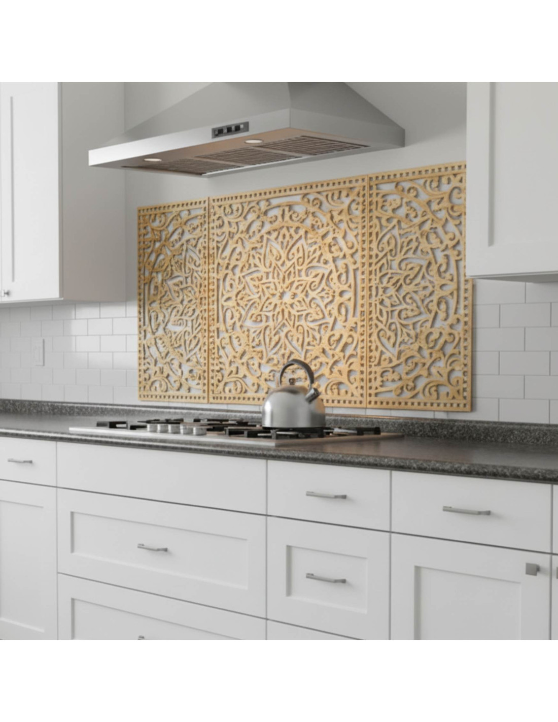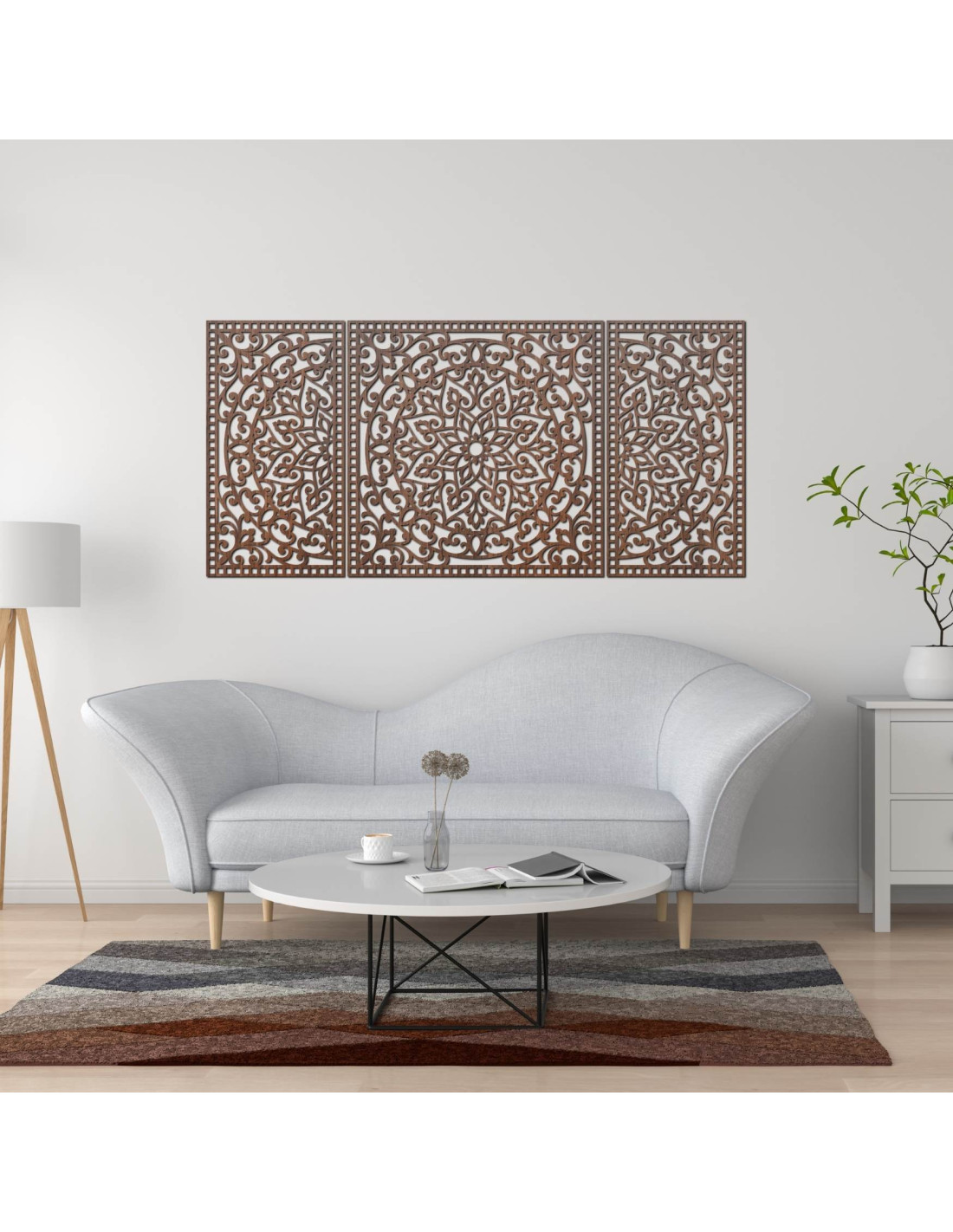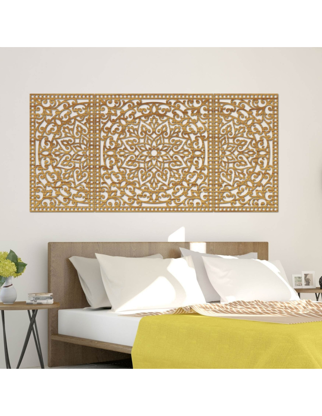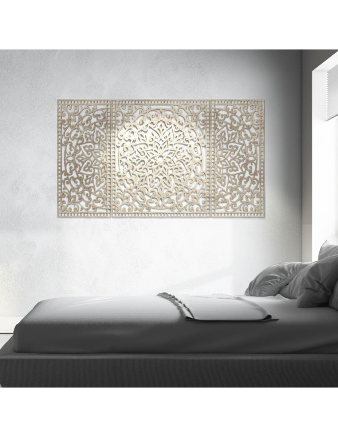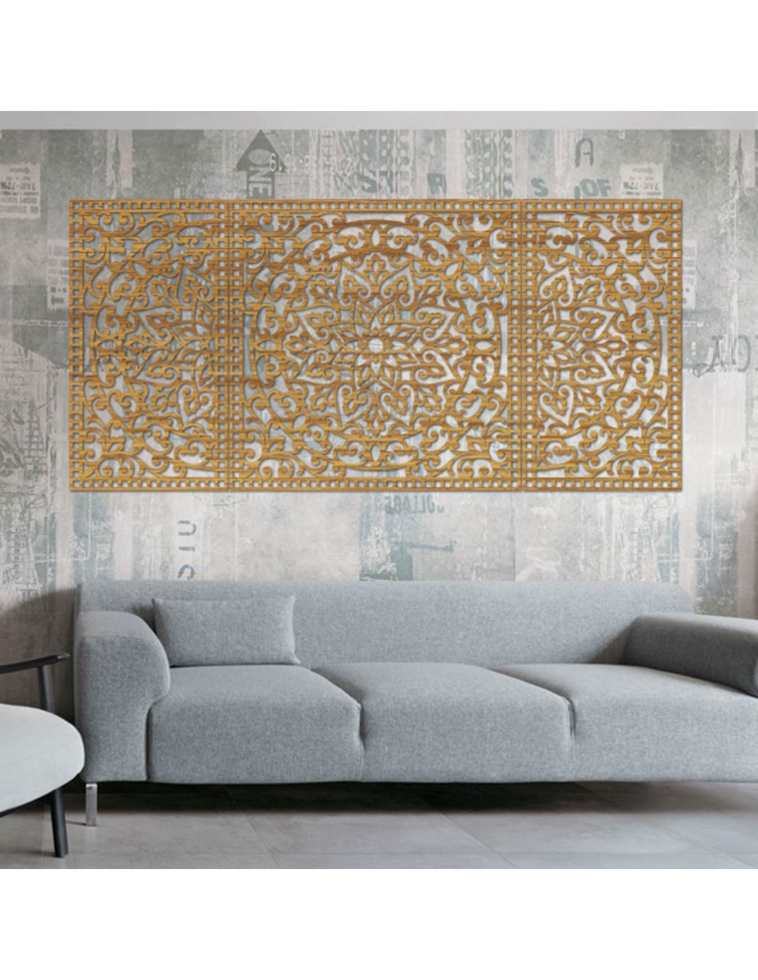 Ta elegancka, trzyczęściowa mandala łączy tradycyjne wzory zdobnicze z nowoczesnym stylem. Każdy element jest precyzyjnie wycięty z płyty HDF, co zapewnia wyrazistość i wyrazistość detali.