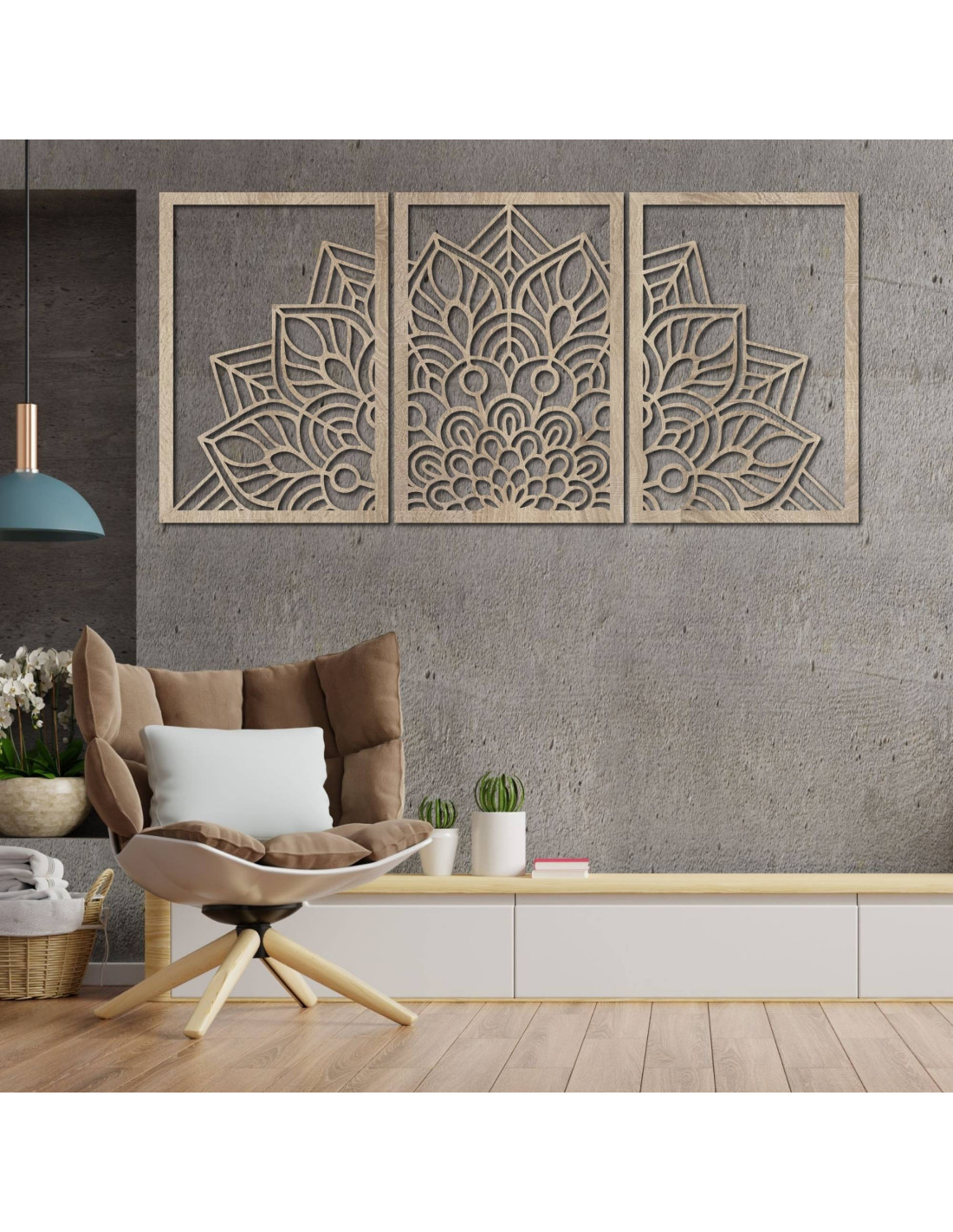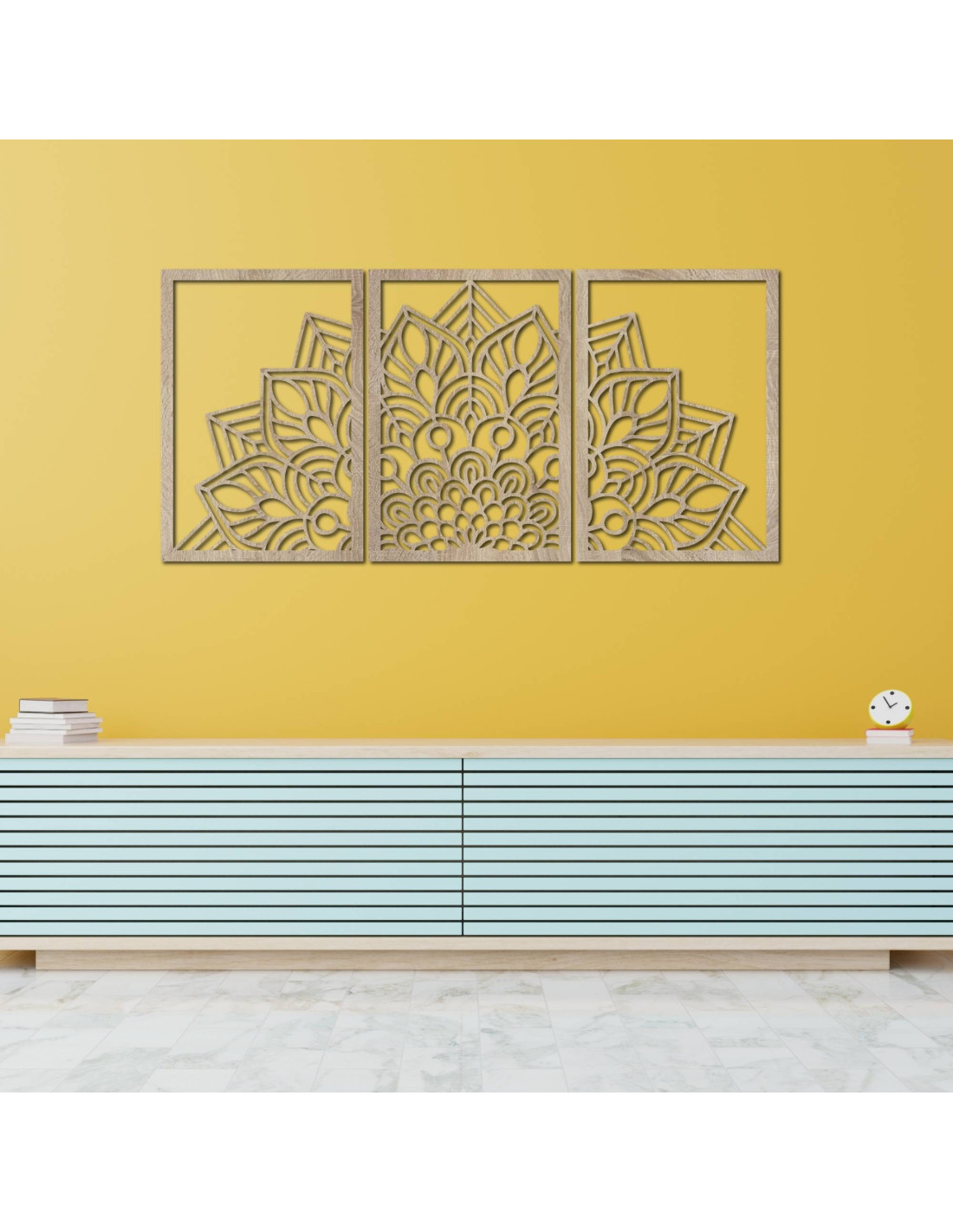 Niezależnie od tego, czy jest to artystyczny zegar ścienny w kształcie mandali kwiatu życia z zabawnymi sylwetkami ptaków, czy majestatyczna trzyczęściowa mandala , elementy te dzięki precyzyjnemu rzeźbieniu wizualnie otwierają i powiększają przestrzeń.