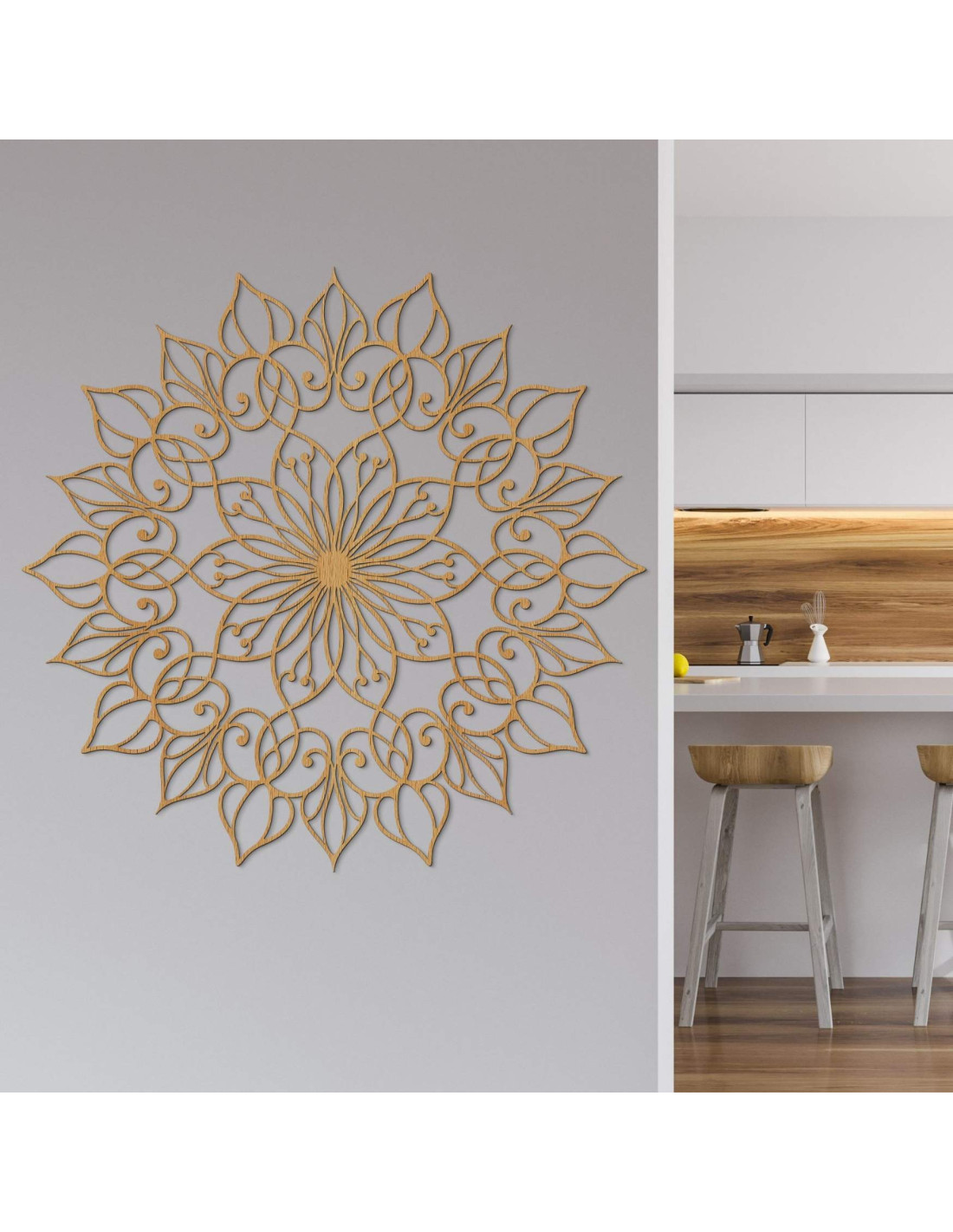 Ta wyjątkowa dekoracja ścienna przedstawia mandalę Kwiatu Życia z precyzyjnie wyrzeźbionym, szczegółowym wzorem. Złoty odcień nadaje przestrzeni luksusowy, ciepły i harmonijny wygląd , czyniąc ją wyjątkowym elementem wystroju każdego wnętrza.