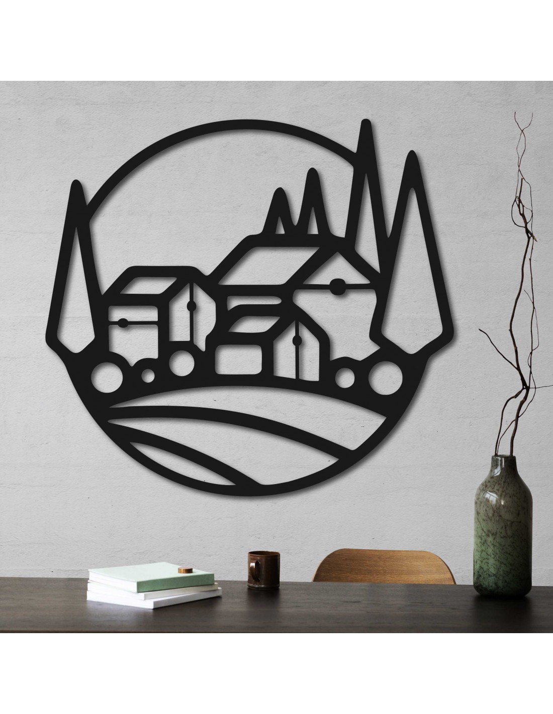 Obraz ze sklejki drewnianej to przede wszystkim walory estetyczne i funkcjonalne. Jest on tworzony metodą cięcia laserowego, co gwarantuje precyzję detali i głębokie kontrasty. Projekt przedstawia typowy krajobraz z domami i wysokimi drzewami, przywołując poczucie spokoju i harmonii z naturą. Idealnie nadaje się jako dekoracja salonów, sypialni czy biur, nadając wnętrzu niepowtarzalny charakter i ciepły wygląd. Materiał, z którego jest wykonany, gwarantuje trwałość i łatwość konserwacji.