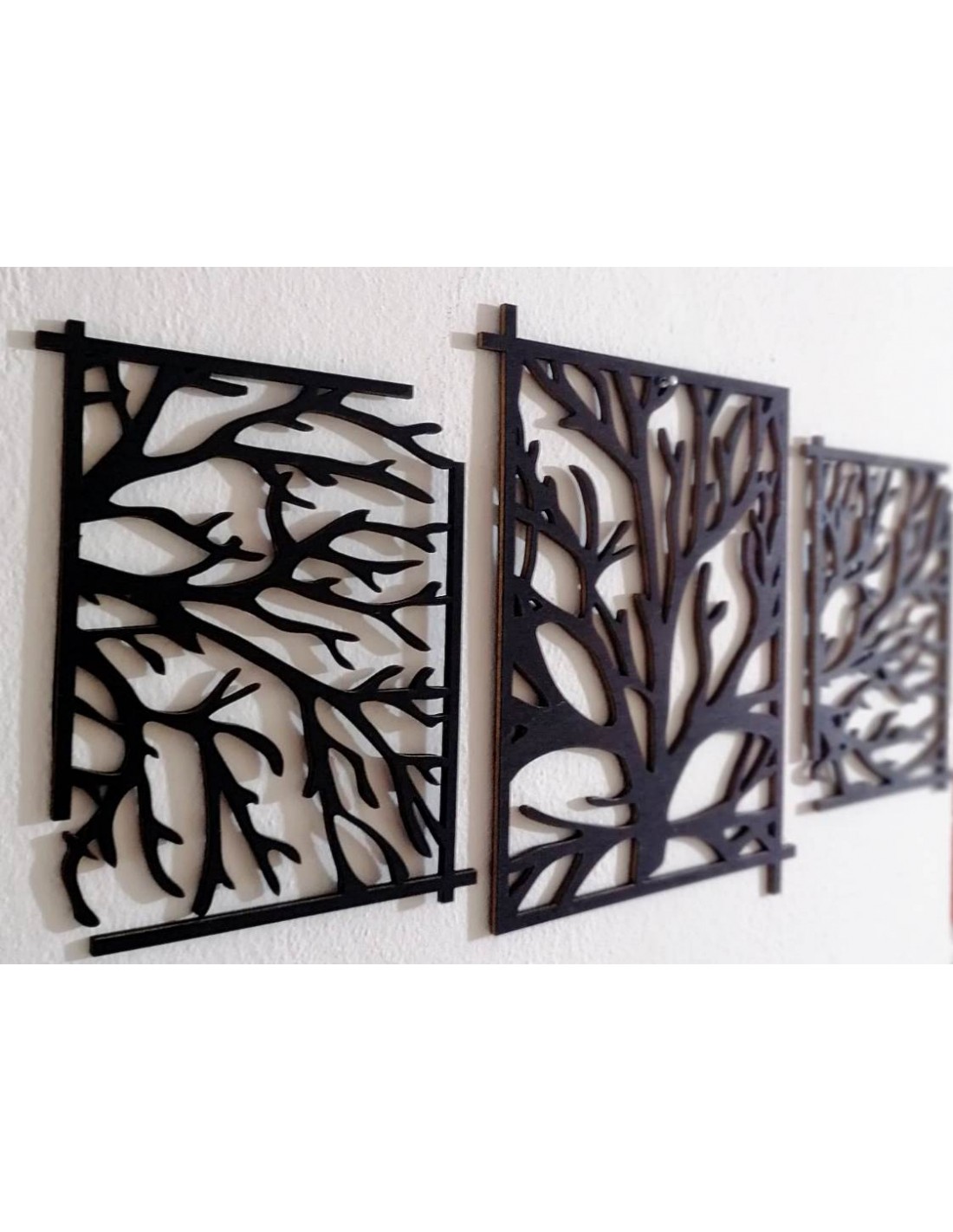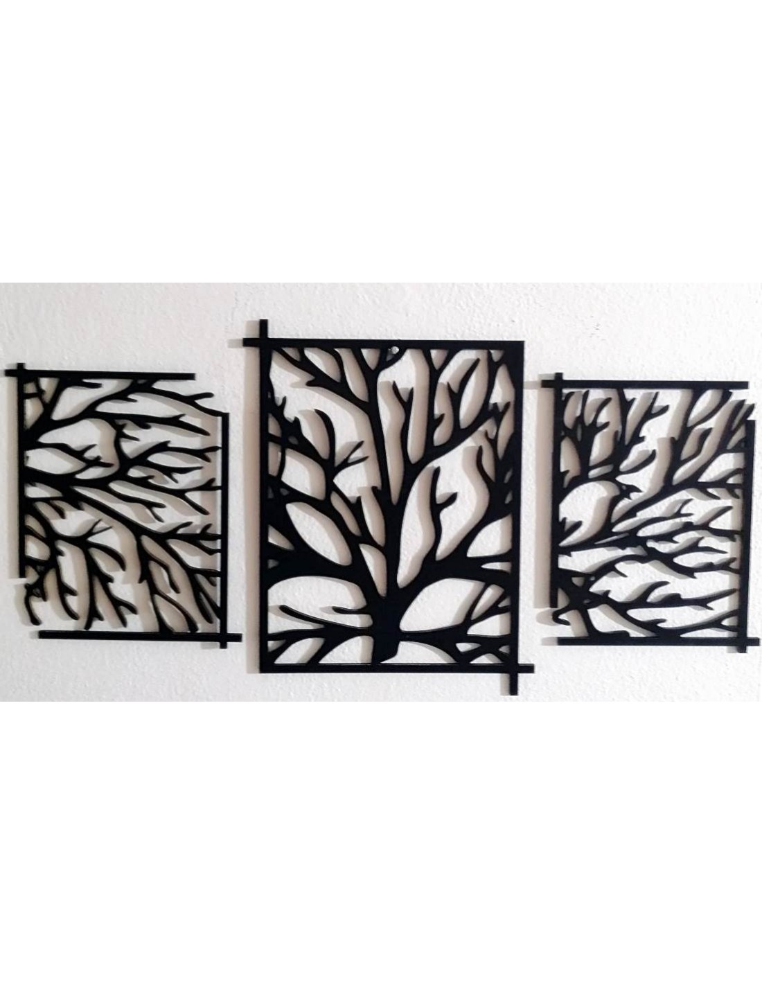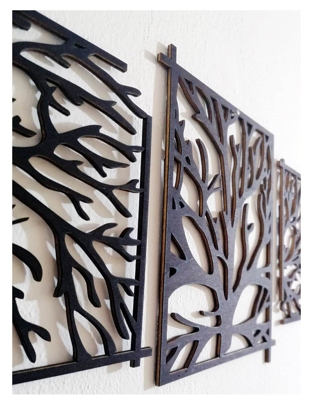 Na zdjęciu dekoracyjne panele ścienne z motywem drzewa. Wykonane z materiałów o kontrastujących odcieniach czerni i naturalnych barw, panele te nadają wnętrzu naturalny i nowoczesny wygląd. Ich unikalny wzór i staranne wykonanie nadadzą wnętrzu wyjątkowego charakteru i będą idealnym uzupełnieniem salonów, korytarzy i innych pomieszczeń. W razie pytań lub potrzeby uzyskania dodatkowych informacji, prosimy o kontakt!