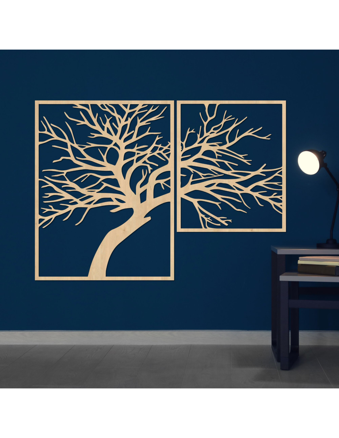 Dwuczęściowy obraz przedstawia eleganckie drzewo z precyzyjnie rzeźbionymi gałęziami, wykonanymi w ciepłych odcieniach drewna .