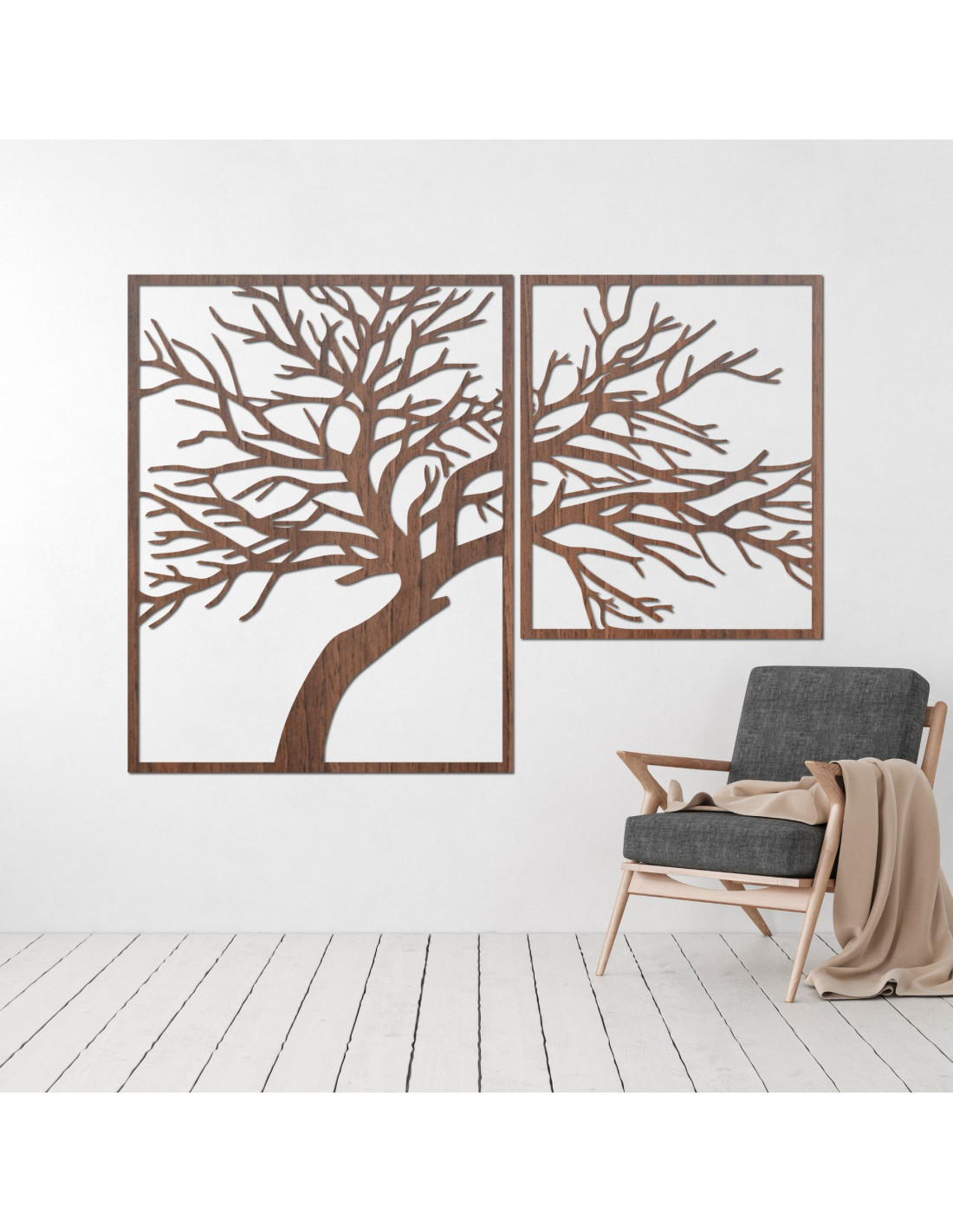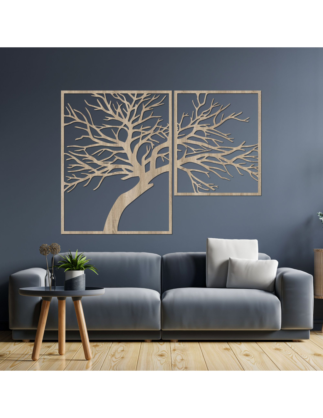 Dwuczęściowy obraz przedstawia eleganckie drzewo z precyzyjnie rzeźbionymi gałęziami, wykonanymi w ciepłych odcieniach drewna .