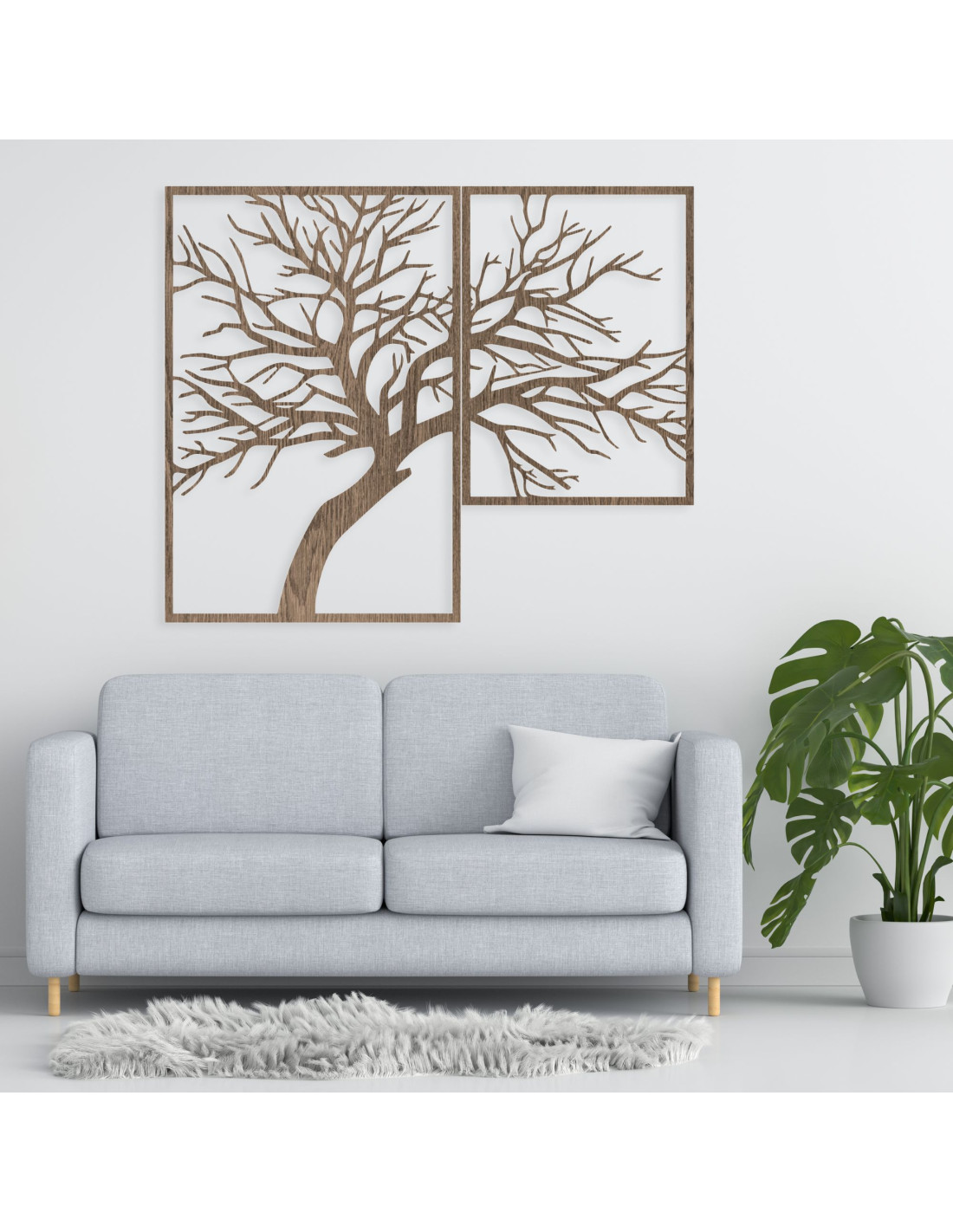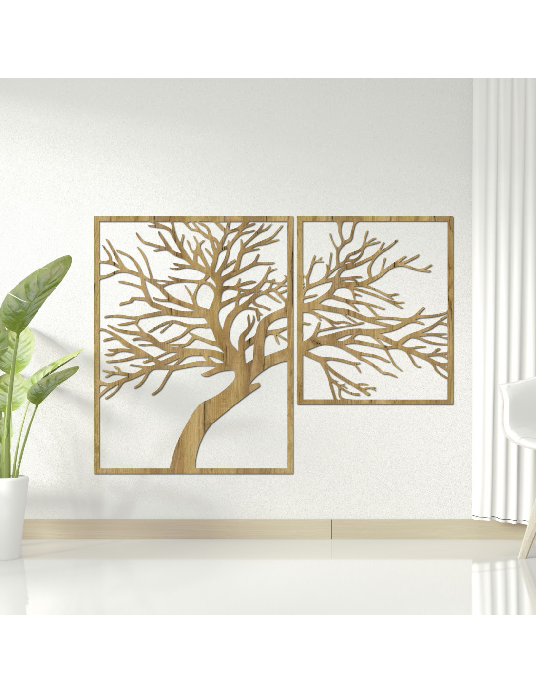 Dwuczęściowy obraz przedstawia eleganckie drzewo z precyzyjnie rzeźbionymi gałęziami, wykonanymi w ciepłych odcieniach drewna.