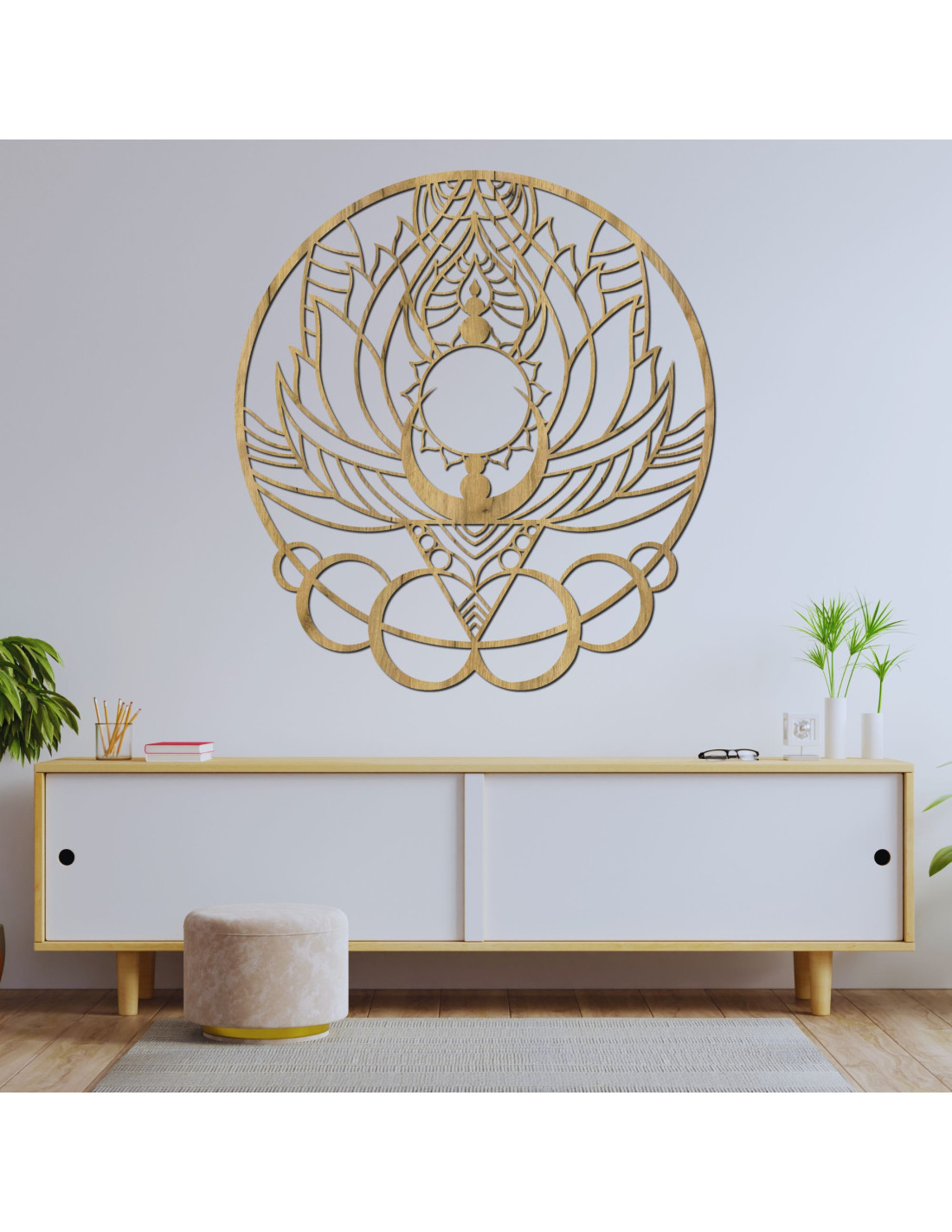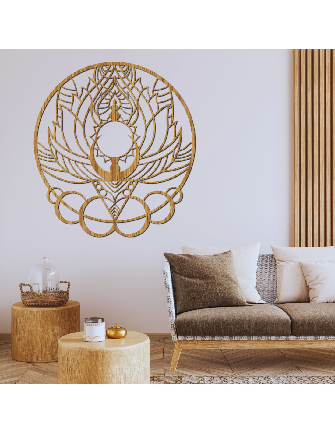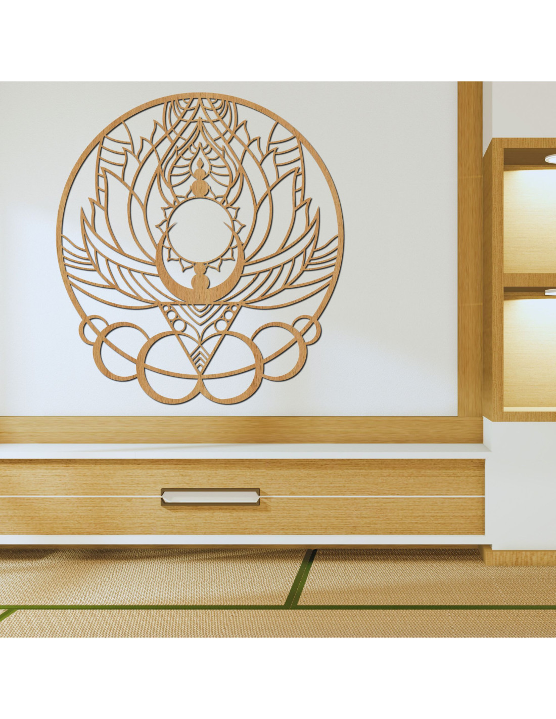 Artystyczna drewniana dekoracja mandala z kwiatem i słońcem | FLORISOLUS