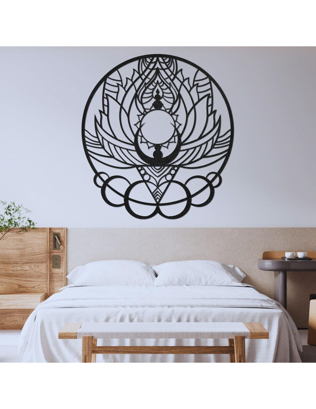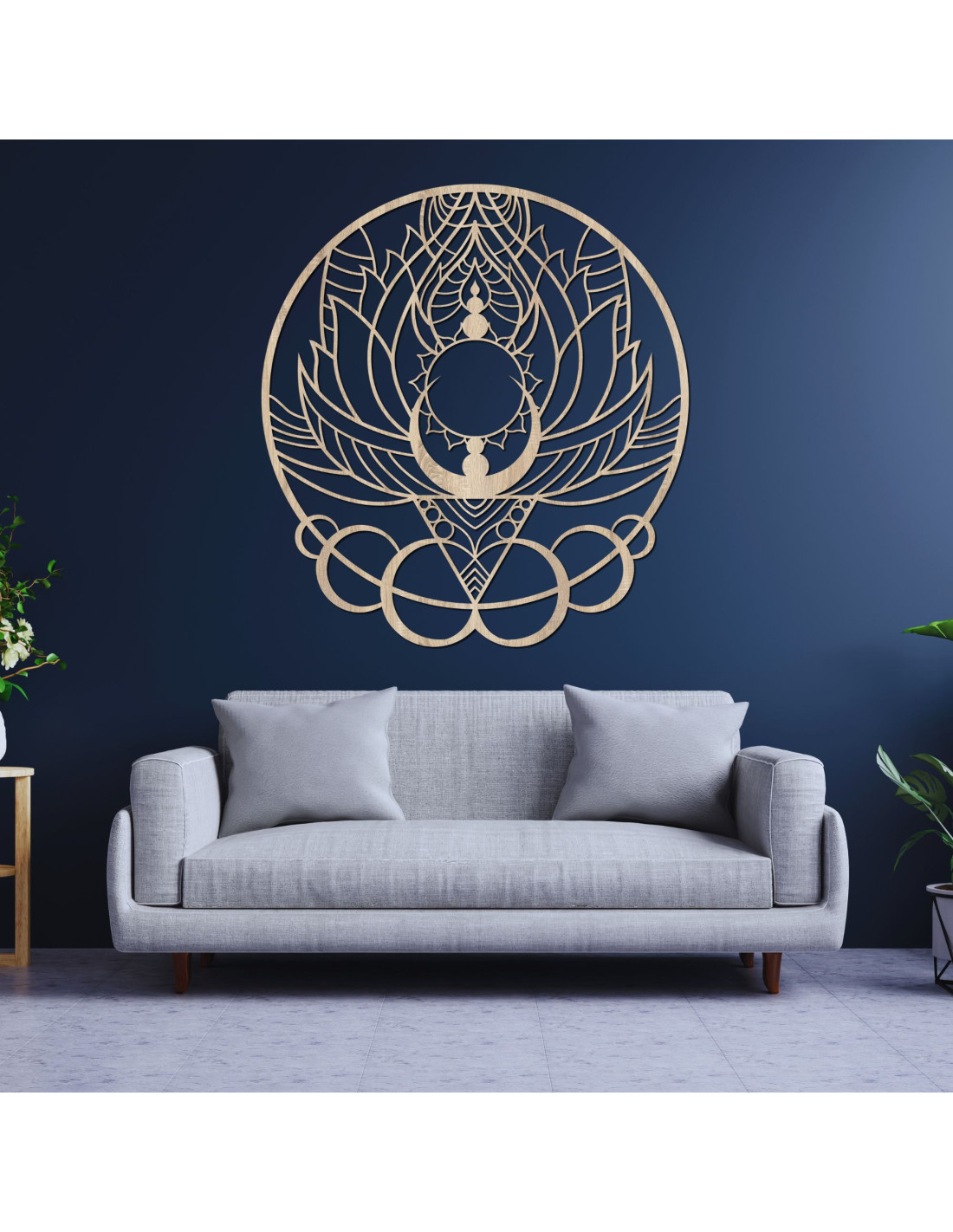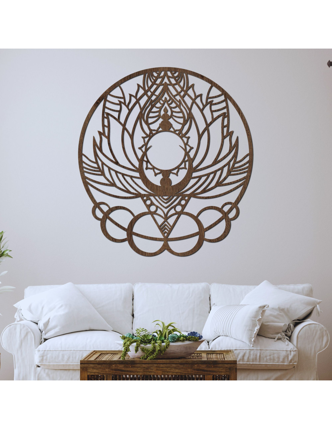 Artystyczna drewniana dekoracja mandala z kwiatem i słońcem | FLORISOLUS