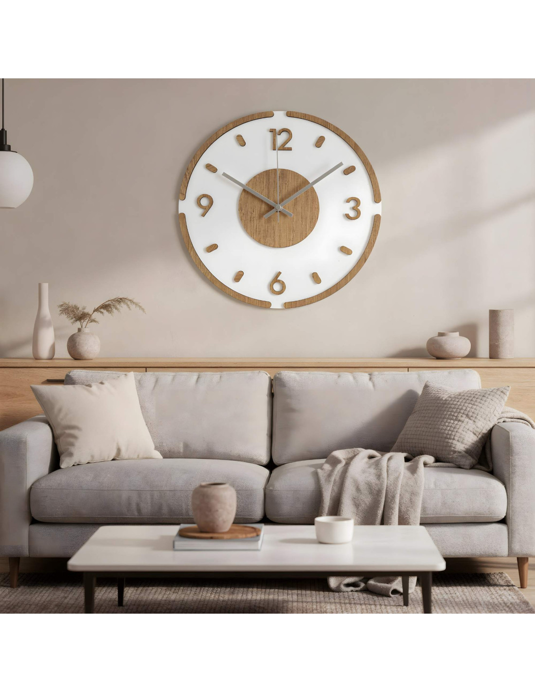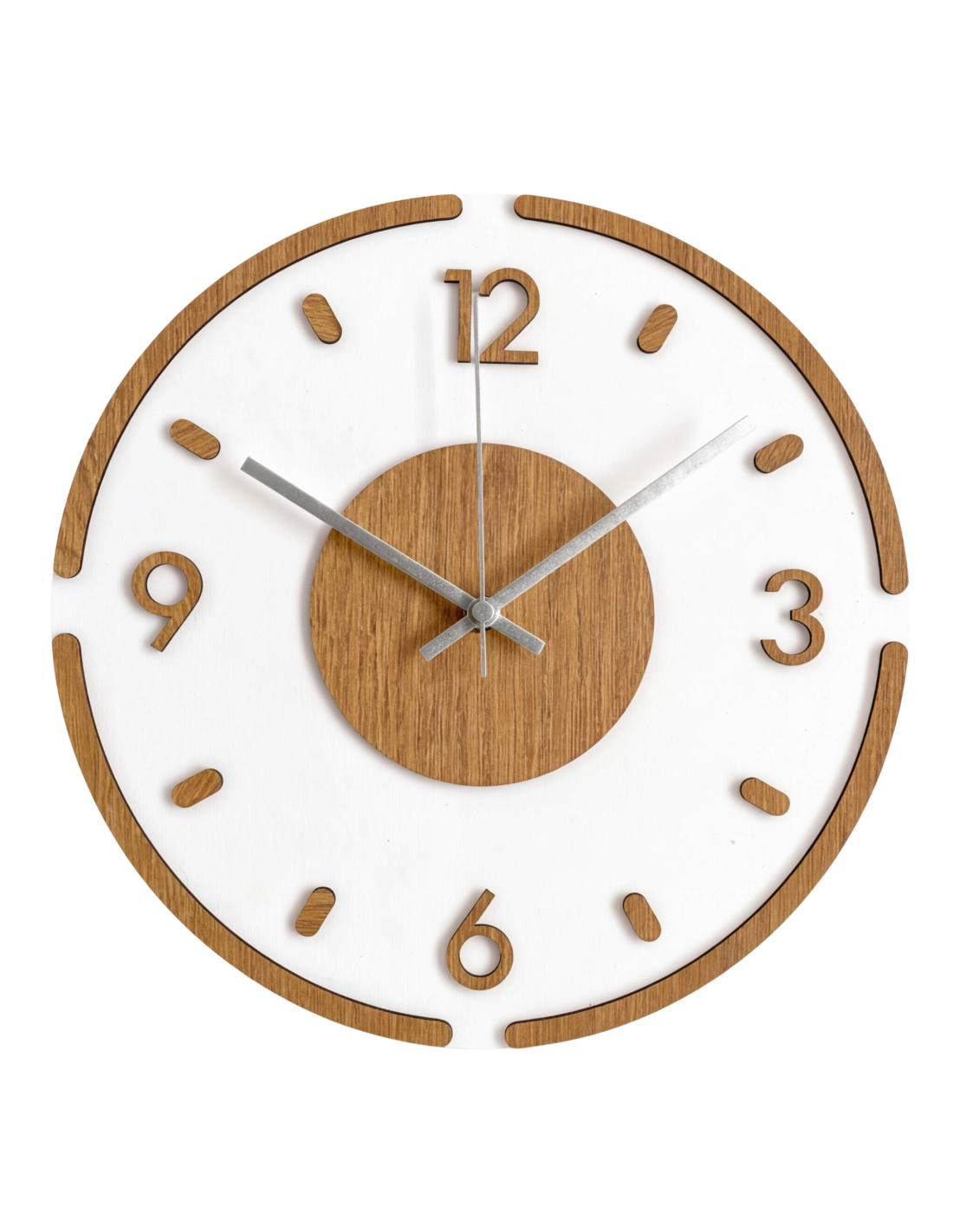 Nowoczesny okrągły zegar ścienny z dekoracją dębową i białym pleksiglasem .