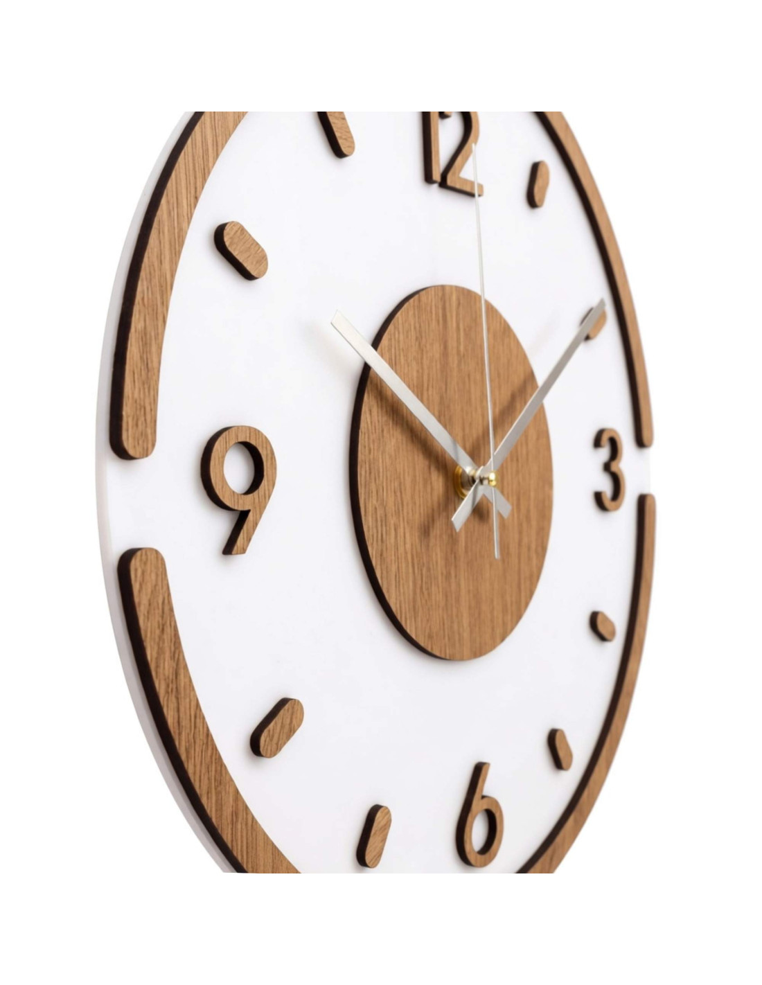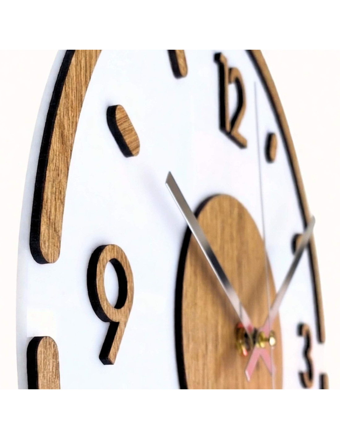 Zegar wykonany jest z wysokiej jakości płyty HDF o wzorze dębu połączonej z błyszczącą i elegancką białą pleksi.