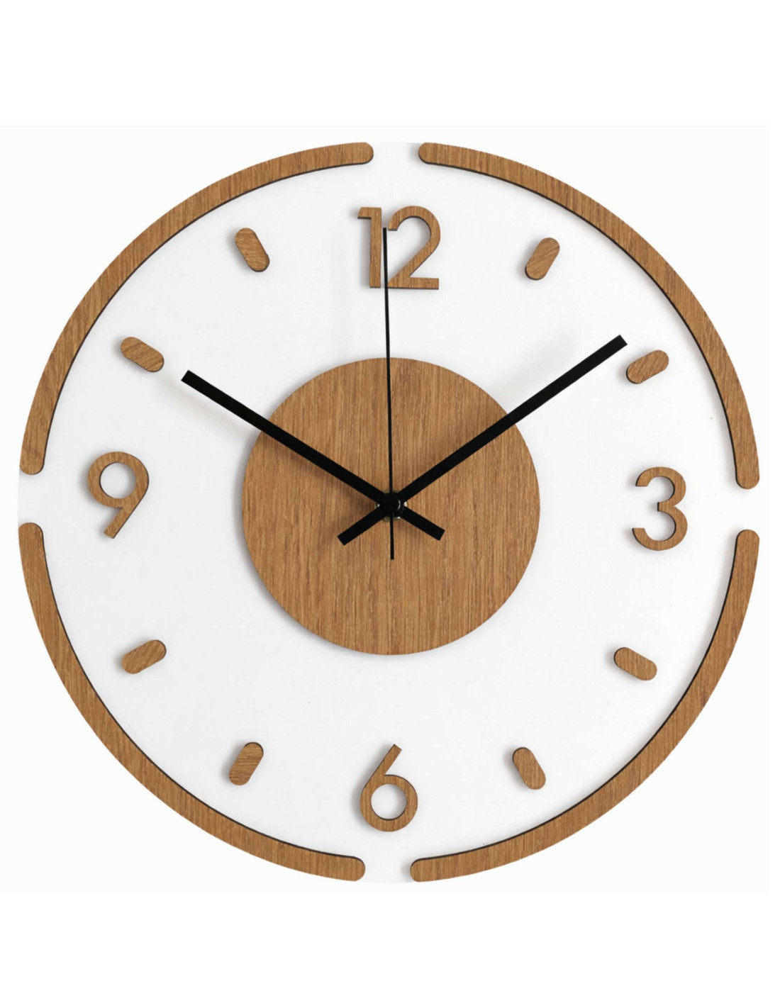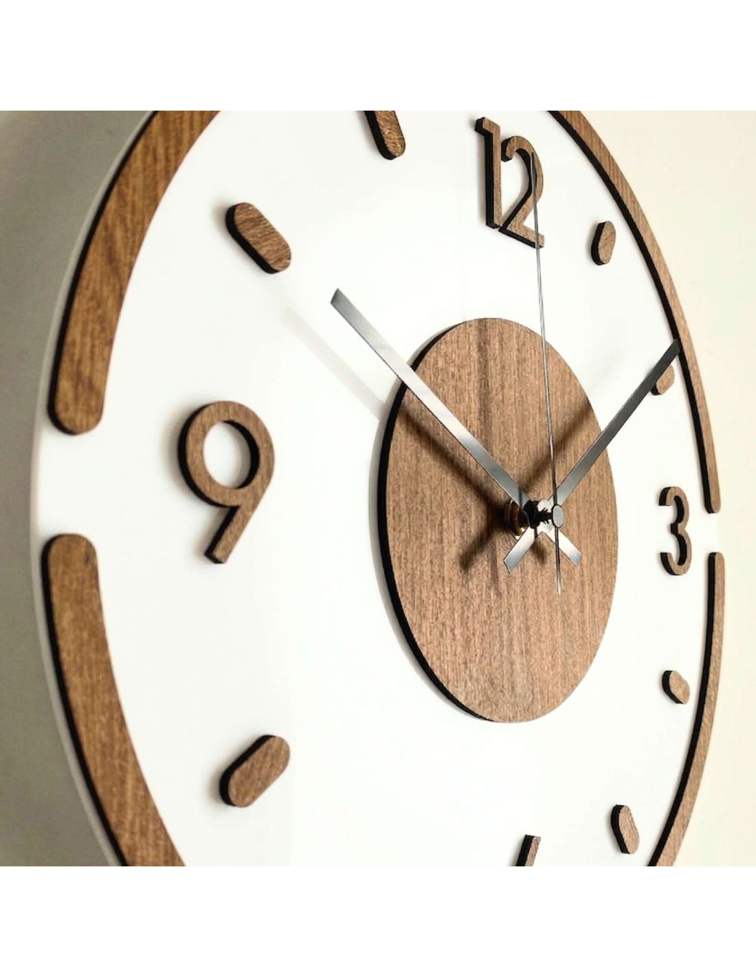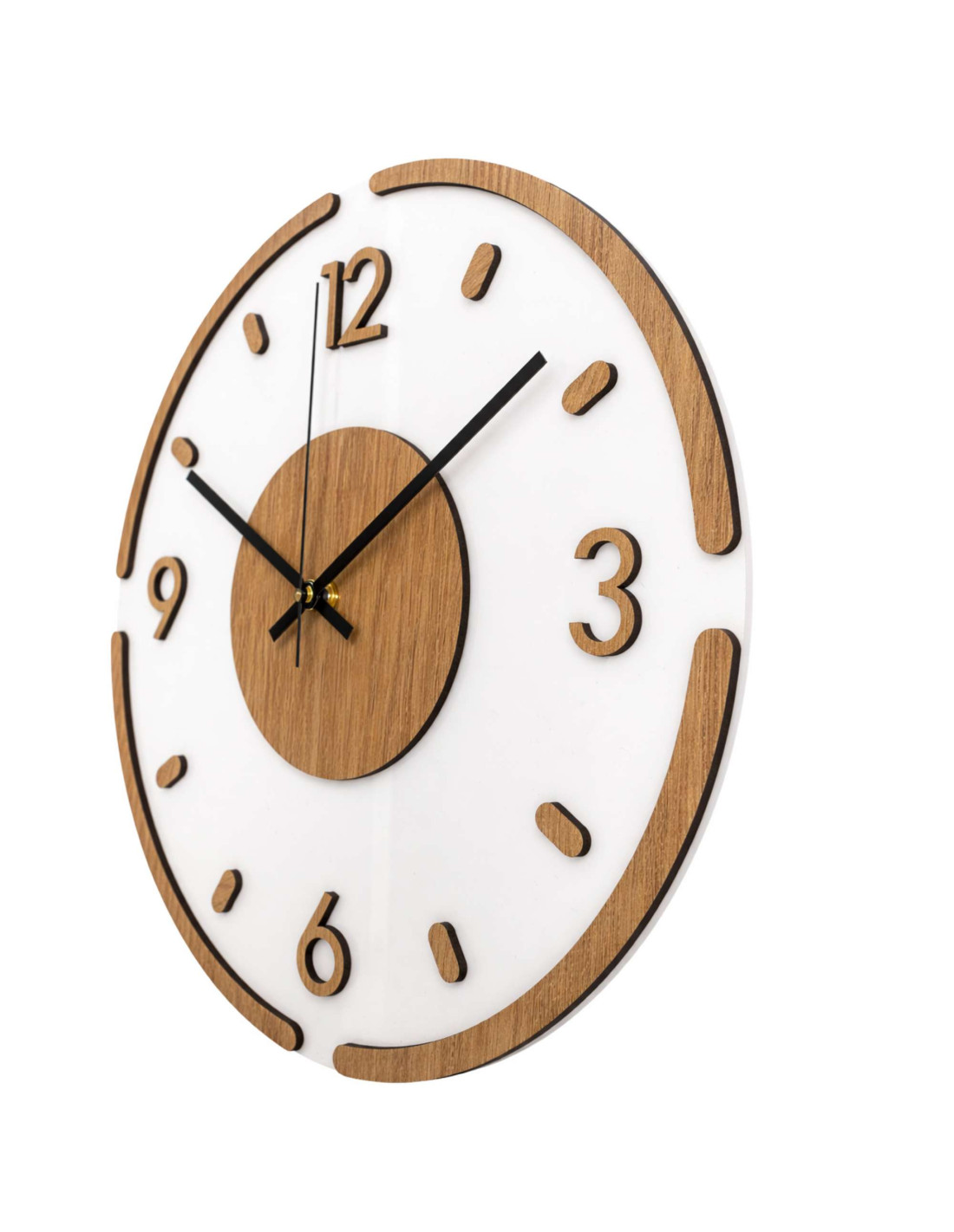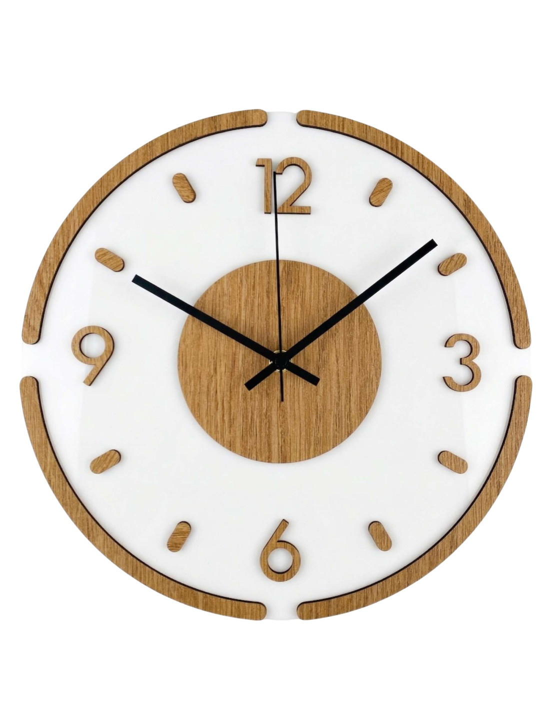 Nowoczesny okrągły zegar ścienny z dekoracją dębową i białym pleksiglasem .