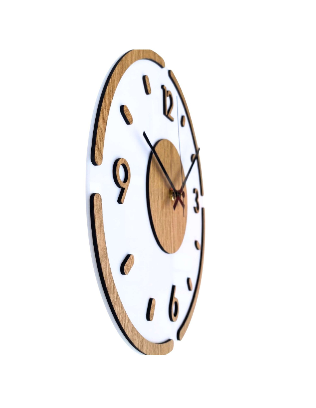 Zegar wykonany jest z wysokiej jakości płyty HDF o wzorze dębu połączonej z połyskującą i elegancką białą pleksi.