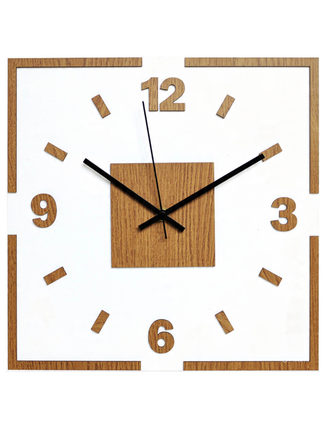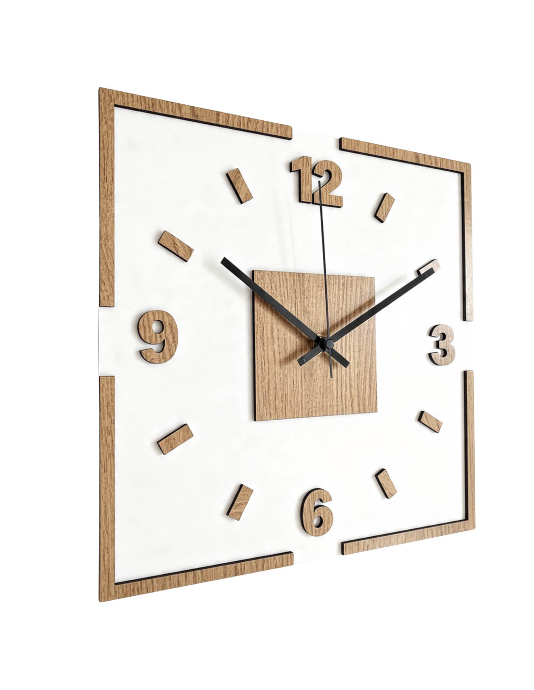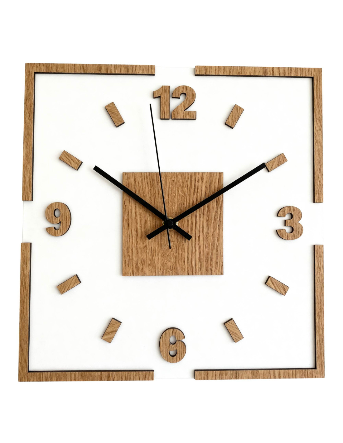 Nowoczesny kwadratowy zegar ścienny z dekorem dębowym i białym pleksiglasem .