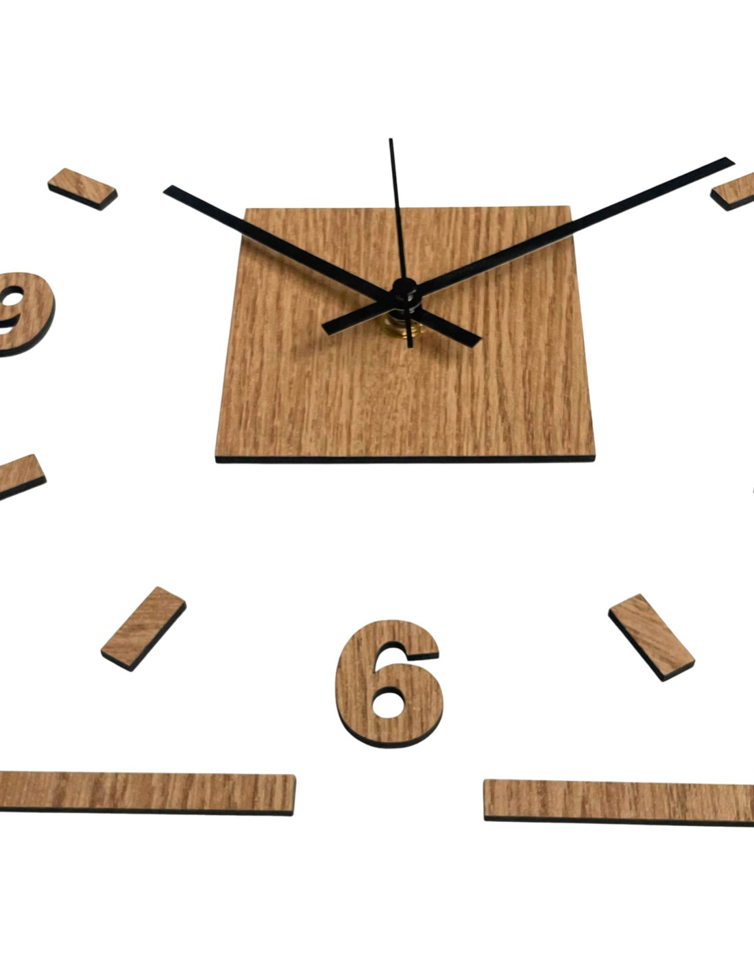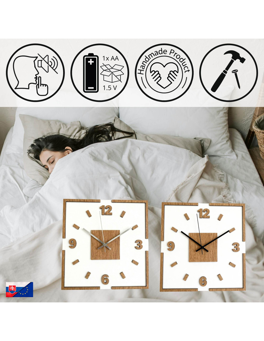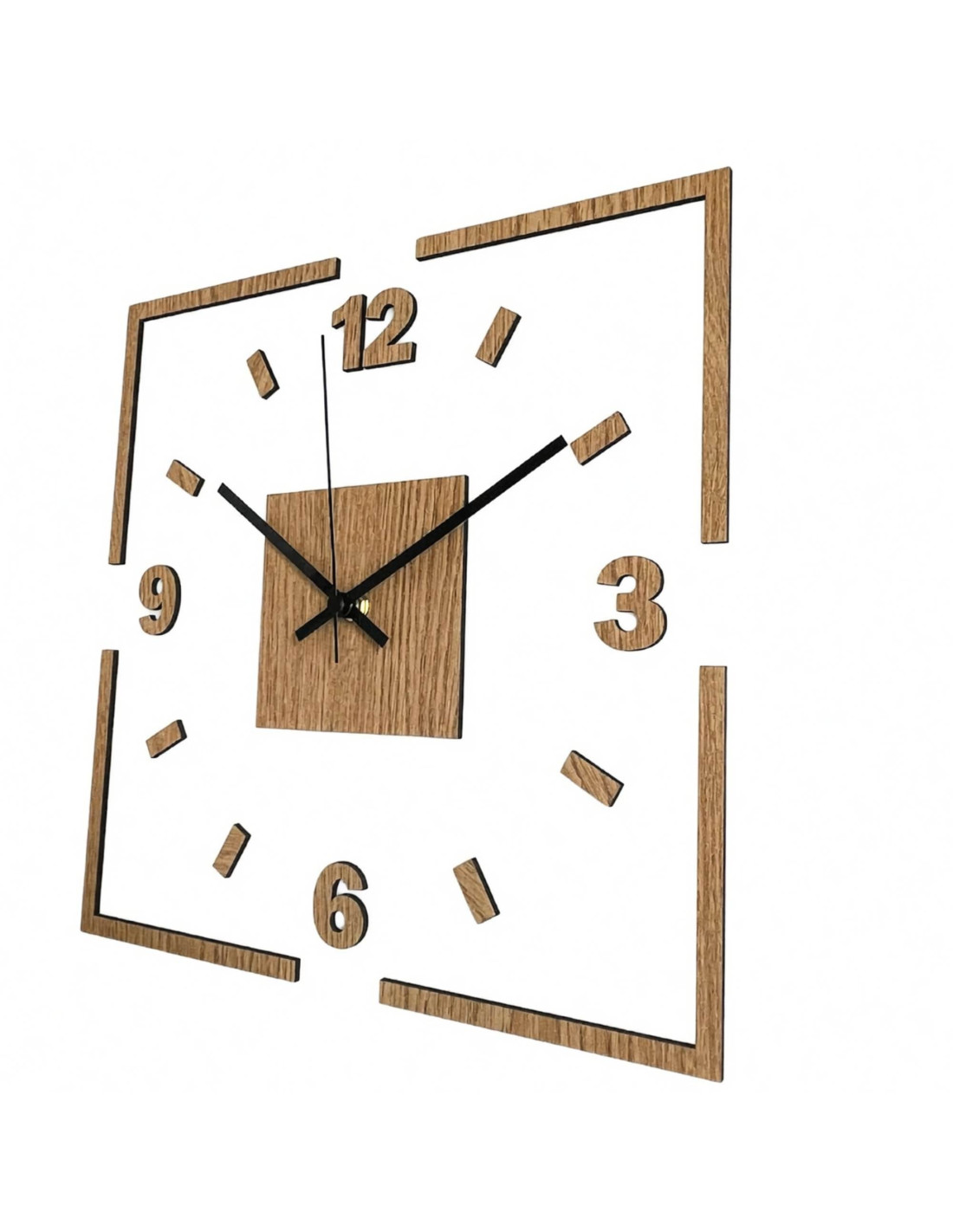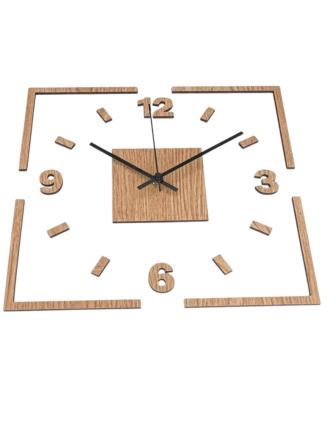 Centralną część zegara stanowi kwadratowy element dębowy, z którego wyłaniają się czarne lub srebrne wskazówki, zapewniające doskonały kontrast i czytelność.