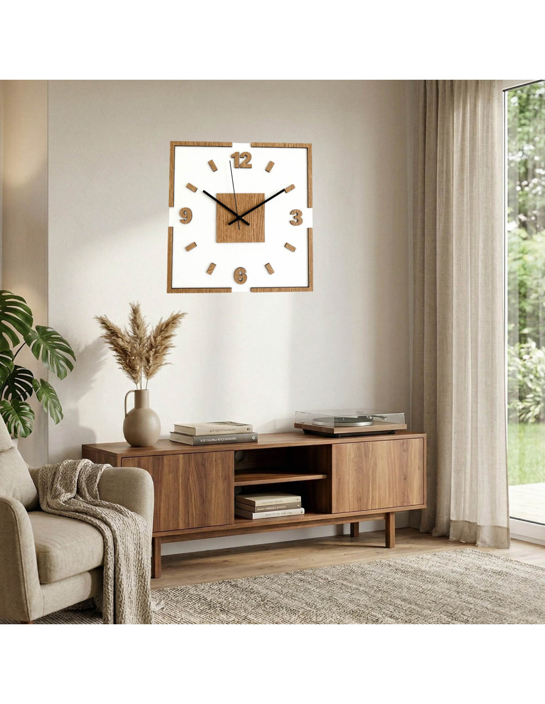 Nowoczesny kwadratowy zegar ścienny z dekoracją dębową i białym tłem