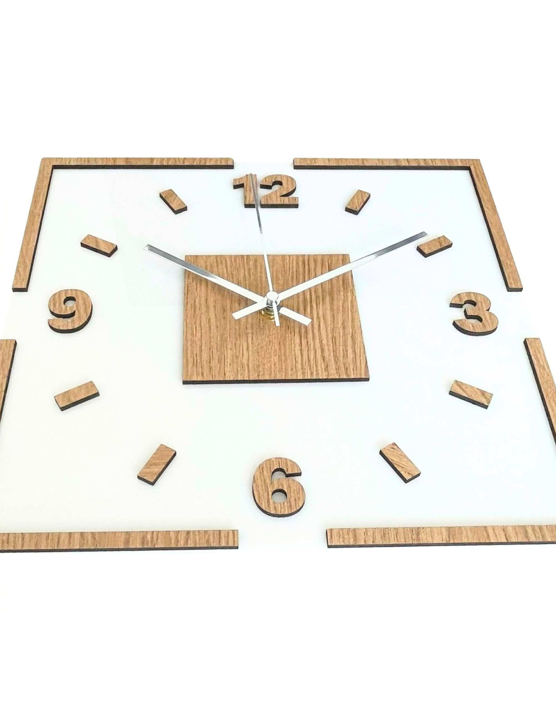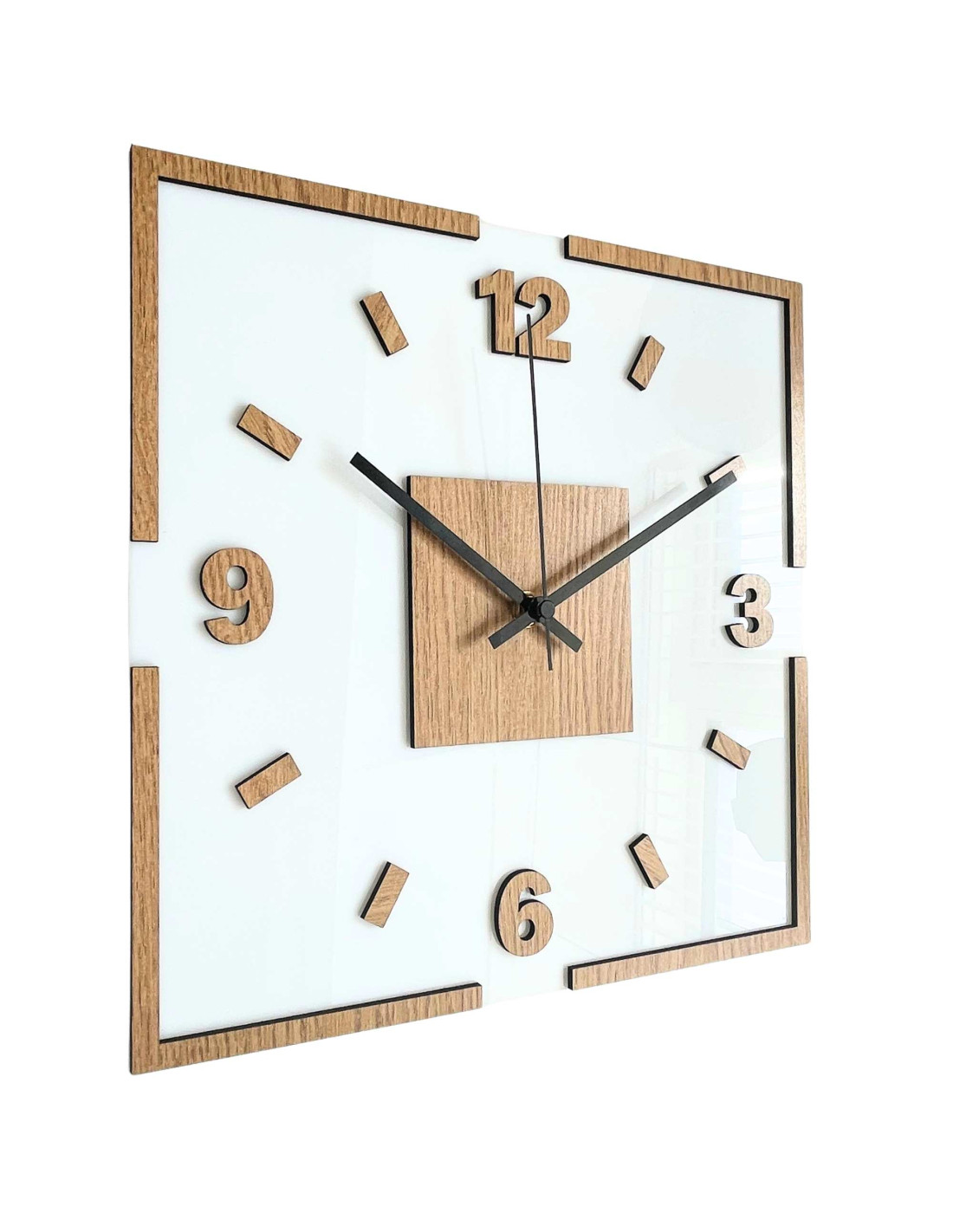 Nowoczesny kwadratowy zegar ścienny z dekorem dębowym i białym pleksiglasem .