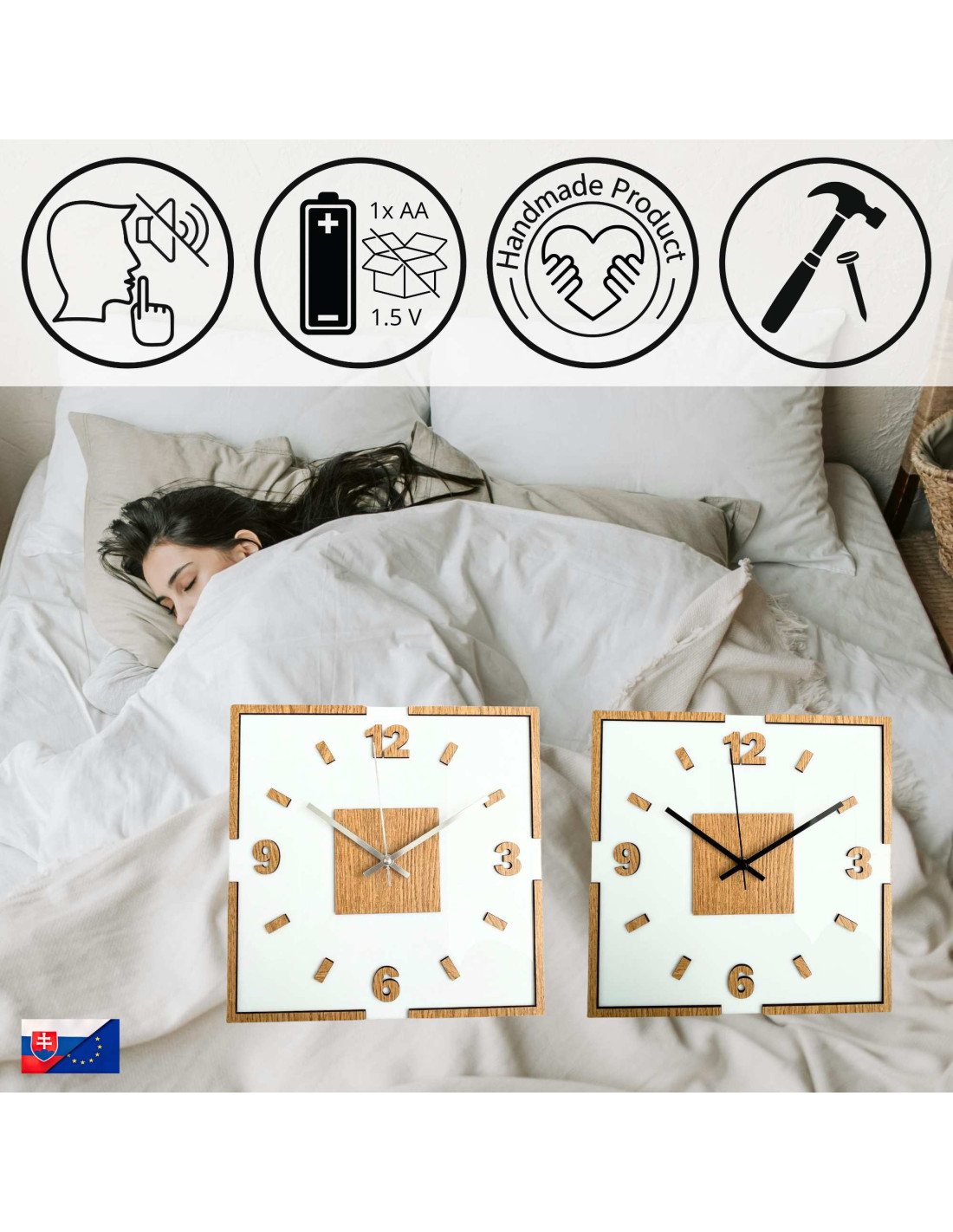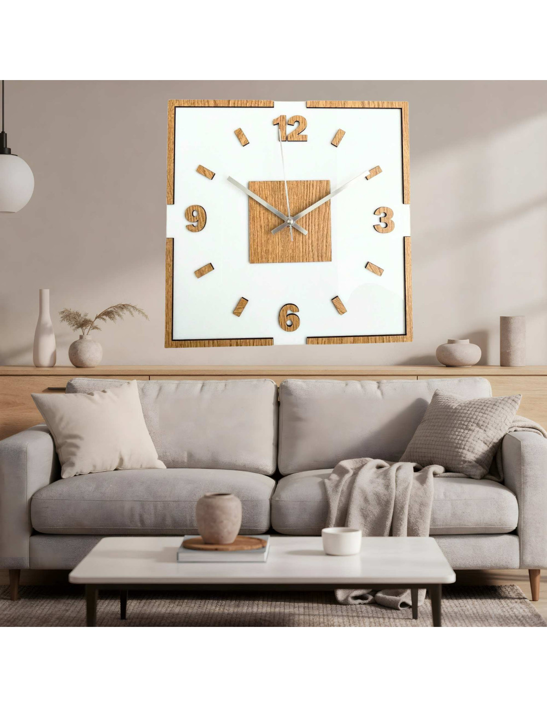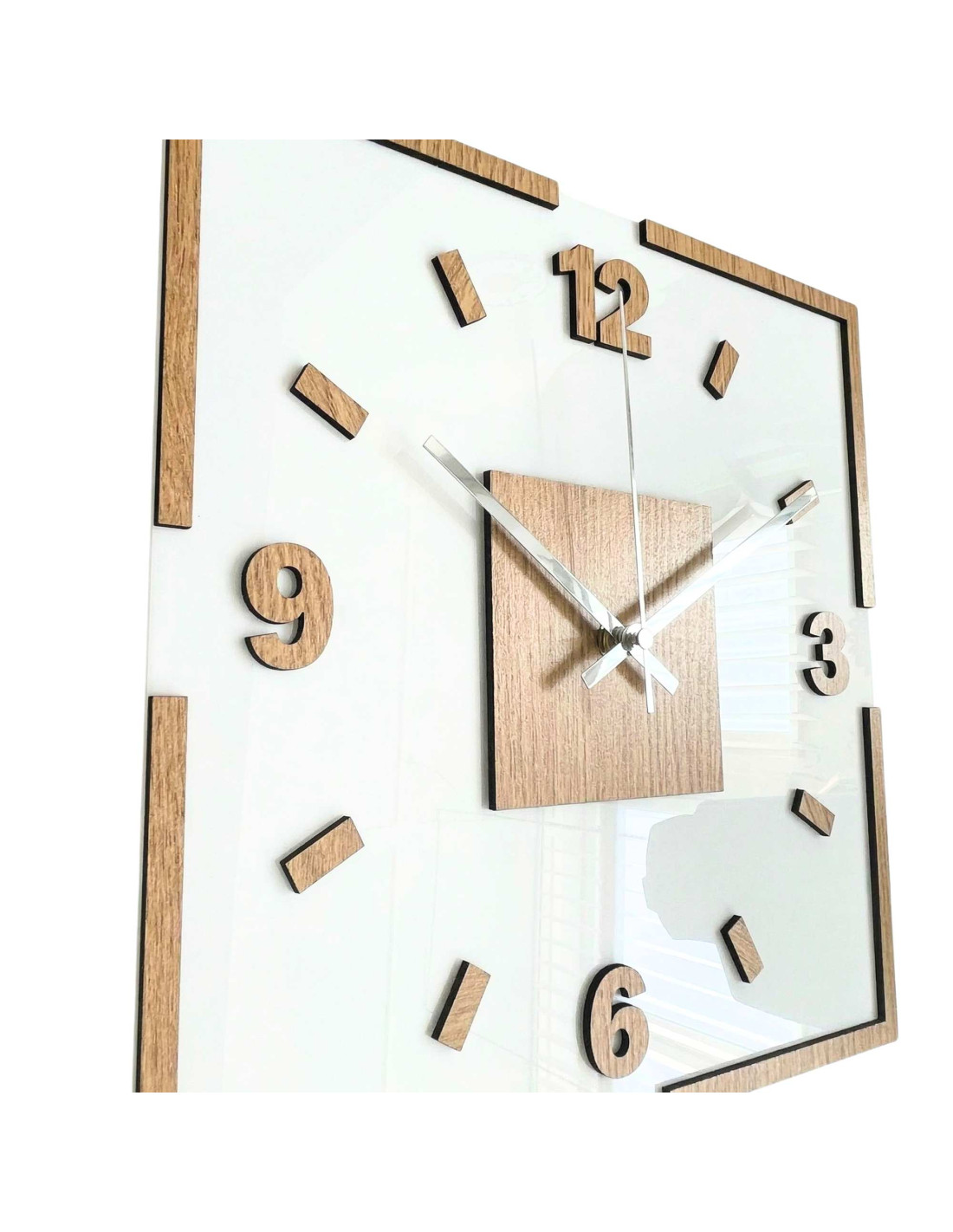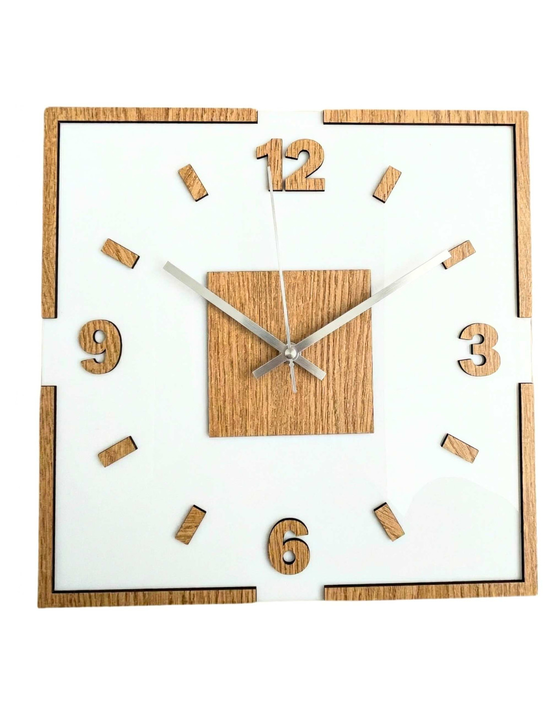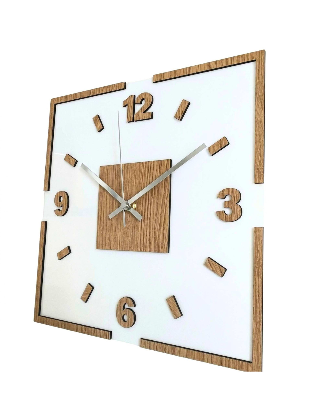 Centralną część zegara stanowi kwadratowy element dębowy, z którego wyłaniają się czarne lub srebrne wskazówki, zapewniające doskonały kontrast i czytelność.