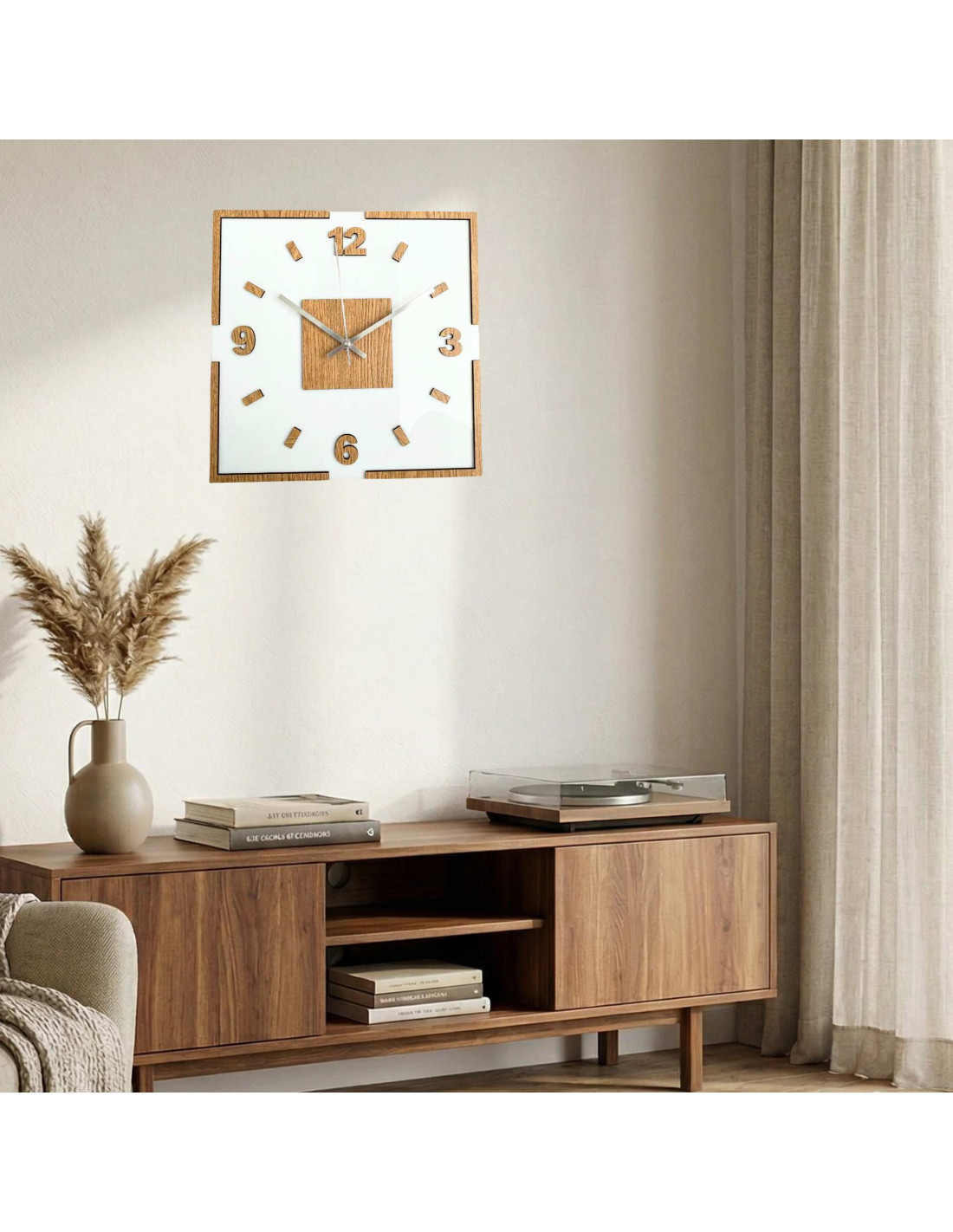 Nowoczesny kwadratowy zegar ścienny z dekoracją dębową i białym tłem
