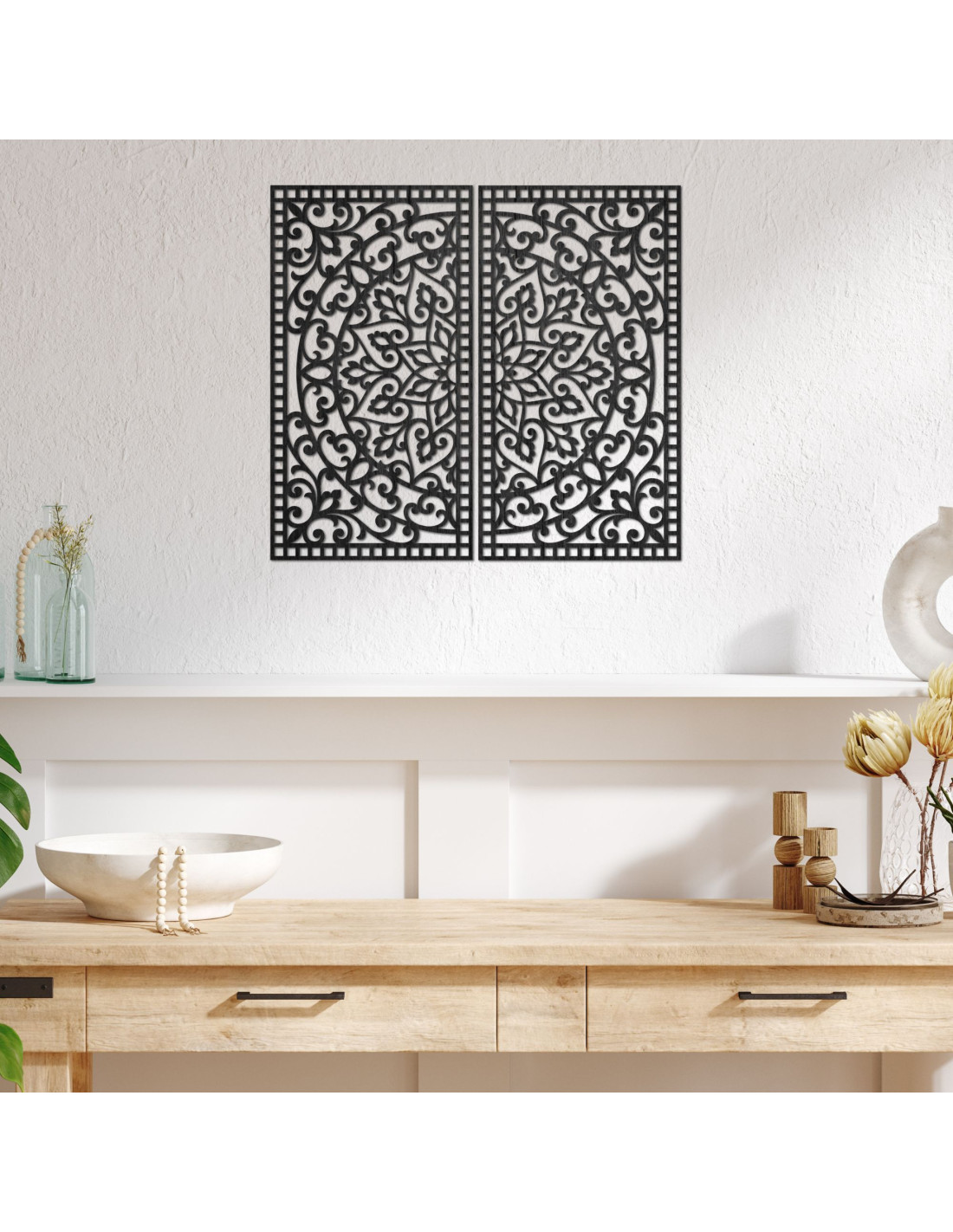 Drewniany obraz mandali, 2 elementy – Rzeźbiona dekoracja ścienna – FLOUFER