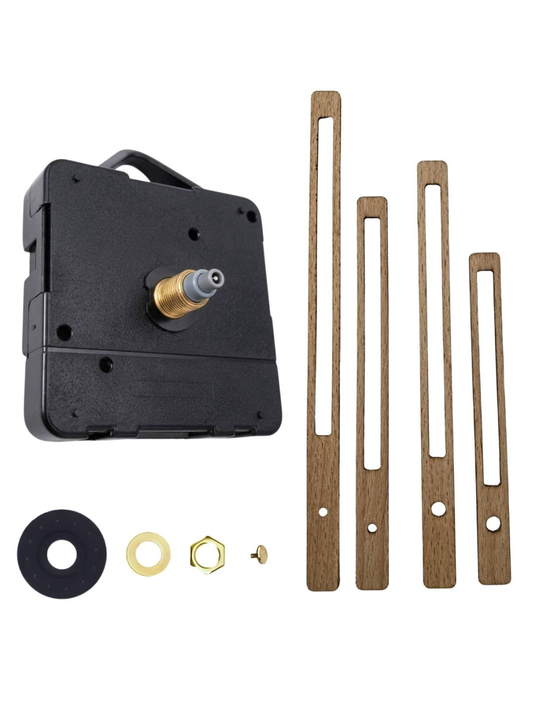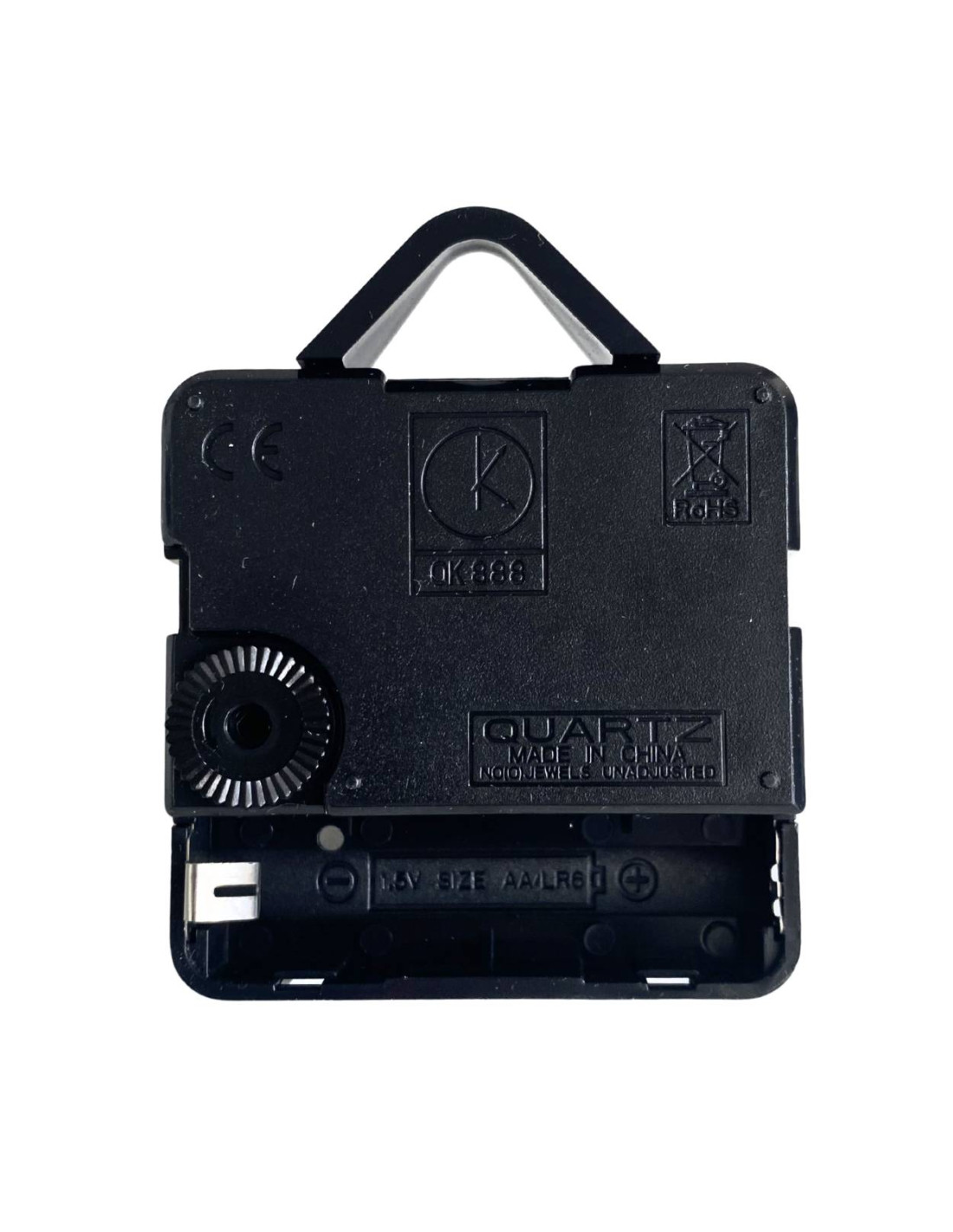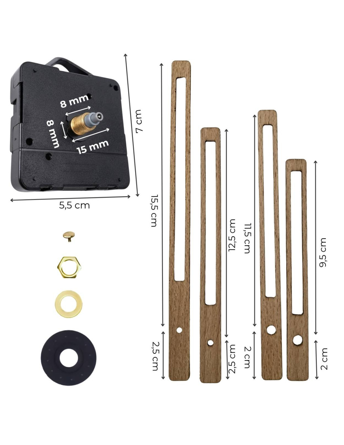 - Zawartość zestawu: podkładka gumowa, podkładka metalowa, nakrętka centralna, nakrętka zaślepiająca, mechanizm kwarcowy, wskazówki godzinowa i minutowa