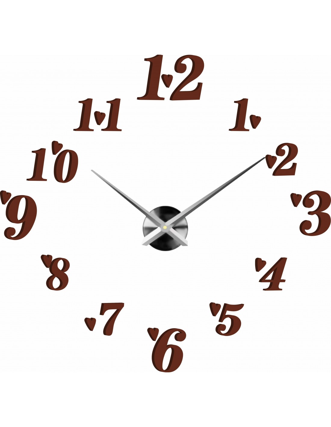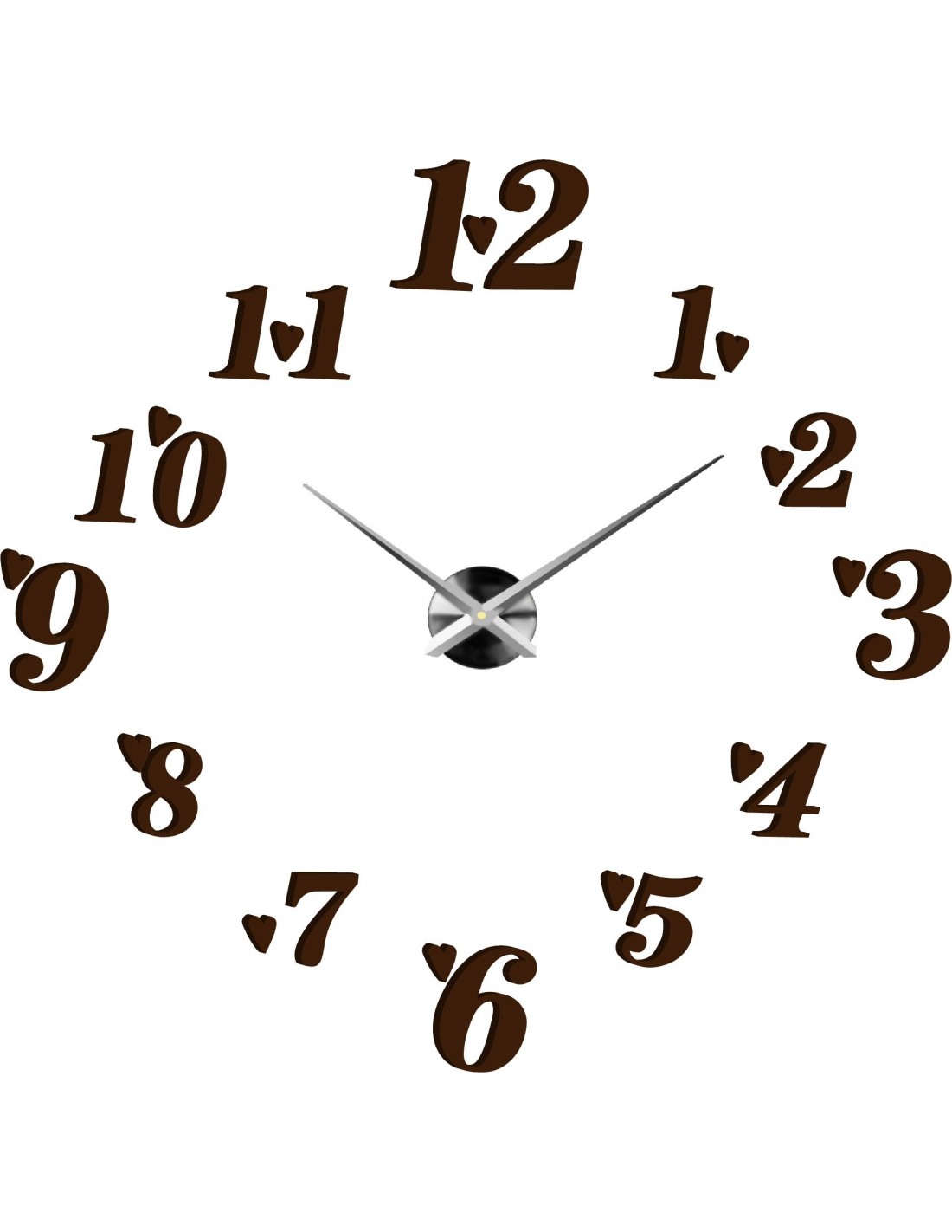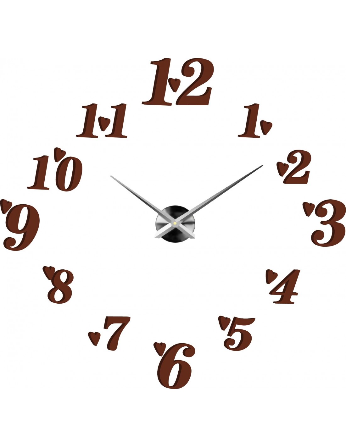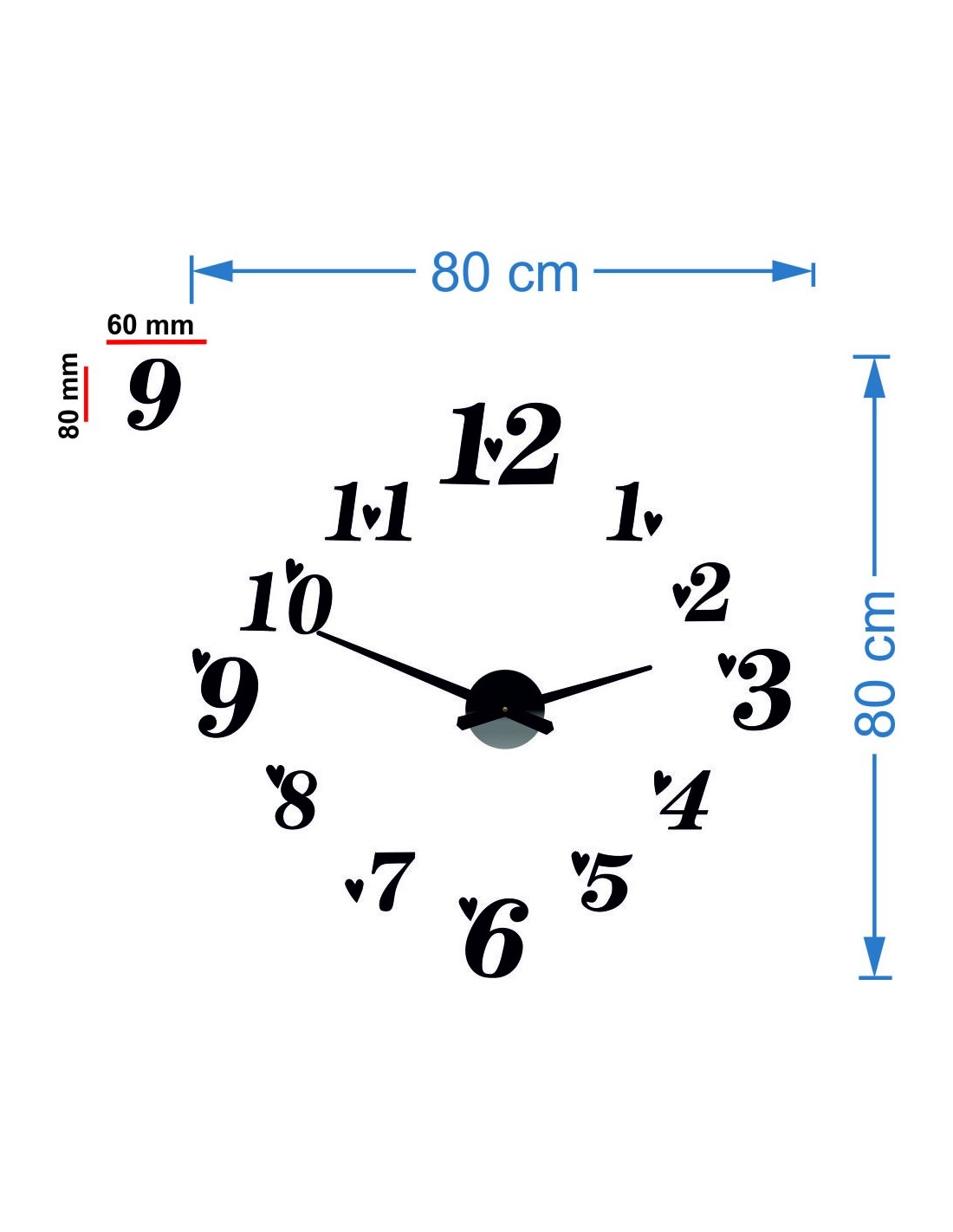 Wymiary naklejki co najmniej: 800 x 800 mm do 1300 x 1300 mm. Wymiary zegara: 100 x 100 mm Długość rączki: 30 - 40 cm.